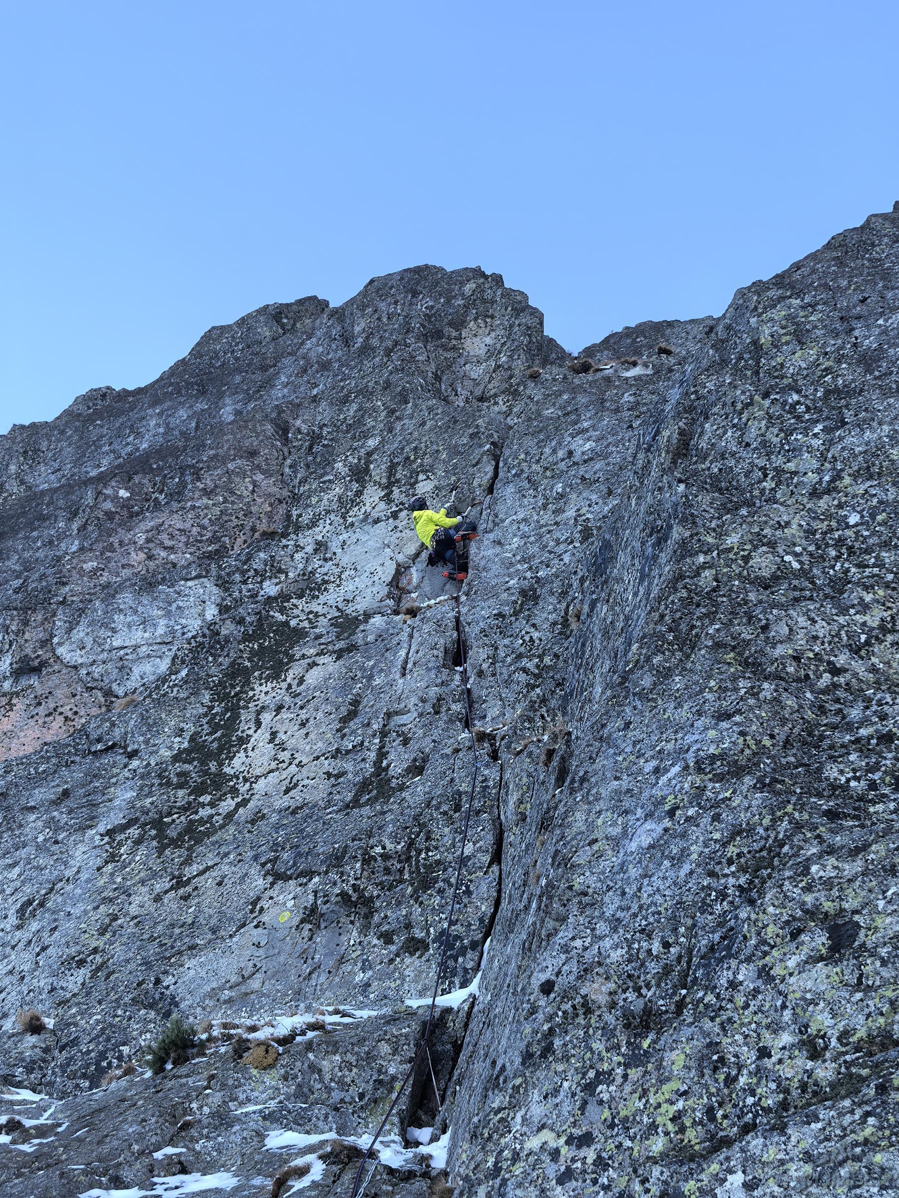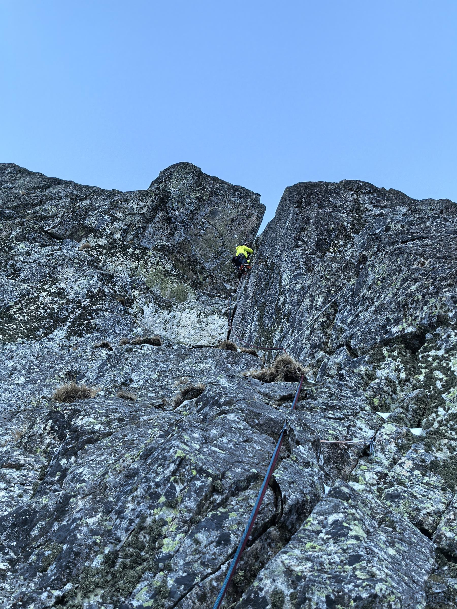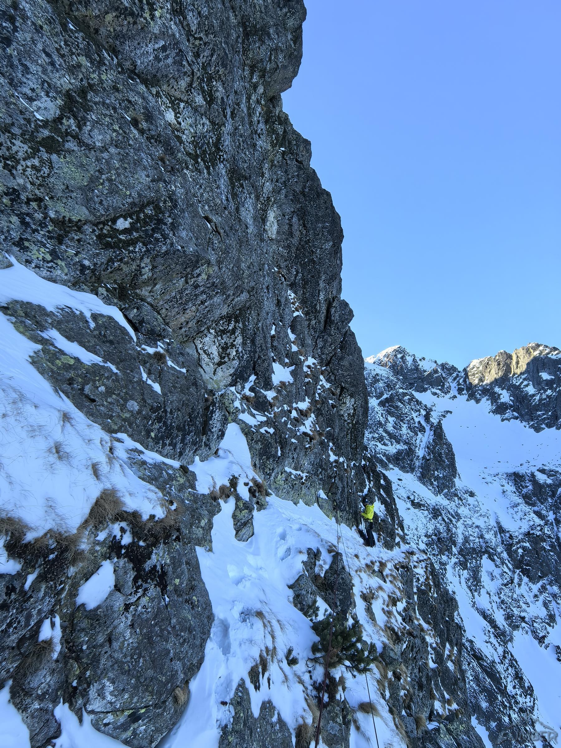 Po powrocie ze wspinania w ciepłym wapieniu na Sardynii ciężko przestawić się na tatrzańskie zimowe ściany, połowa stycznia to już jednak najwyższa pora 😊. Wraz Michałem i Szymonem wybieram się więc na weekend do Doliny Kieżmarskiej by schować się przed odwilżą w cieniu północnej ściany Małego Kieżmarskiego Szczytu, oferującej zaskakująco dobre warunki. Pierwszego dnia towarzyszę rozwspinanym już kolegom na drodze Elegancia (M7) na Wielkiej Złotej Kazalnicy. Oferuje ona całkiem sporo ładnego i zajmującego wspinania – po najbardziej wymagającym i ciągowym pierwszym wyciągu do przejścia mamy jeszcze dwa mocne, czysto drytoolowe odcinki oraz kilka łatwiejszych o mikstowym charakterze.