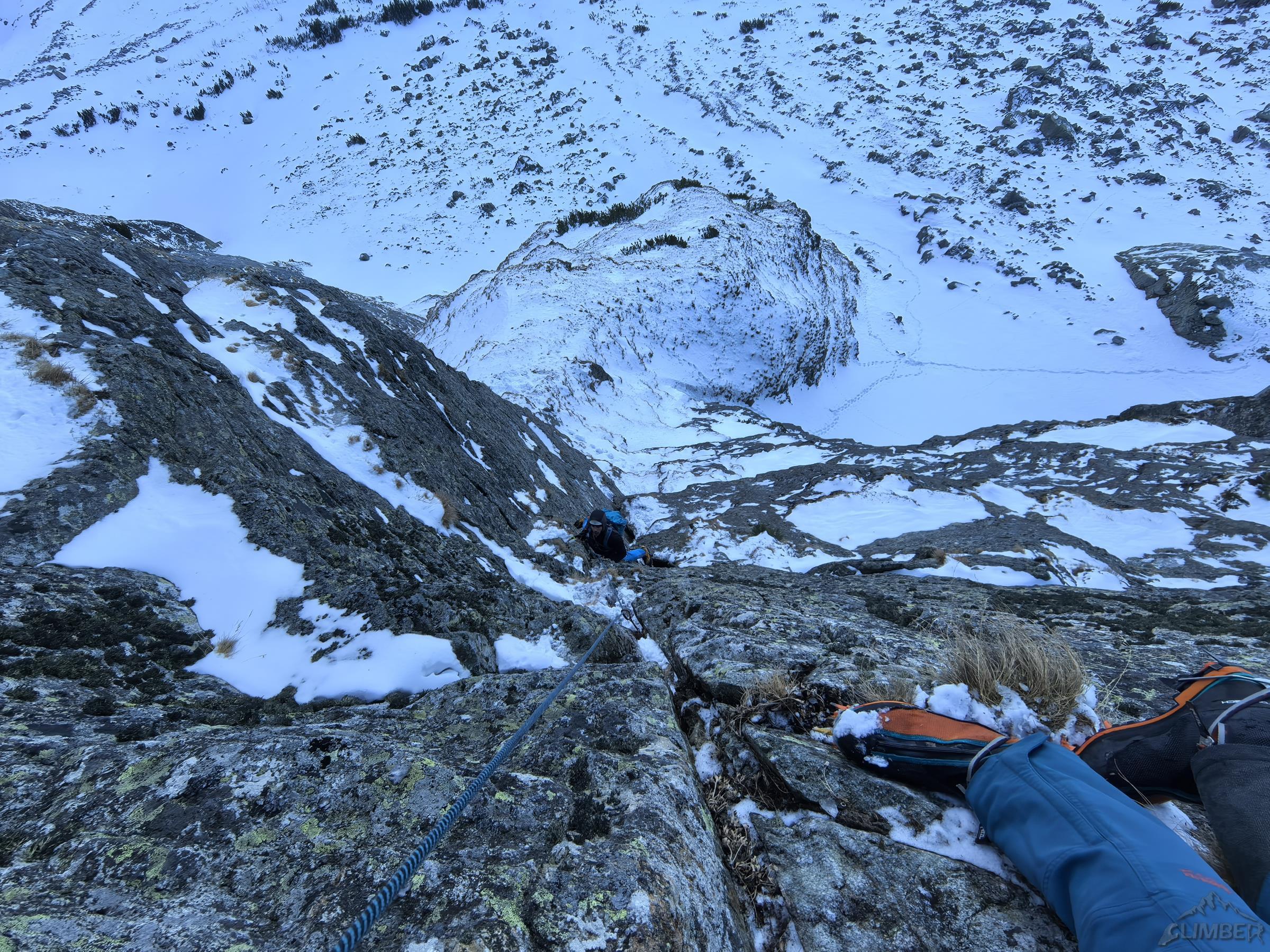 Drugi odcinek startuje ładnym kominkiem (M4+), po którym idziemy śniegiem pod kolejny uskok. Na początku wyciągu trzeciego czeka gładkie zacięcie (M5), z którego przewijamy się w prawo i trawersujemy półką do jej skraju. Kolejny odcinek (M6+) to bardzo ładne wspinanie wzdłuż zacięcia zakończonego przewieszką – przewijamy się tuż pod nim i wychodzimy na wygodną półkę. Wyciąg piąty startuje wymagającym (M6) zacięciem o dość nikłej rzeźbie, po jego pokonaniu idziemy łatwo do góry i w prawo, pokonujemy krótki uskok (M5) i zatrzymujemy się w dogodnym miejscu. Z tego miejsca czeka nas około 140 metrów wspinania wzdłuż wyraźnej trawiasto-skalnej depresji biegnącej skośnie w prawo, czekają nas miejsca za M3-M4 więc jeżeli nie mamy idealnych warunków warto zrobić to na sztywno – na dwa długie wyciągi i jeden krótki, doprowadzający łatwo już do stanowiska zjazdowego (pętle z mailonem) na grani. My zjechaliśmy ok. 30m do kolejnego napotkanego stanowiska, z którego brakowało nam do żlebu (niski poziom śniegu) kilka metrów, dlatego wykorzystaliśmy stan z dobrych haków po ok. 50m (wyżej są kiepski) – dzięki temu nie trzeba było schodzić stromym zboczem.