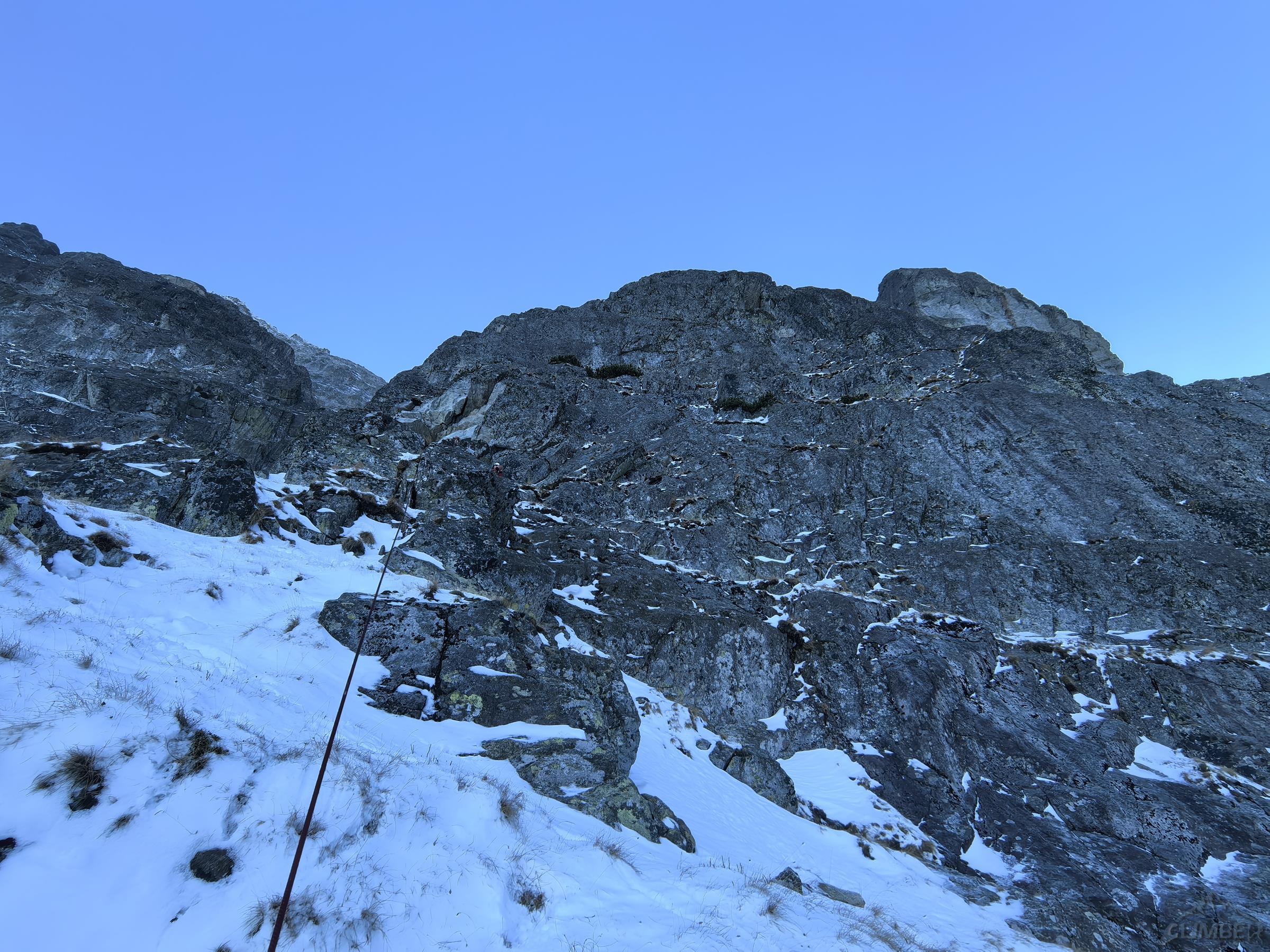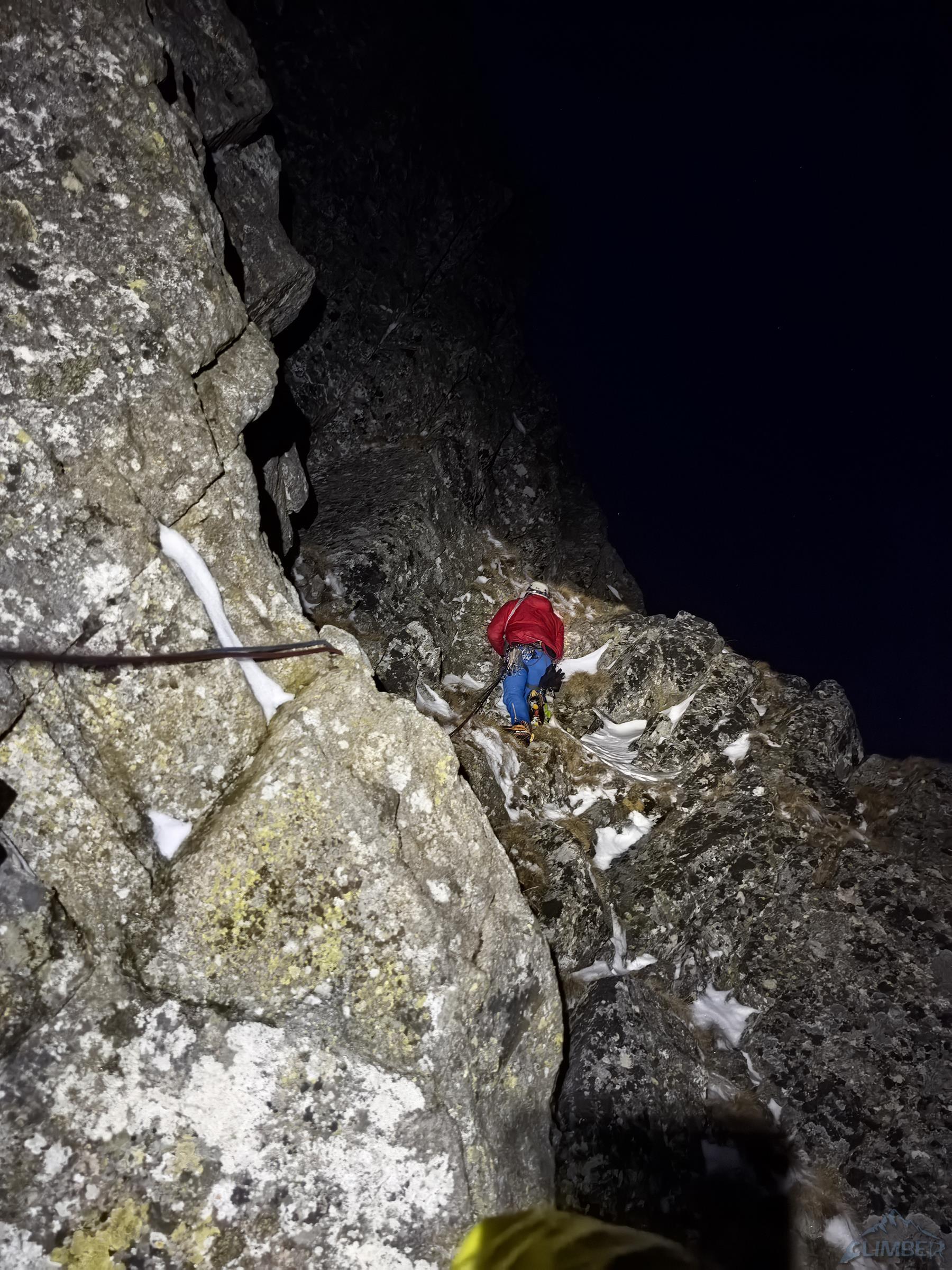 Elegancia startuje w ewidentnym miejscu – zatrzymujemy się na początku wielkiego śnieżno-trawiastego zachodu, którym biegnie Droga Żuławskiego (jej opis TUTAJ) i naszym oczom ukazuje się ciąg rys biegnących pionowo do góry. Pokonujemy nyżę u podstawy ściany i kontynuujemy w dość wyrównanych trudnościach ok. M6 do szerokiego, obłego pęknięcia (M7) pod którym znajduje się jedyny na tym wyciągu stały hak (przydają się zdublowane średnie i duże friendy). Kluczowe miejsce jest techniczne i nieco loteryjne – łatwo z niego wypaść, o czym przekonuje się Michał podczas pierwszej próby. Na szczęście po powrocie na ziemię i przewiązaniu się drugie podejście jest już skuteczne – z powodu późnej pory o której wystartowaliśmy nie podjęlibyśmy kolejnej próby. Po pokonaniu cruxa czeka jeszcze kilka czujnych metrów i wychodzimy na wygodną półkę, gdzie trzeba zbudować własne stanowisko.
