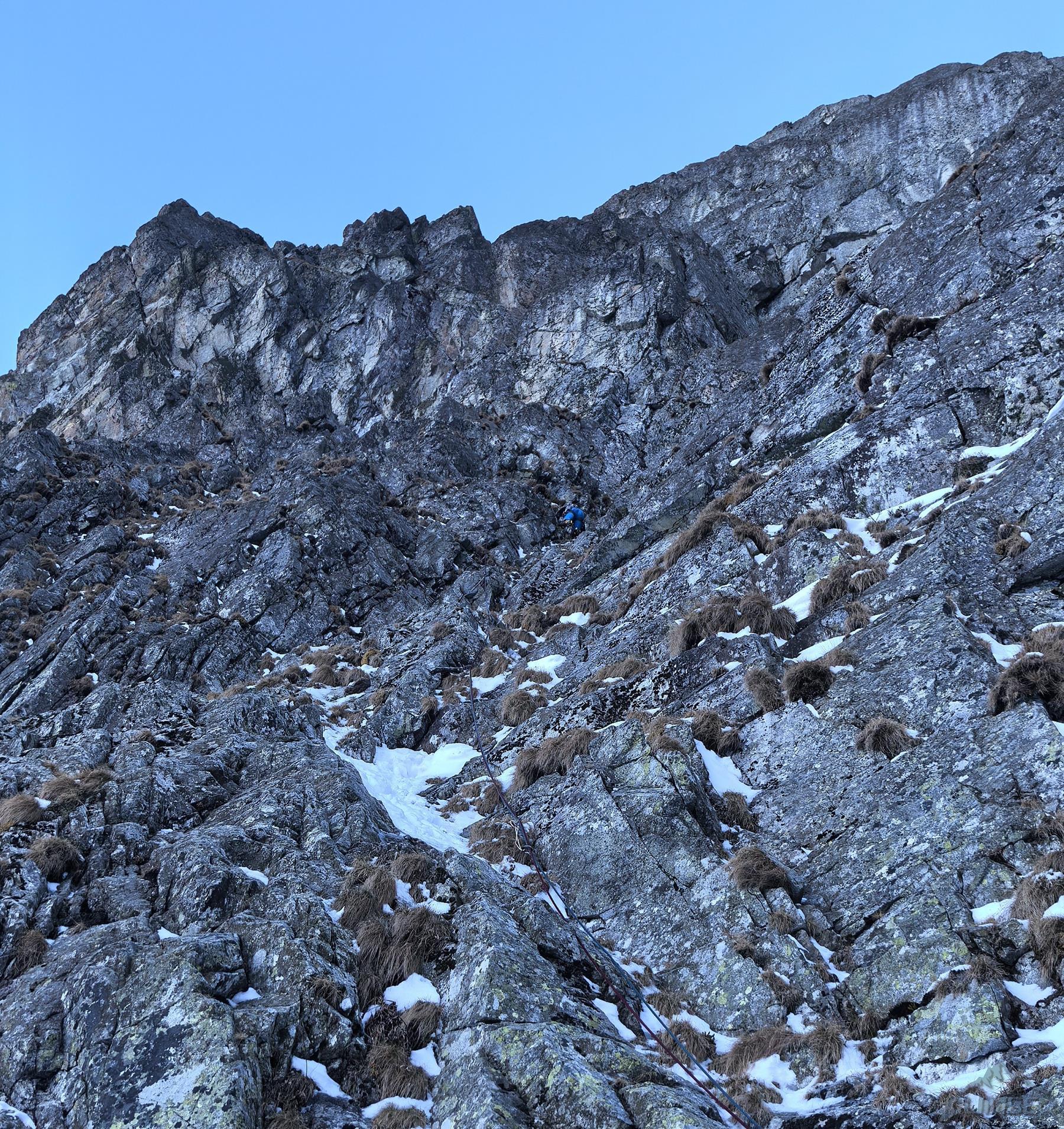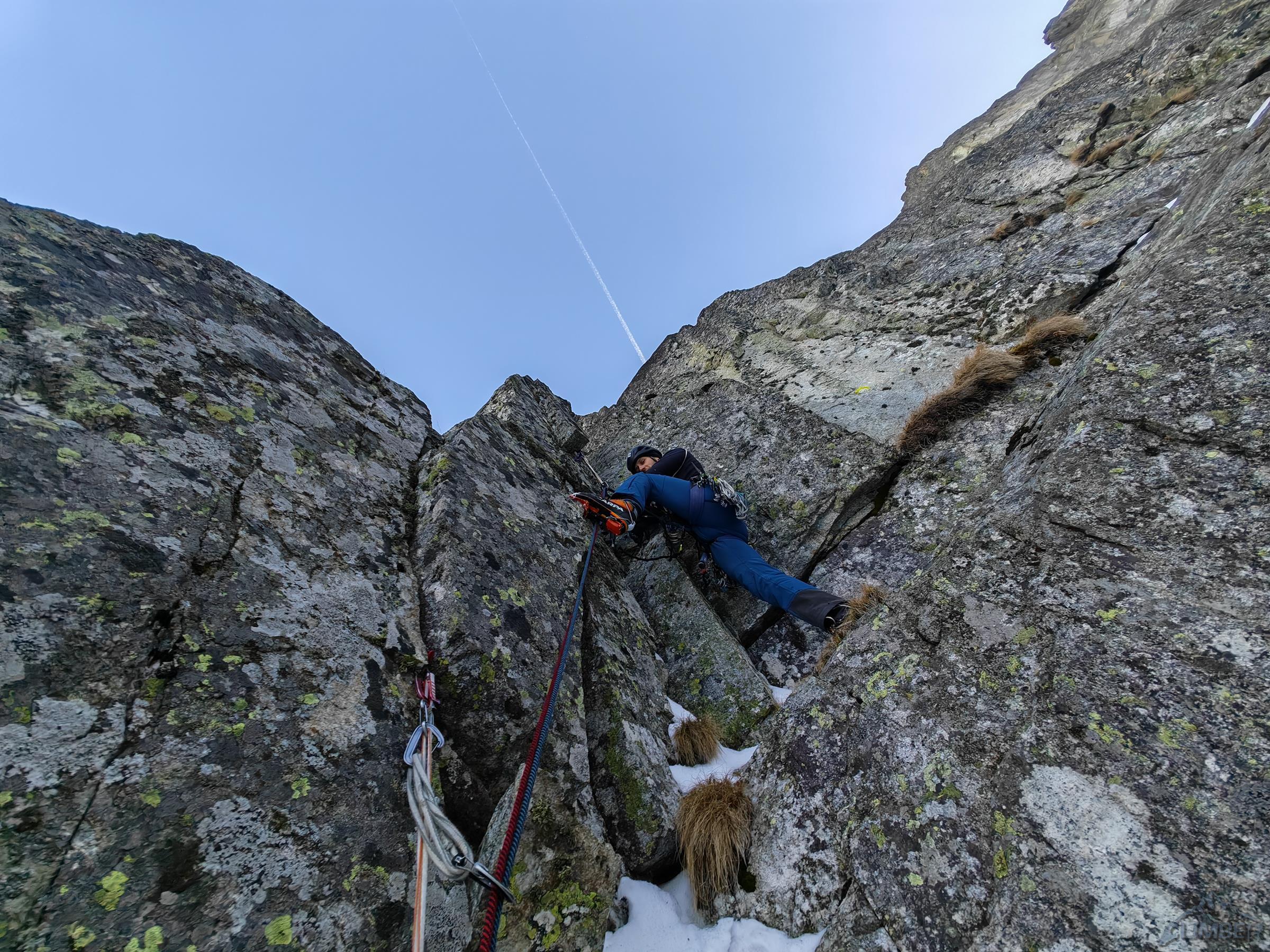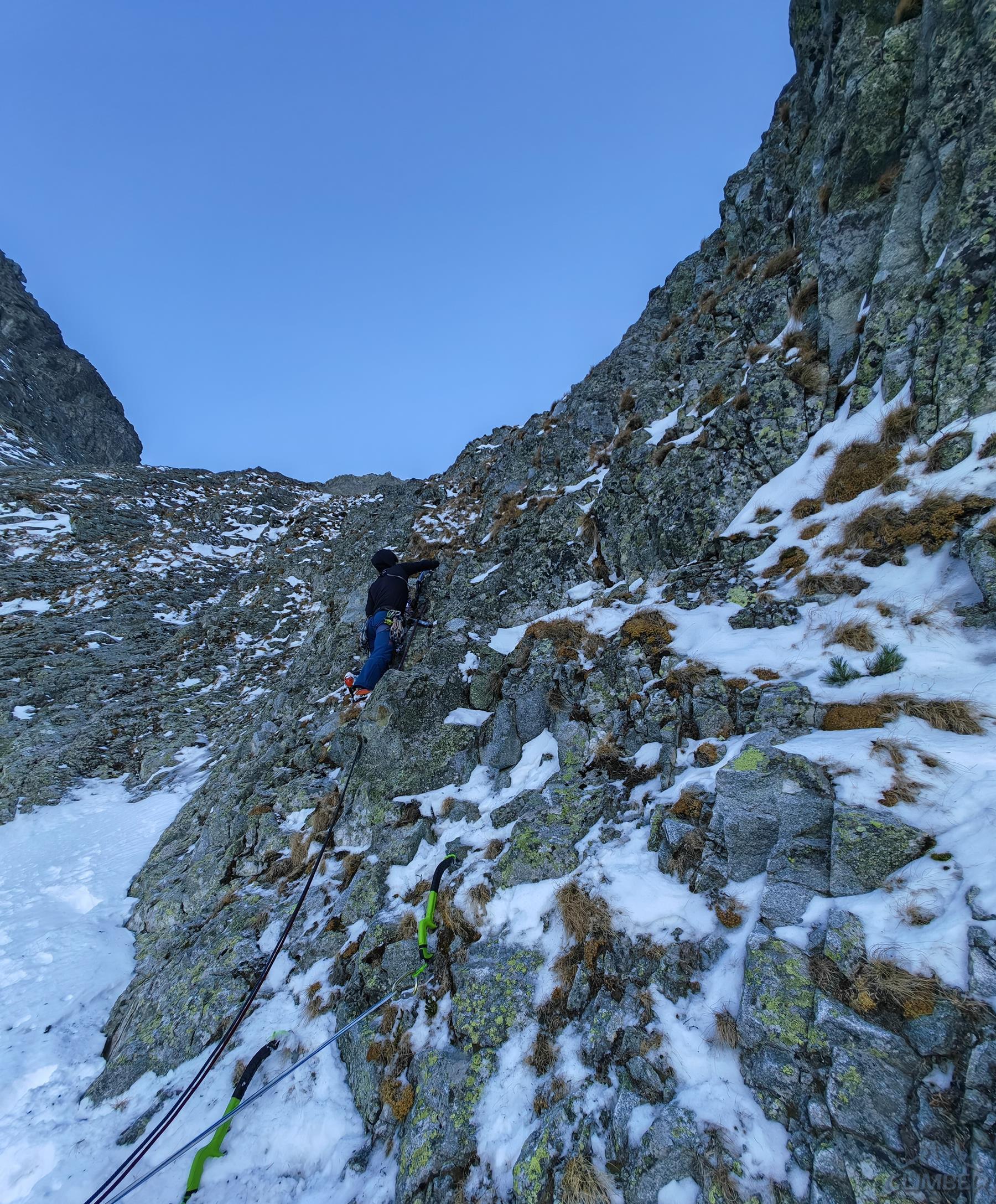 Piękne zacięcie przypada w prowadzeniu Michałowi – ze stanowiska (własnego) na półce ruszamy wprost do góry, pokonujemy kolejne lite metry z doskonałą asekuracją (ok. M5) i po dojściu pod odcinający dalszą drogę okap przechodzimy pod nim w lewo (wg topo M6 ale raczej max M6-) i przewijamy się na taras. Z niego warto podejść jeszcze kilka metrów do góry (M4+) na półkę pod wąskim tunelem skalnym. Kolejny wyciąg zaczynamy od pokonania tego miejsca (M4), po czym kierujemy się skośnie w lewo wyraźną załupą (M3) pod żółtą ściankę, gdzie w prawo odbija wariant oryginalny, obecnie rzadko raczej uczęszczany – sugerując się topo z przewodnika po wybranych drogach na Słowacji (pod red. Kuby/Richarda/Wadima) kontynuuję rampą do małego kominka (M4). Warto pokonać go w ciągu i po wyjściu na pole śnieżne zatrzymać się pod ostatnią przeszkodą czyli trawiastą ścianką. Odcinek ten choć łatwy (M4) wymaga wzmożonej czujności i asekuracji z haków i sprzętu do trawy – po jego pokonaniu pokonujemy jeszcze krótki uskok z dużymi blokami i wychodzimy na taras nad Kieżmarską Bulą.