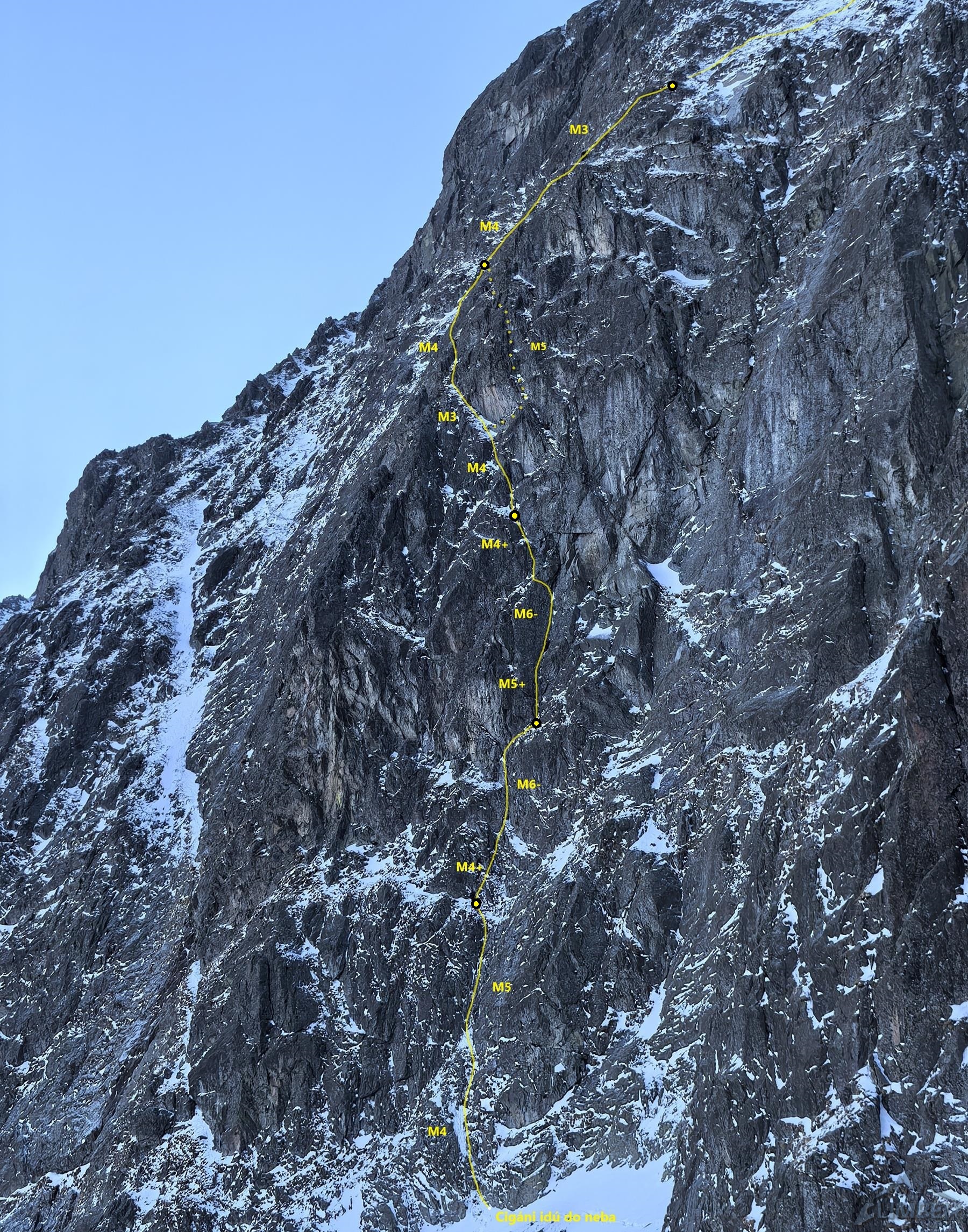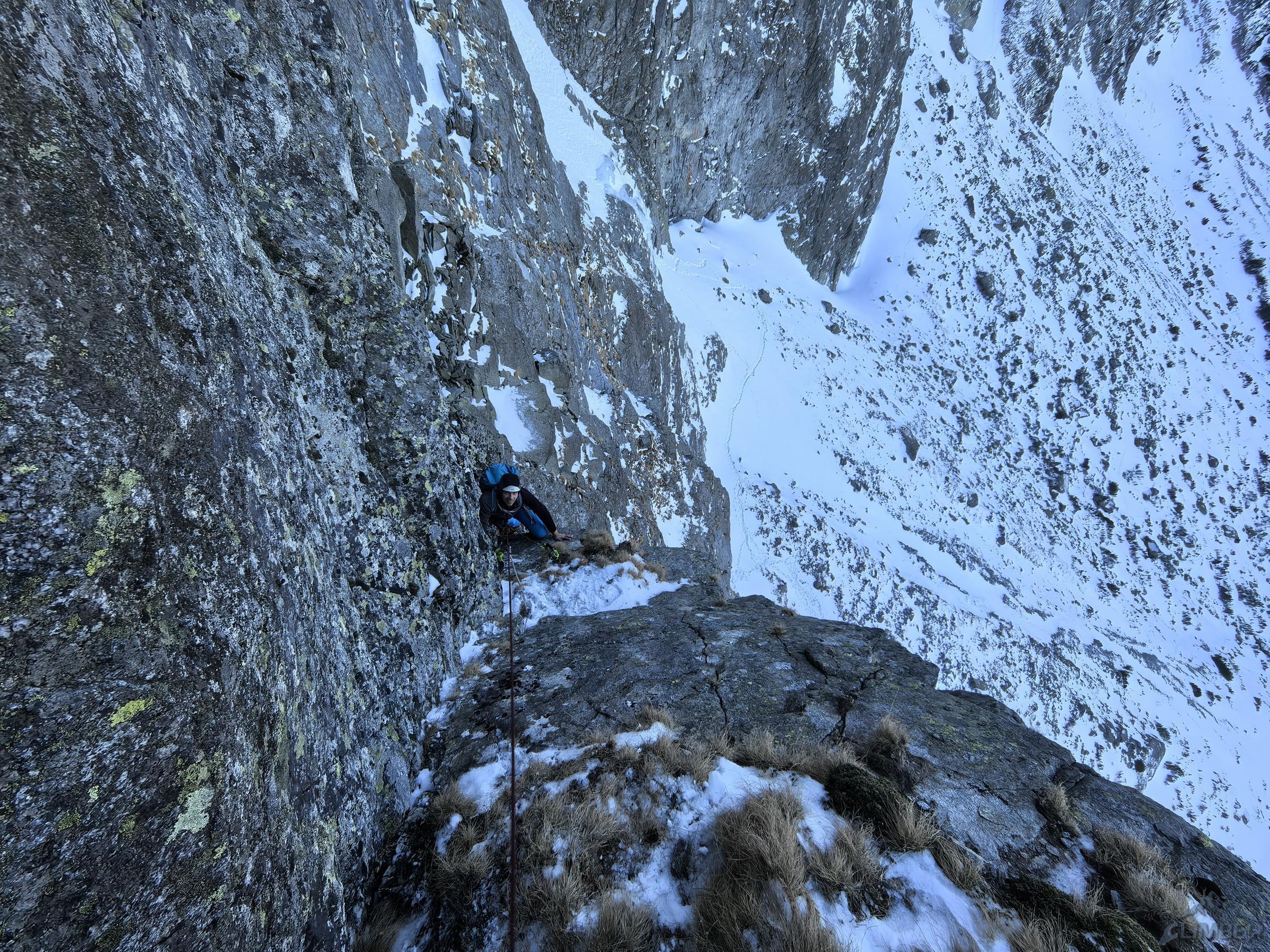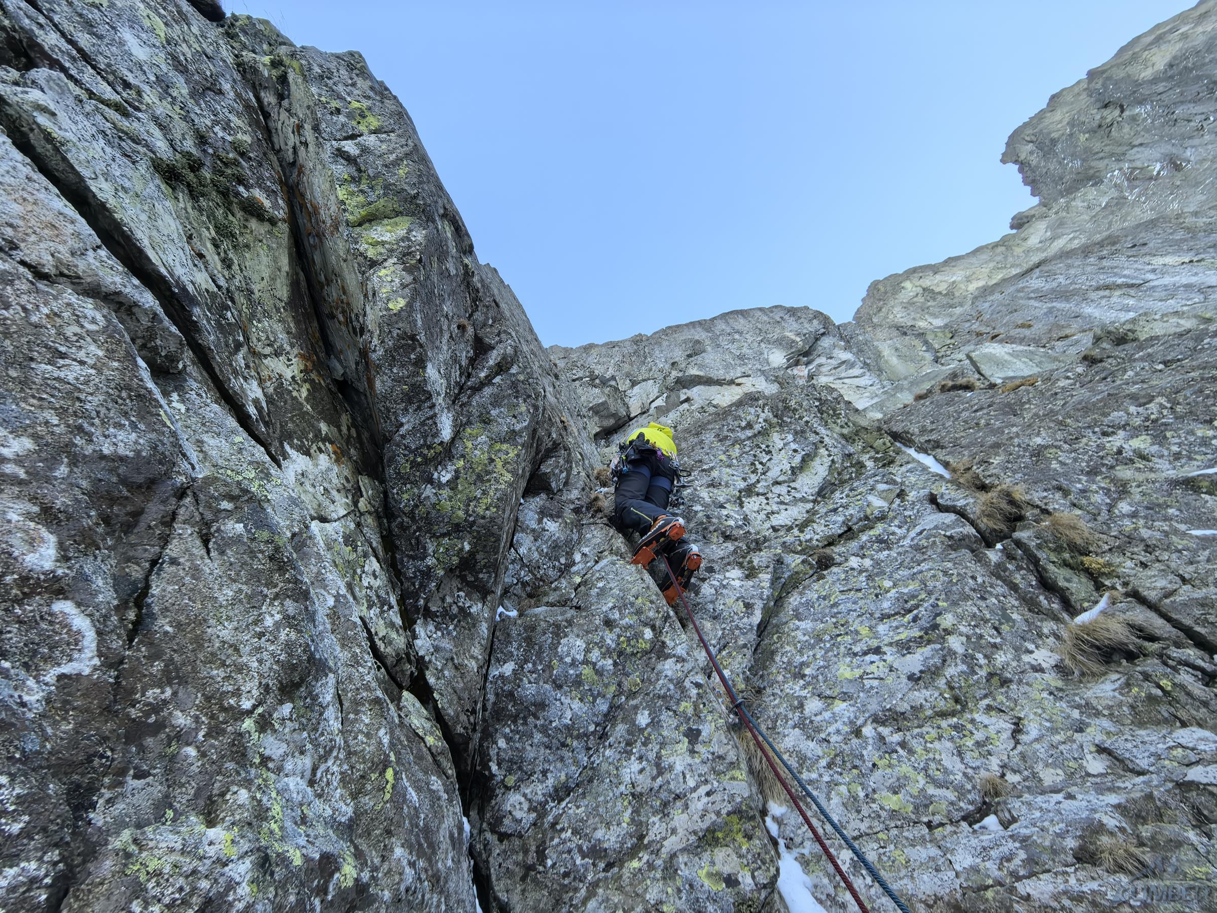 Piękne zacięcie przypada w prowadzeniu Michałowi – ze stanowiska (własnego) na półce ruszamy wprost do góry, pokonujemy kolejne lite metry z doskonałą asekuracją (ok. M5) i po dojściu pod odcinający dalszą drogę okap przechodzimy pod nim w lewo (wg topo M6 ale raczej max M6-) i przewijamy się na taras. Z niego warto podejść jeszcze kilka metrów do góry (M4+) na półkę pod wąskim tunelem skalnym. Kolejny wyciąg zaczynamy od pokonania tego miejsca (M4), po czym kierujemy się skośnie w lewo wyraźną załupą (M3) pod żółtą ściankę, gdzie w prawo odbija wariant oryginalny, obecnie rzadko raczej uczęszczany – sugerując się topo z przewodnika po wybranych drogach na Słowacji (pod red. Kuby/Richarda/Wadima) kontynuuję rampą do małego kominka (M4). Warto pokonać go w ciągu i po wyjściu na pole śnieżne zatrzymać się pod ostatnią przeszkodą czyli trawiastą ścianką. Odcinek ten choć łatwy (M4) wymaga wzmożonej czujności i asekuracji z haków i sprzętu do trawy – po jego pokonaniu pokonujemy jeszcze krótki uskok z dużymi blokami i wychodzimy na taras nad Kieżmarską Bulą.