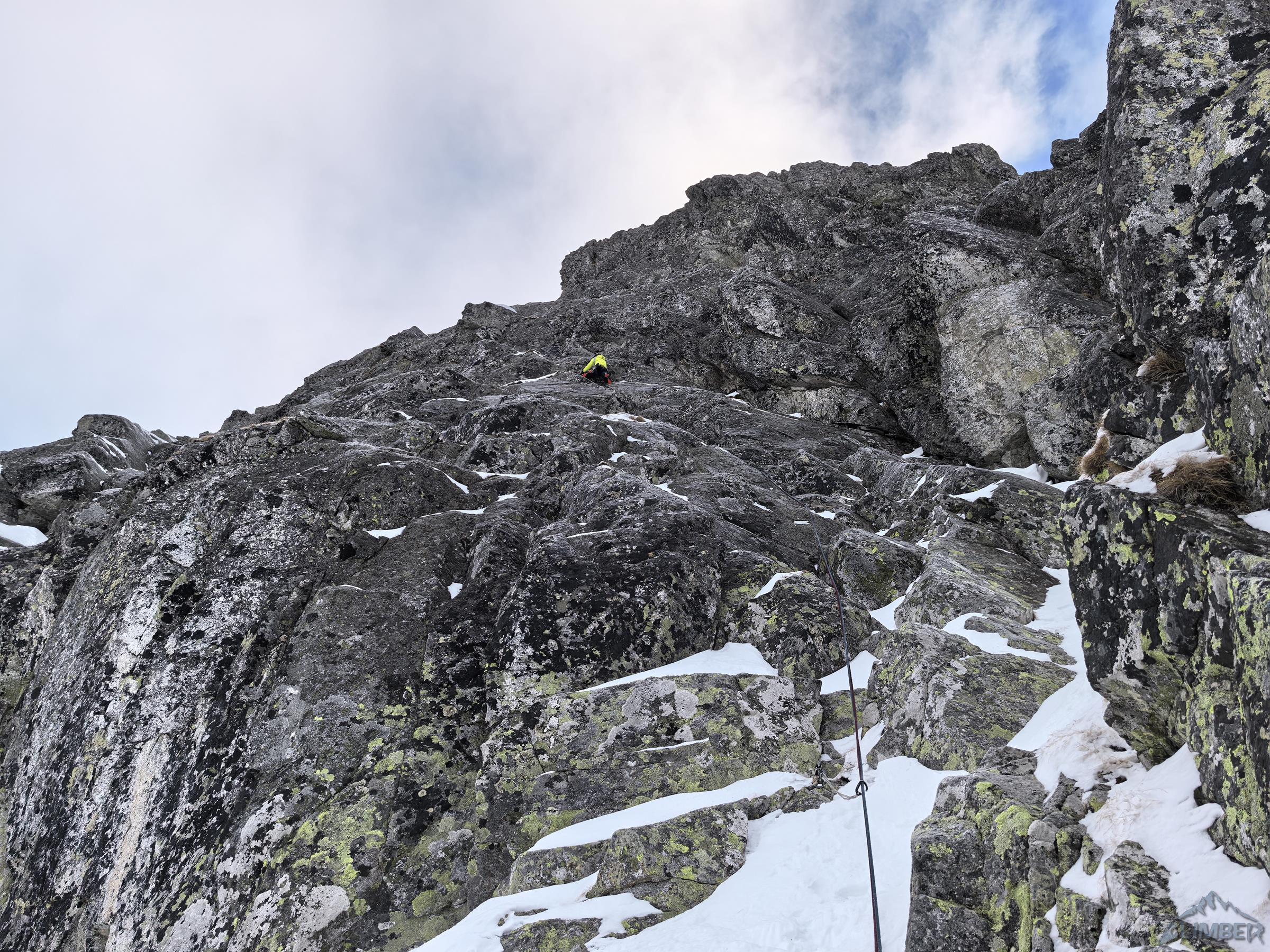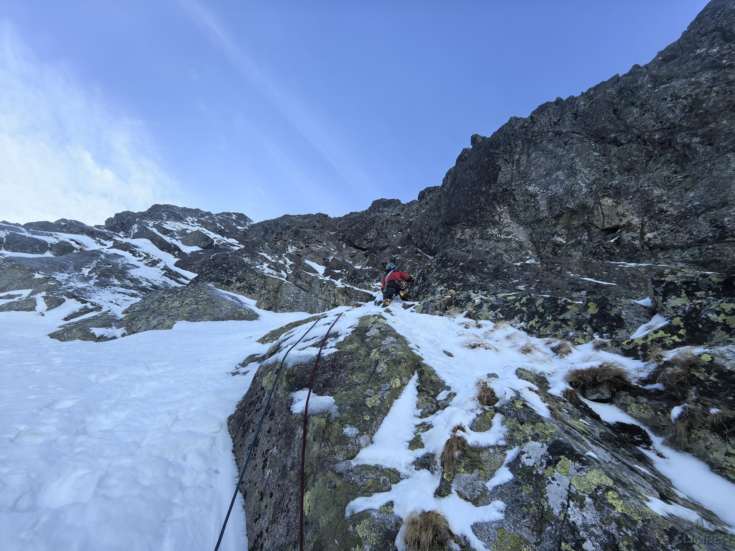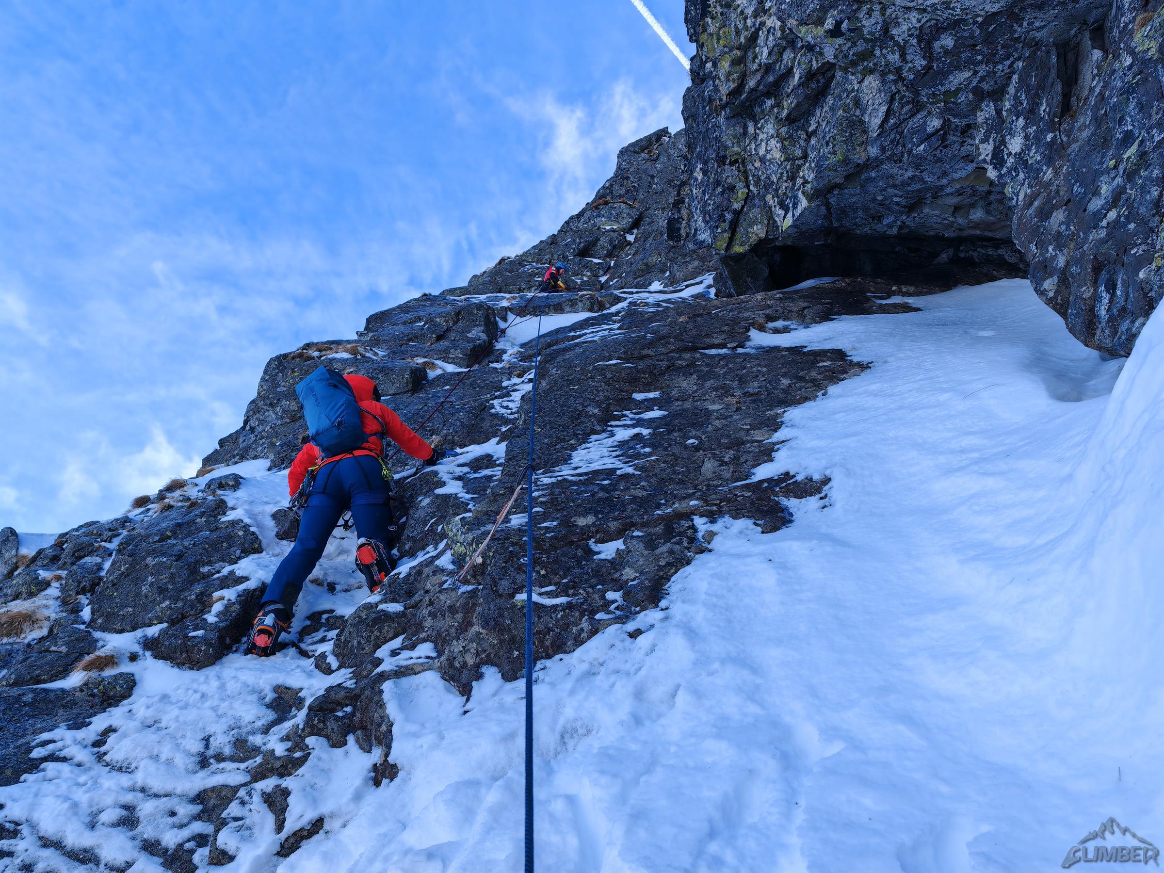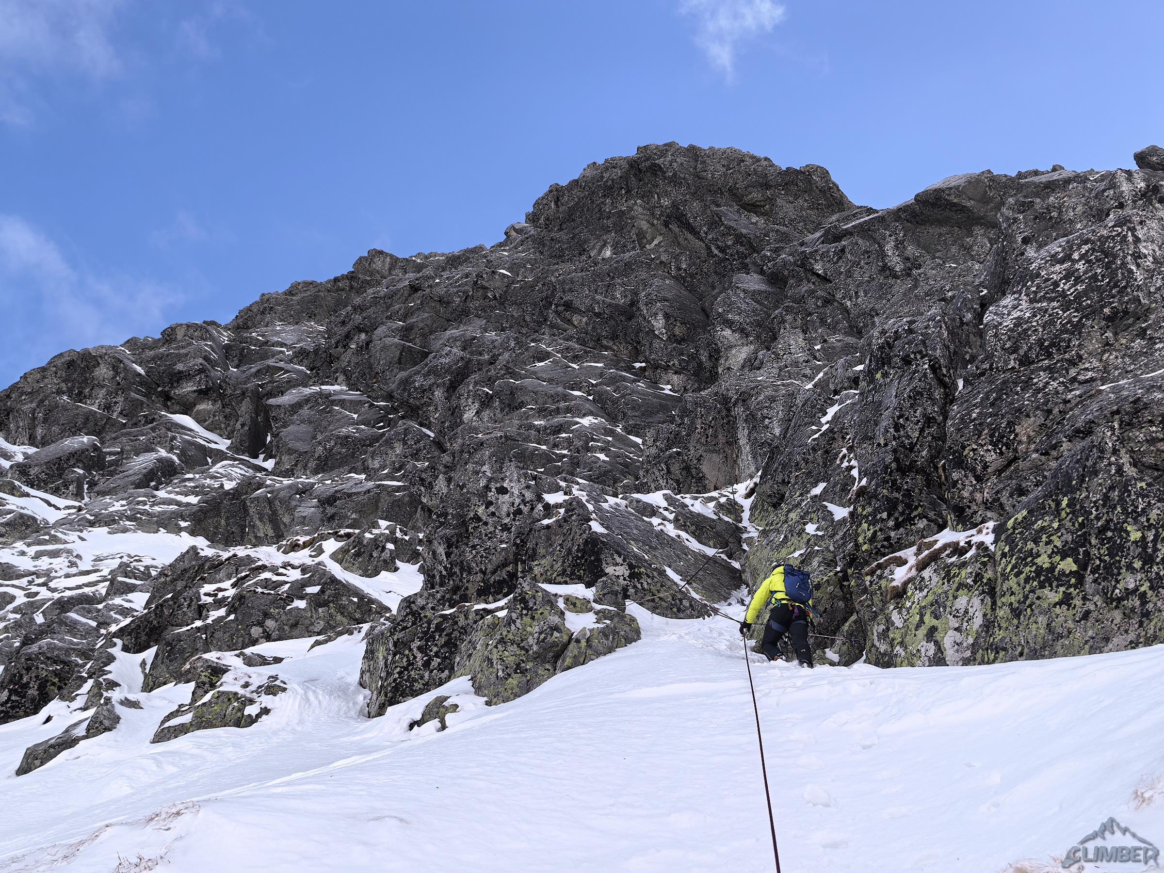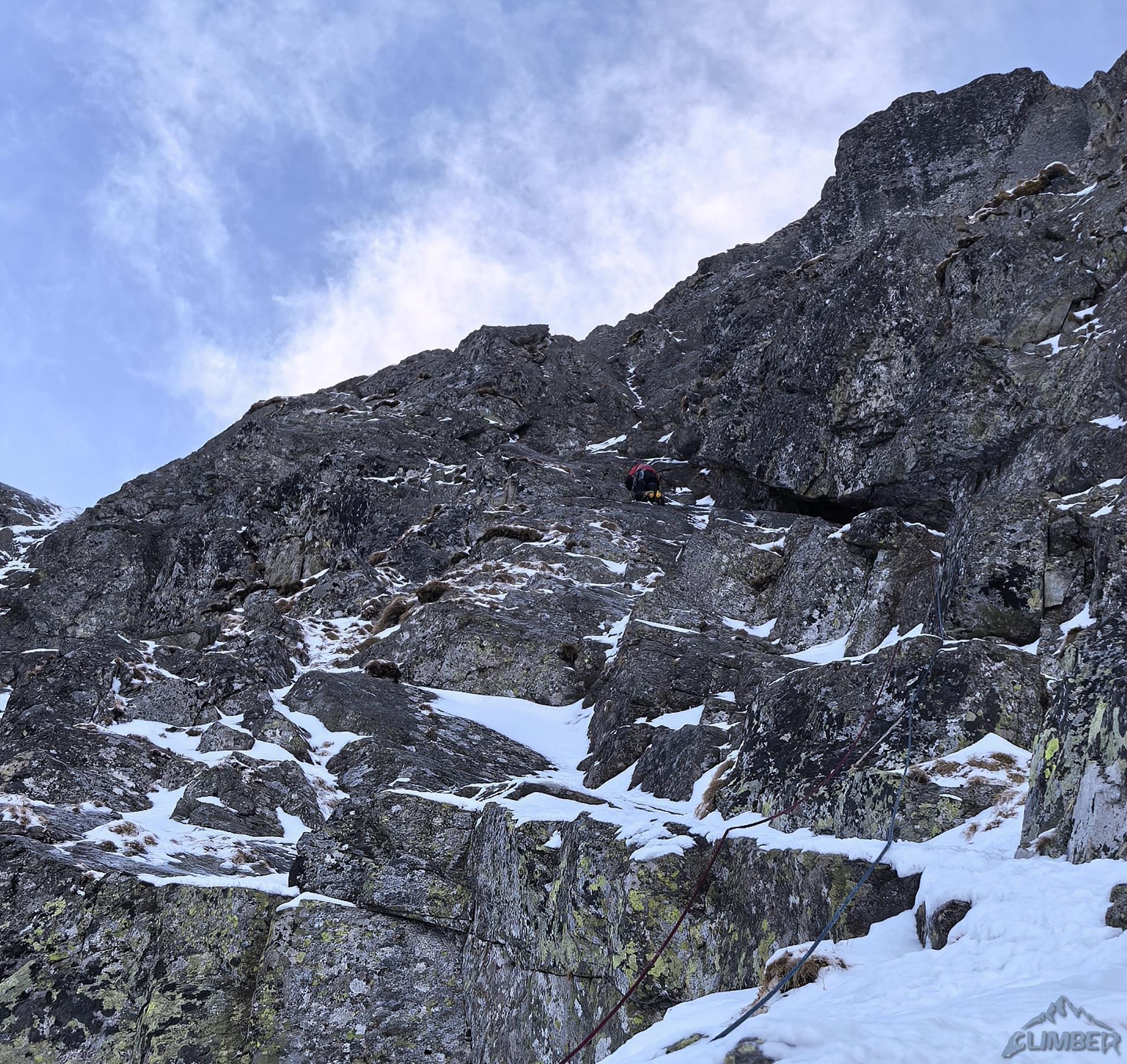 Po dotarciu pod ścianę trawersujemy pod początek trudności (przy dobrym śniegu można iść wprost od dołu) i zaczynamy wspinanie. Pierwsze metry to łatwy (M3-M4) mikstowy odcinek, po którym docieramy pod trudniejszą płytkę (ok. M5 gdy sucha) – po jej przejściu warto zrobić stanowisko. Nasz drugi wyciąg Dominik zaczyna od czujnego trawersu pod kominek, do którego wejście stanowi o trudnościach dolnego spiętrzenia – w zastanych warunkach natykamy się na fragment M5+ z nieco gorszą asekuracją. Wyżej czeka mniej strome już zacięcie wyprowadzające w łatwy teren – stanowisko robimy w dogodnym miejscu. Środkową część ściany pokonujemy na lotnej asekuracji – idziemy do góry i w prawo śniegiem, po czym pokonujemy dwa krótkie skalne uskoki (ok. M3) i docieramy pod kopułę szczytową. Ku naszemu zdziwieniu pod wielką nyżą poniżej wejścia w trudności odnajdujemy dwa spity – dobre miejsce na stanowisko, choć asekurując na kolejnym wyciągu trzeba się mocno wychylić w lewo.