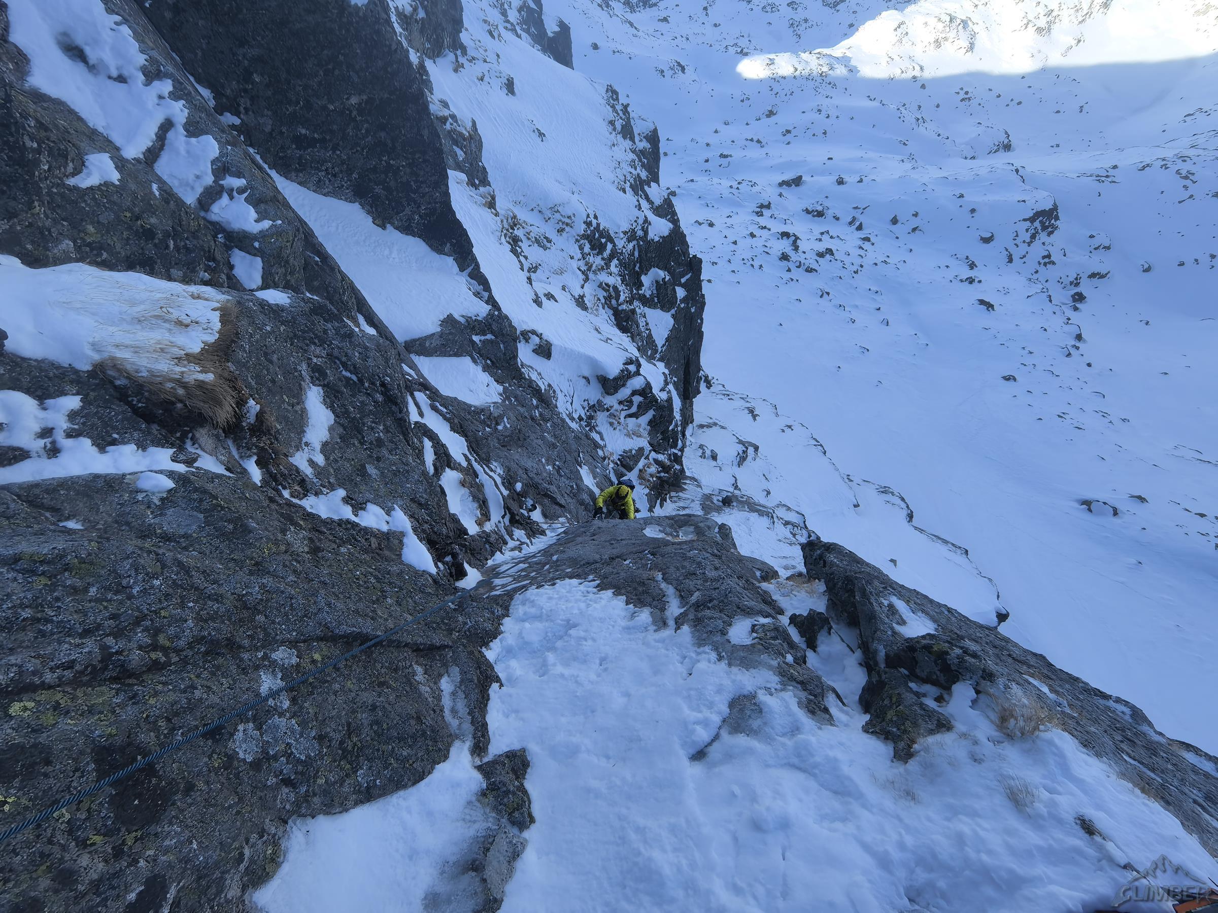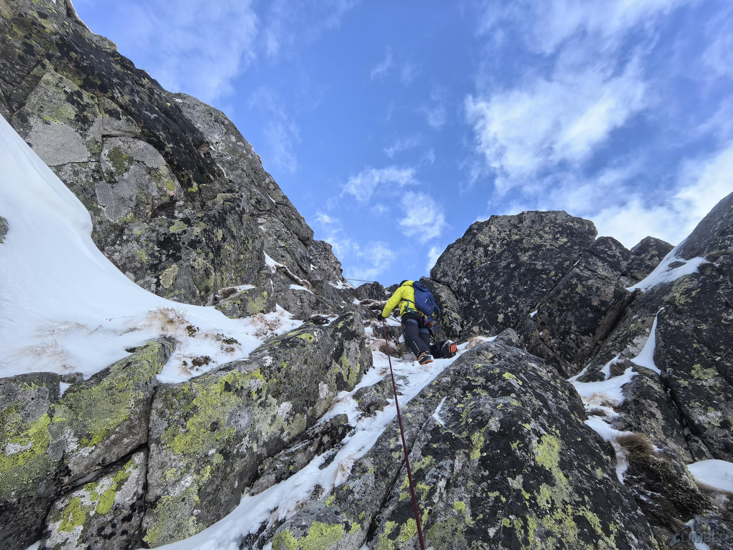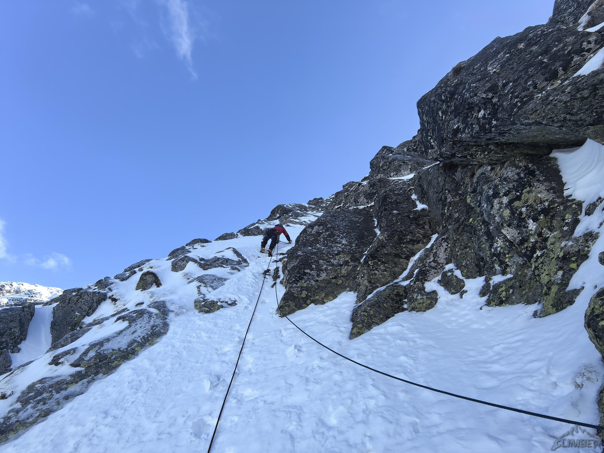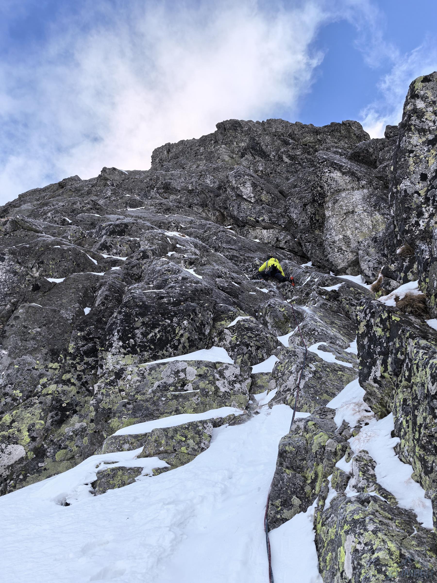 Po dotarciu pod ścianę trawersujemy pod początek trudności (przy dobrym śniegu można iść wprost od dołu) i zaczynamy wspinanie. Pierwsze metry to łatwy (M3-M4) mikstowy odcinek, po którym docieramy pod trudniejszą płytkę (ok. M5 gdy sucha) – po jej przejściu warto zrobić stanowisko. Nasz drugi wyciąg Dominik zaczyna od czujnego trawersu pod kominek, do którego wejście stanowi o trudnościach dolnego spiętrzenia – w zastanych warunkach natykamy się na fragment M5+ z nieco gorszą asekuracją. Wyżej czeka mniej strome już zacięcie wyprowadzające w łatwy teren – stanowisko robimy w dogodnym miejscu. Środkową część ściany pokonujemy na lotnej asekuracji – idziemy do góry i w prawo śniegiem, po czym pokonujemy dwa krótkie skalne uskoki (ok. M3) i docieramy pod kopułę szczytową. Ku naszemu zdziwieniu pod wielką nyżą poniżej wejścia w trudności odnajdujemy dwa spity – dobre miejsce na stanowisko, choć asekurując na kolejnym wyciągu trzeba się mocno wychylić w lewo.