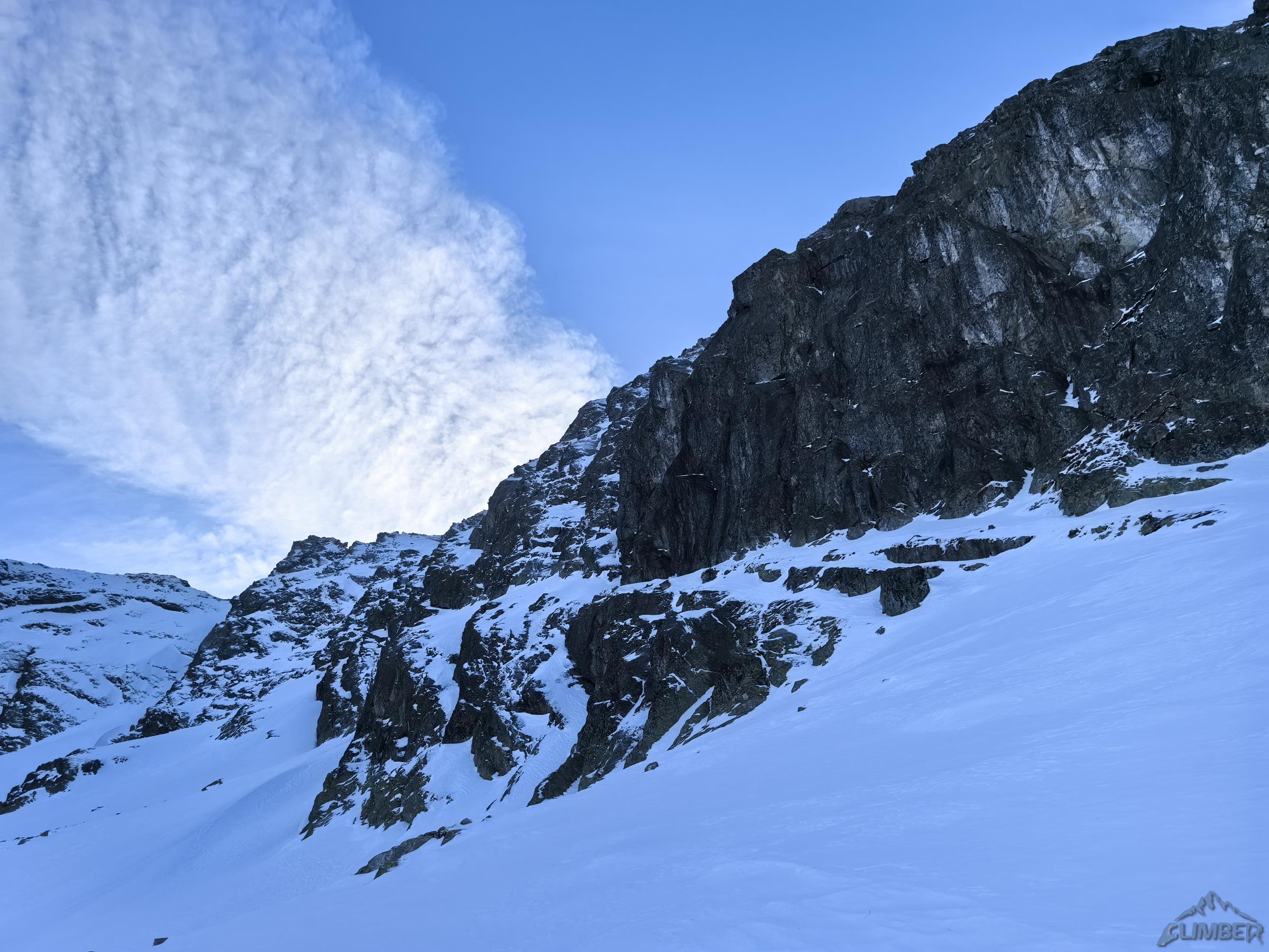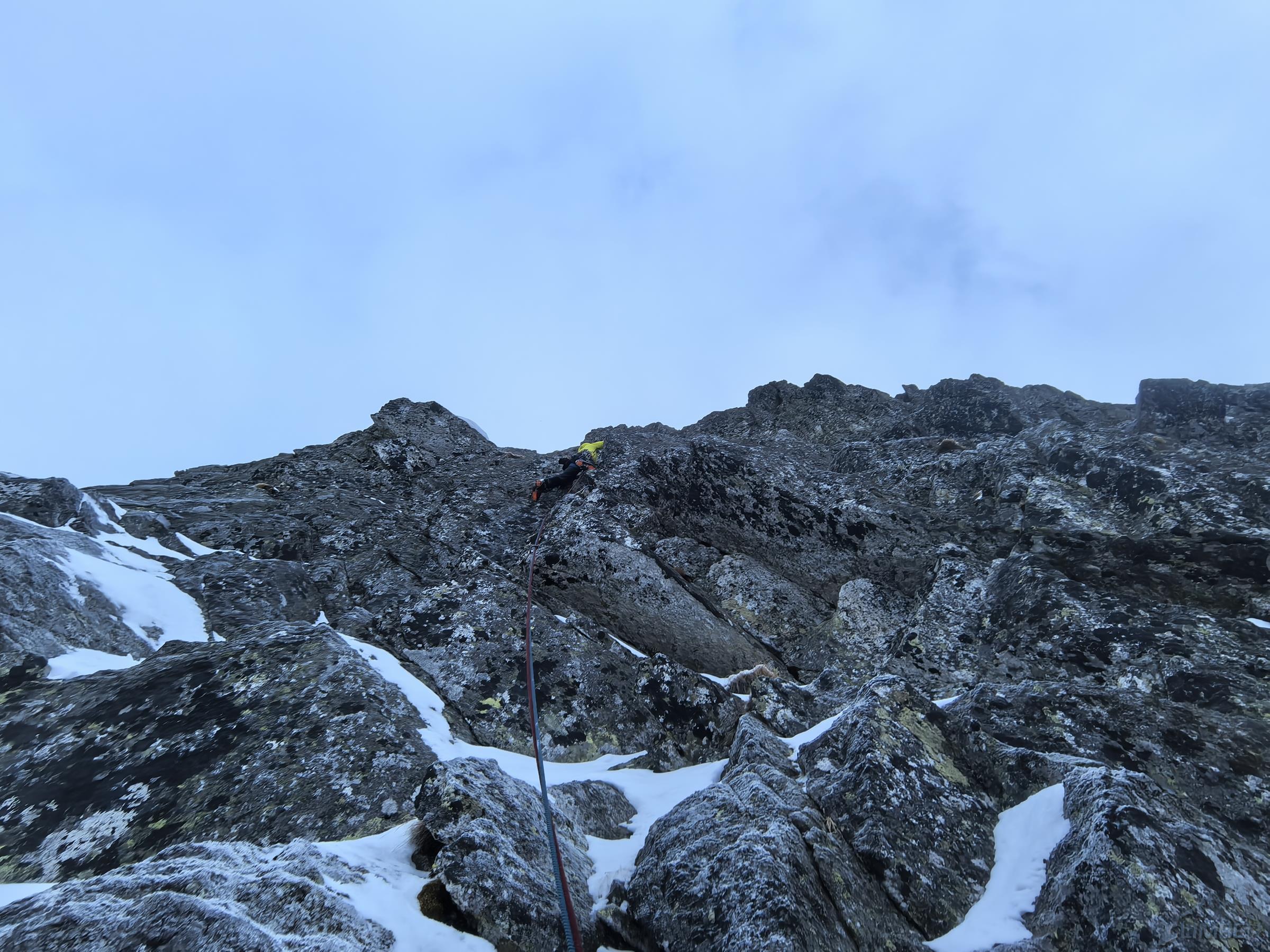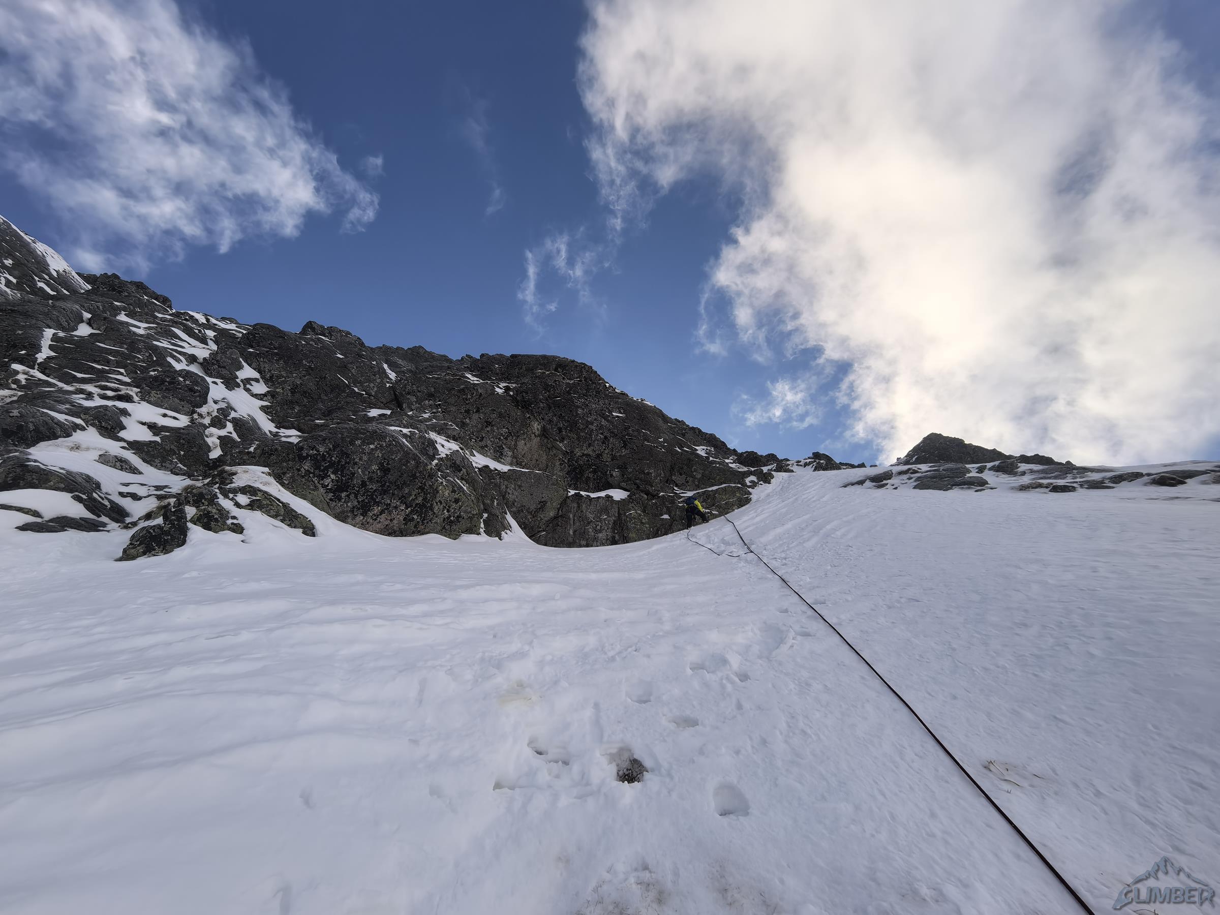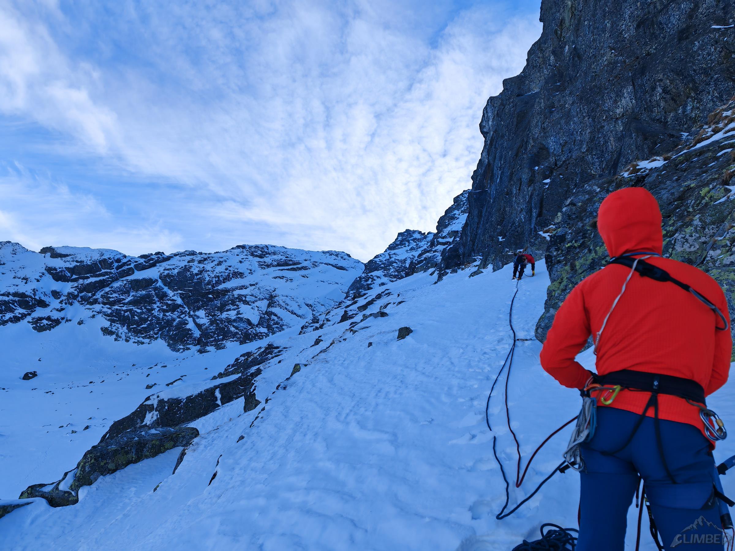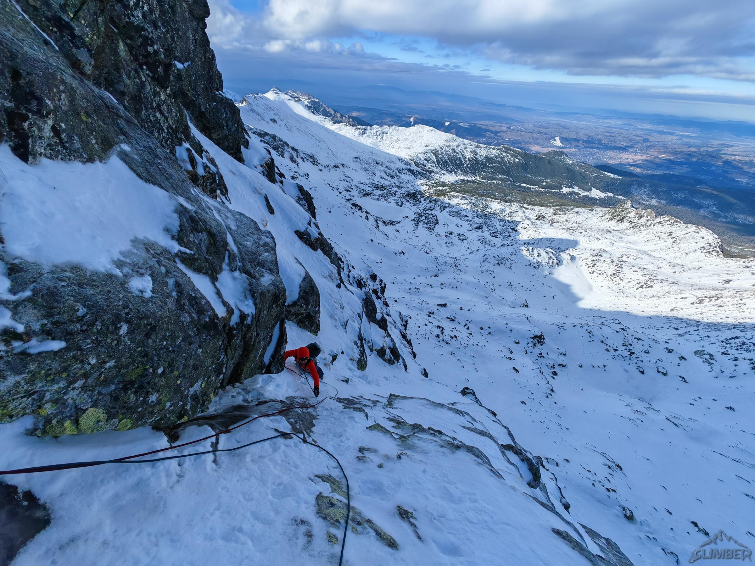 Po dotarciu pod ścianę trawersujemy pod początek trudności (przy dobrym śniegu można iść wprost od dołu) i zaczynamy wspinanie. Pierwsze metry to łatwy (M3-M4) mikstowy odcinek, po którym docieramy pod trudniejszą płytkę (ok. M5 gdy sucha) – po jej przejściu warto zrobić stanowisko. Nasz drugi wyciąg Dominik zaczyna od czujnego trawersu pod kominek, do którego wejście stanowi o trudnościach dolnego spiętrzenia – w zastanych warunkach natykamy się na fragment M5+ z nieco gorszą asekuracją. Wyżej czeka mniej strome już zacięcie wyprowadzające w łatwy teren – stanowisko robimy w dogodnym miejscu. Środkową część ściany pokonujemy na lotnej asekuracji – idziemy do góry i w prawo śniegiem, po czym pokonujemy dwa krótkie skalne uskoki (ok. M3) i docieramy pod kopułę szczytową. Ku naszemu zdziwieniu pod wielką nyżą poniżej wejścia w trudności odnajdujemy dwa spity – dobre miejsce na stanowisko, choć asekurując na kolejnym wyciągu trzeba się mocno wychylić w lewo.