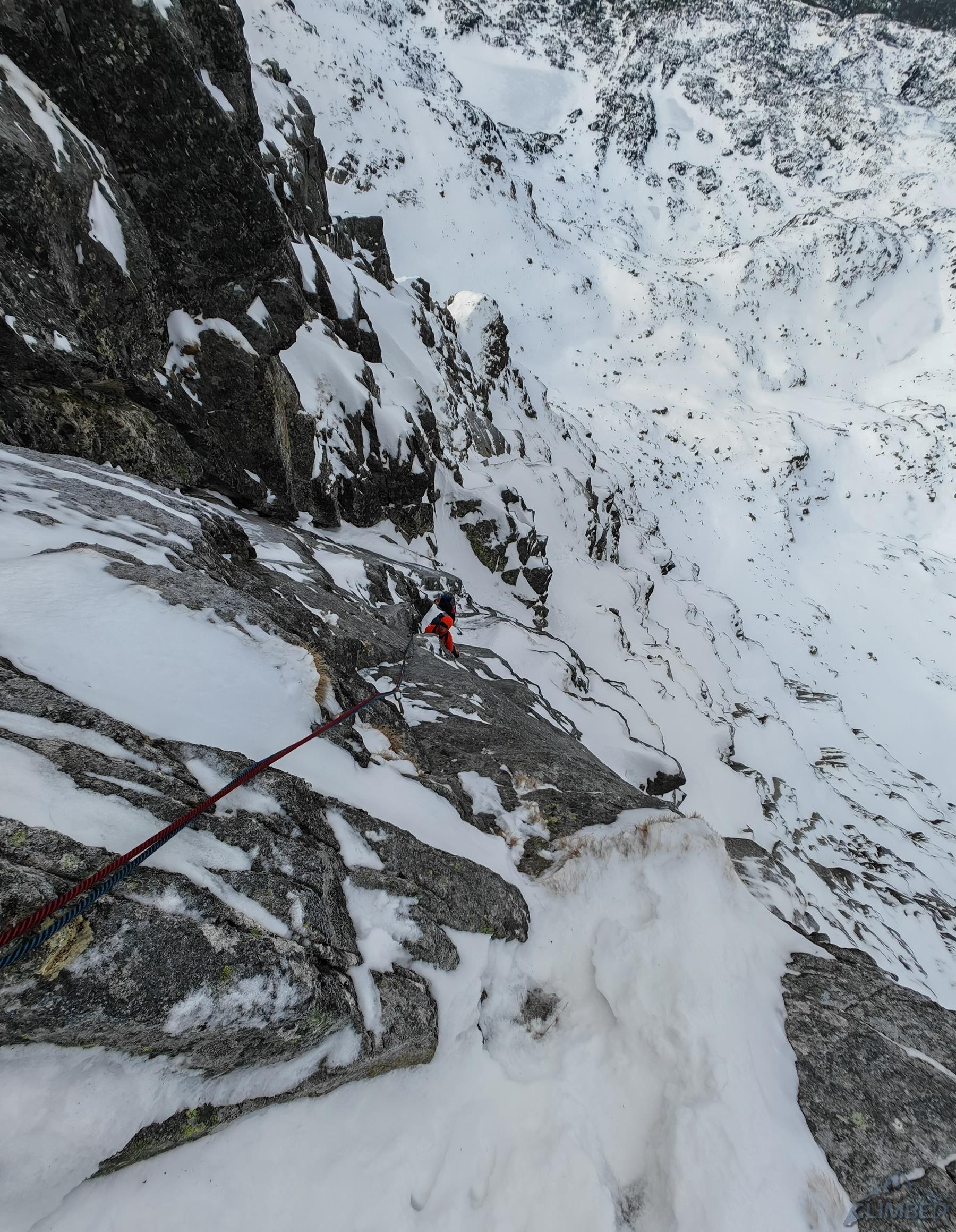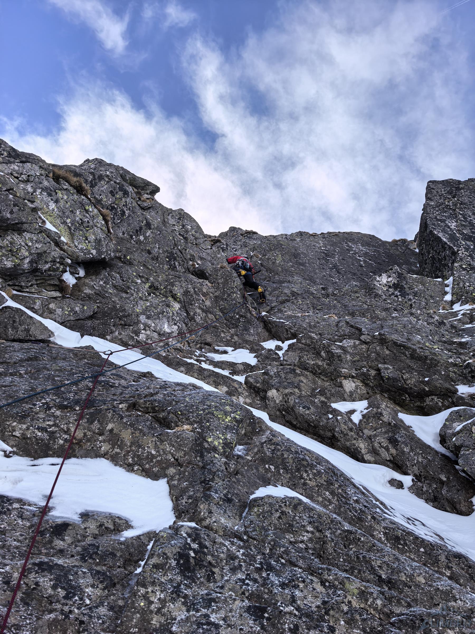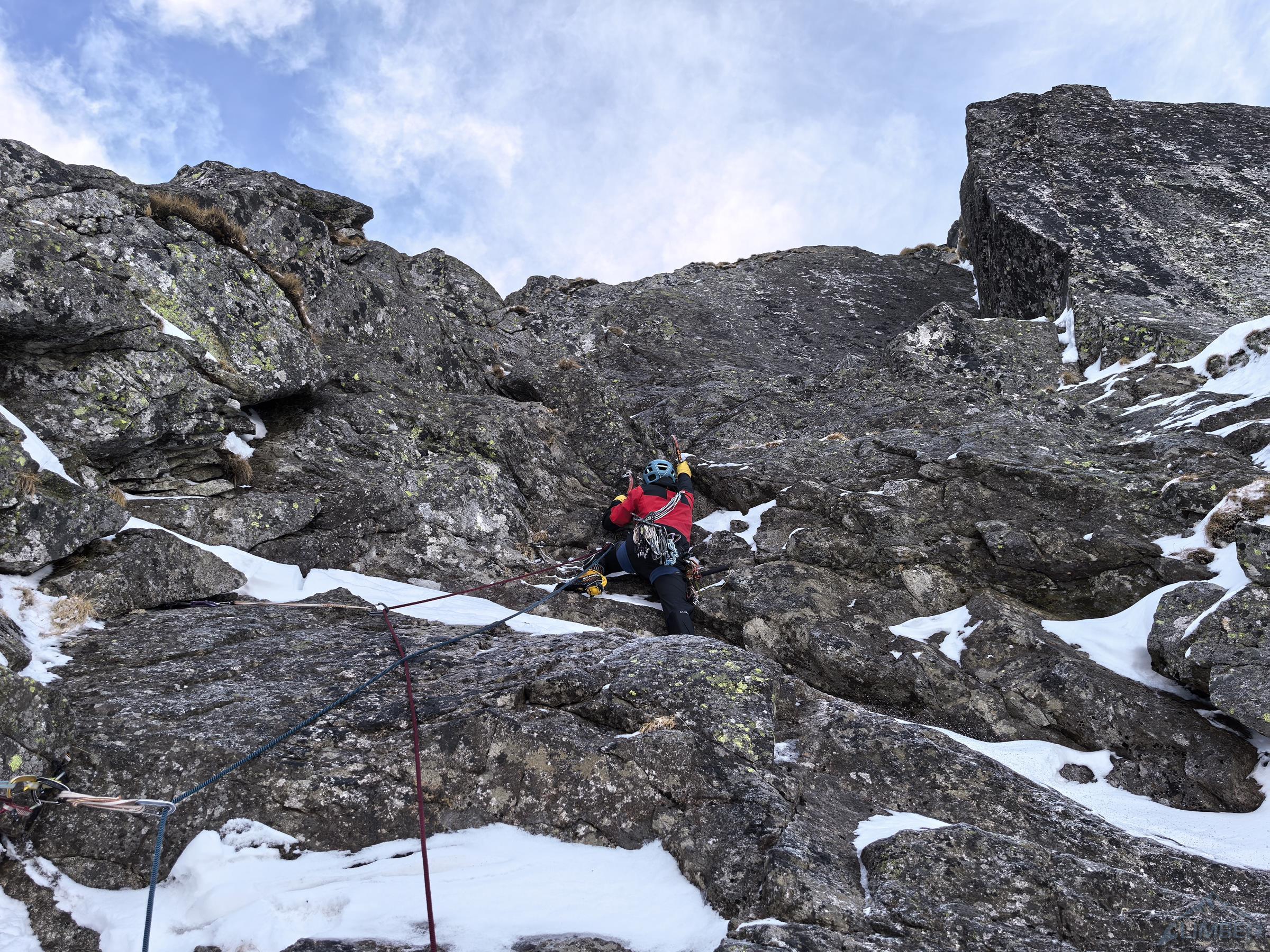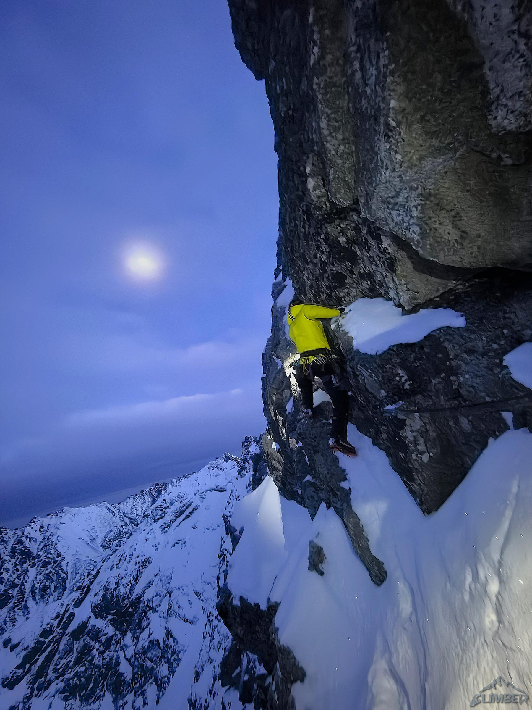 Kluczową część ściany prowadzi Michał – idziemy kilkanaście metrów depresją do góry, po czym wychodzimy w lewo na półkę (przewieszonym zacięciem w prawo idzie wariant). Kolejne metry to piękne wspinanie w płycie z rysą (ok. M5, haki), która pod koniec robi się dość gładka – po cruxie (ok. M6-) wychodzimy na wygodną półkę i robimy stan (wg schematu Kardasia zrobiliśmy dwa wyciągi). Następny odcinek zaczynamy po lewej stromym zacięciem z dobrymi chwytami – bardziej wymagające (ok. M5+) jest tylko wyjście z niego na półkę, którą trawersujemy w prawo do wygodnego stanowiska. Ostatni trudniejszy fragment drogi zaczynamy już po ciemku od czujnego przewinięcia w lewo do wąskiej stromej załupy (ok. M5), która po kilku metrach robi się mniej stroma – kontynuujemy nią za żebro w łatwiejszy teren. My zapędzamy się nieco za daleko, co nie ma jednak większego znaczenia – do wierzchołka taternickiego pozostaje ok. 60 metrów wspinania w trudnościach M3-M4, w zależności od wariantu. Drogę oczywiście polecam – na pewno jest to jeden z ciekawszych zimowych celów w okolicy!