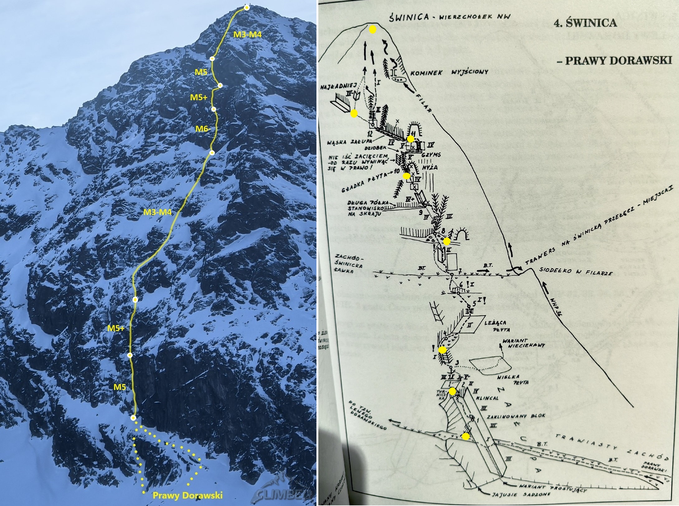 Tydzień po zrobieniu Leporowskiego na Kozim Wierchu (RELACJA) wracam na Halę by dorzucić do kolekcji kolejnego okolicznego klasyka – Prawego Dorawskiego na Świnicy. Ze względu na niewielką ilość śniegu i jego średnią jakość dotarcie pod kopułę szczytową zajmuje naszej trójce (tow. Dominik i Michał) sporo czasu, a jedno miejsce daje się nieco we znaki. Zgodnie z przewidywaniami kluczowe skalne odcinki w górnym spiętrzeniu są jednak suche, co przy płytowym charakterze wspinania jest tutaj ważne. W optymalnych warunkach trudności oscylują wokół mocnej piątki, z jednym bardziej wymagającym fragmentem (ok. M6-) z dobrą asekuracją. Przy zasypanej skale będzie trudniej i ryzykownie - zdarzały się przejścia A0 i wycofy w wykonaniu mocnych zespołów.