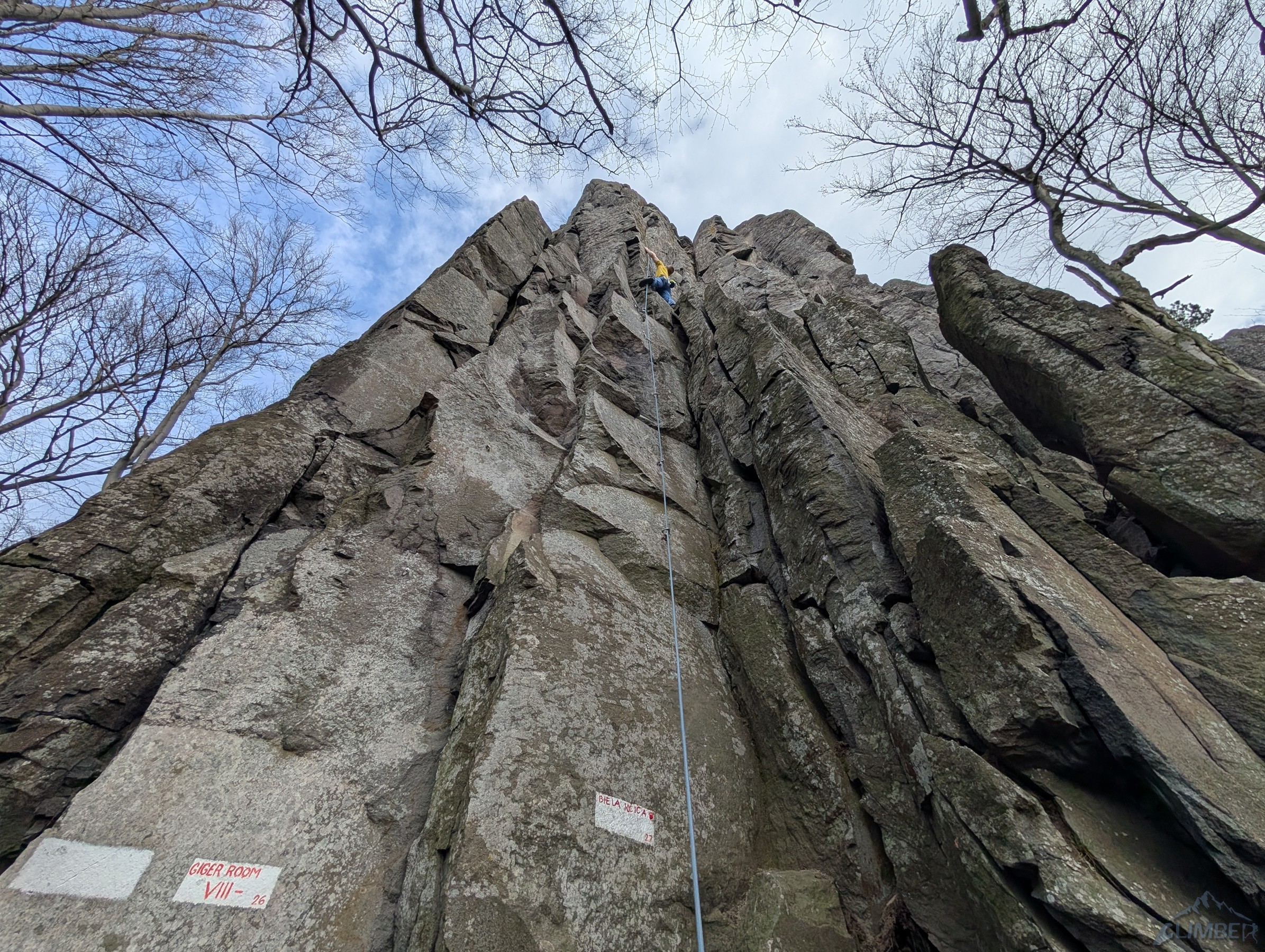 Drogi opisane są aż za dobrze (patrz zdjęcia) – znakowanie widać już z kilkudziesięciu metrów co niestety szpeci skałę… Niektóre linie są nieco porośnięte co jednak za bardzo nie przeszkadza we wspinaniu biorąc pod uwagę bardzo dobre tarcie, które przydaje się biorąc pod uwagę wymagający charakter wspinania po małych chwytach oraz technicznych kantach i rysach. Jak wspominałem nadal pojawiają się nowe drogi – nawet podczas naszej wizyty trwały prace ekiperskie, materiały na Internecie (np. wykaz dróg TUTAJ) będą już więc nieaktualne – najlepiej pochodzić pod skałą i wybierać co nam się podoba 😊.