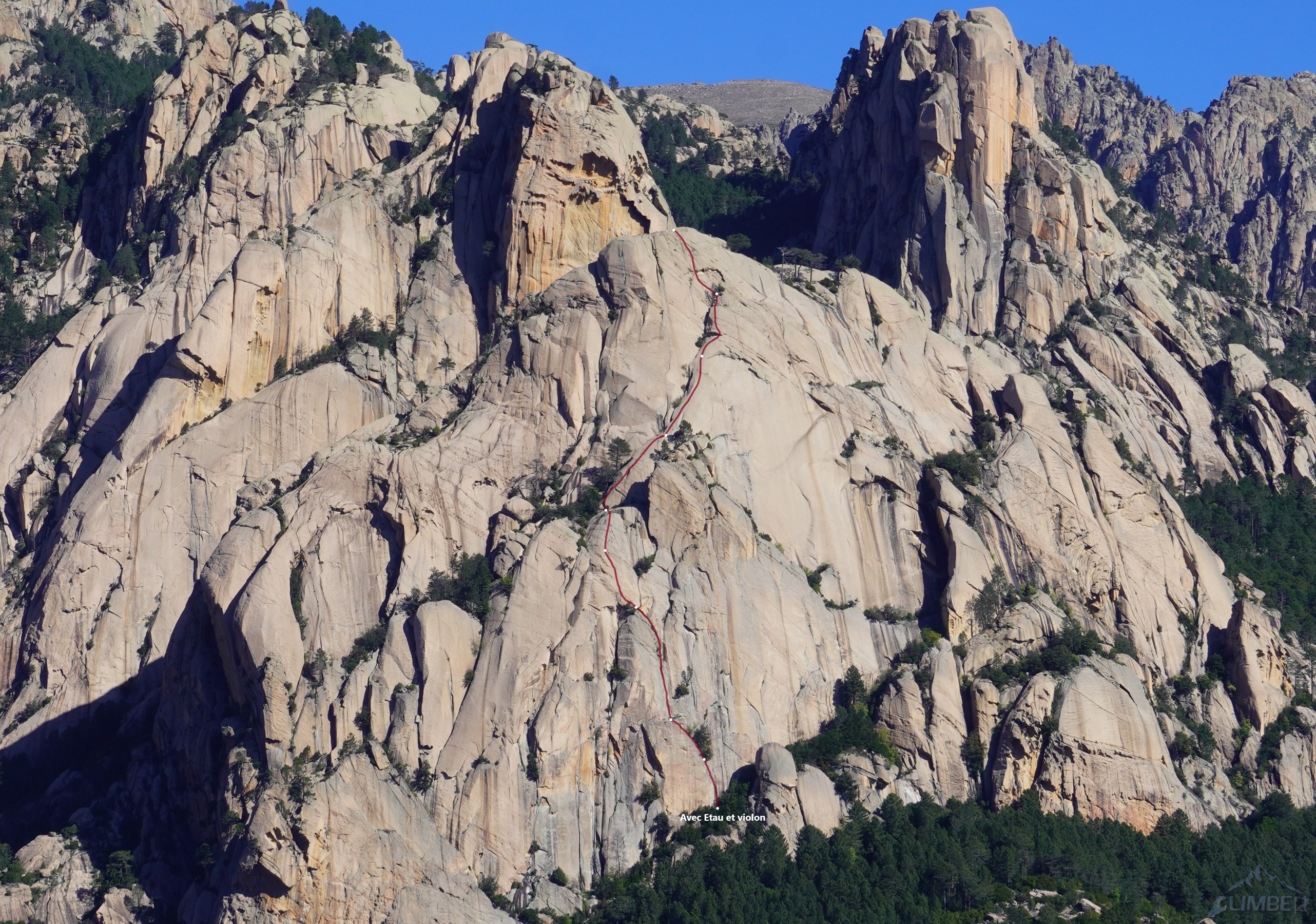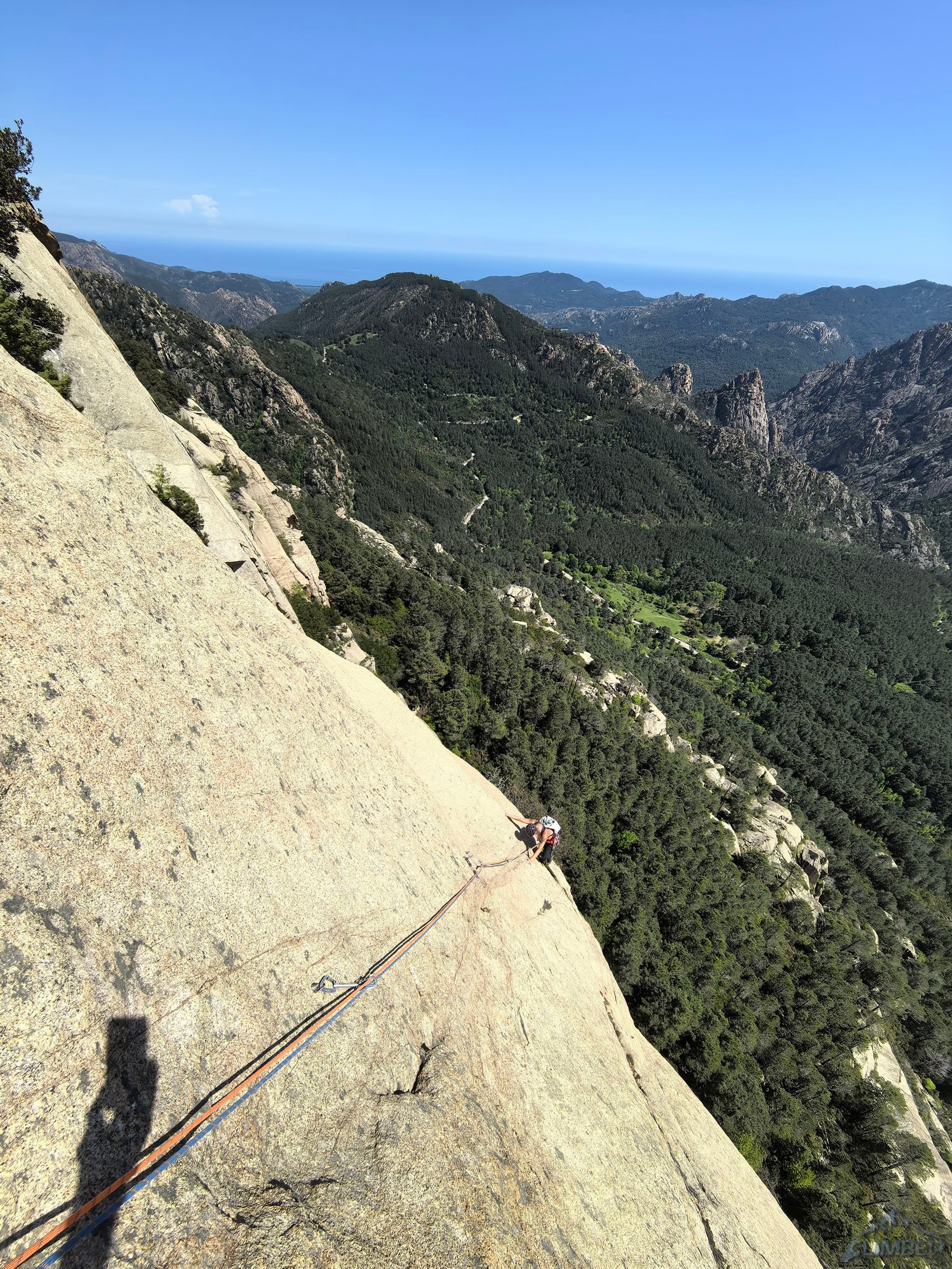 Drugiego dnia pobytu w Bavelli ruszamy na jedną z dwóch najlepszych ścian rejonu, Teghie Lisce. Po świetnym Acqua in Bocca (7a 350m, relacja TUTAJ) w 2024, tym razem kolejny klasyk - Avec etau et violon (6c/6c+ 300m). Teoretycznie linia łatwiejsza, nie należy jej jednak lekceważyć. Szczególnie przerysa na starcie okazuje się nie być przereklamowana i przekonujemy się skąd tyle wpisów z A0 jak sugerują w przewodniku 😉. Dalej też jest ciekawie i mimo niższych wycen oraz prawie kompletnego obicia miejscami niebanalnie, a na rajbungach konieczne są wyjścia wysoko nad wpinkę. Plusem drogi jest to, że jako jedna z nielicznych kończy bezpośrednio na szczycie, skąd rozpościera się piękny widok.