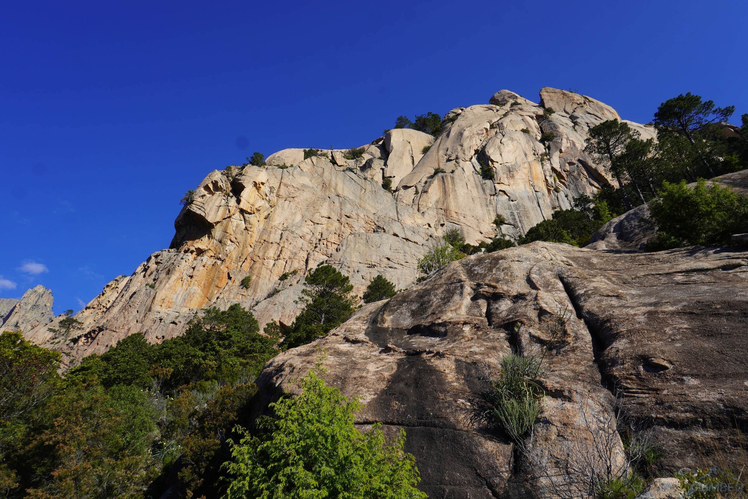 Na szczycie czeka nas piękny widok – z jednej strony góry, z drugiej morze, a tuż naprzeciwko imponujące ściany Punta Corbu i Punta Lunarda. Jeżeli zabraliśmy buty i nie zostawiliśmy nic pod ścianą można zejść ścieżką na stronę północną, my jednak wybieramy opcję zjazdową. Jest ona całkiem wygodna gdyż po trzech zjazdach słynną drogą Octogenese dostajemy się do kociołka z drzewami, z którego przechodzimy ścieżką do stanowiska po piątym wyciągu robionej przez nas drogi – stąd do ziemi mamy już tylko trzy zjazdy.
