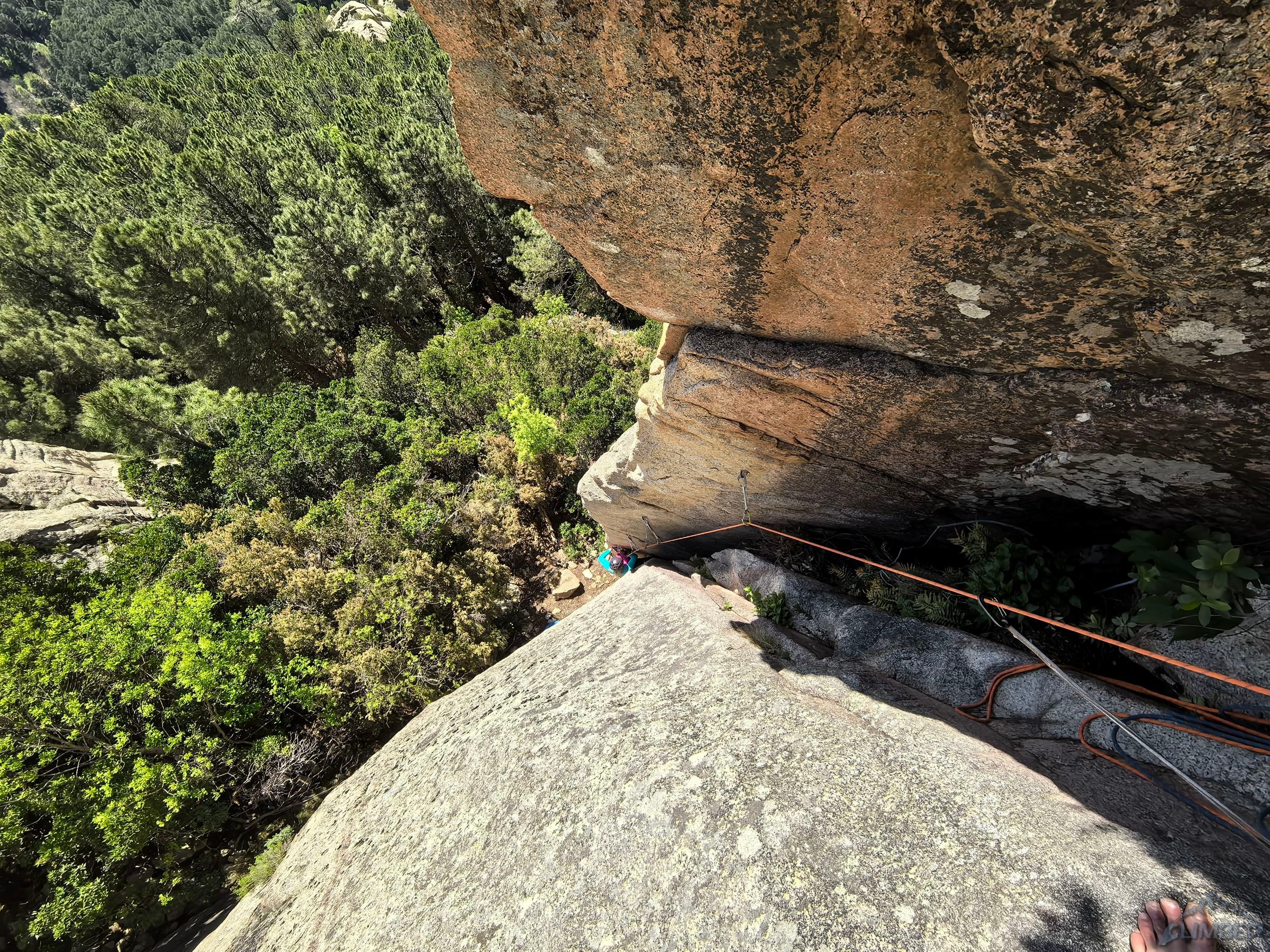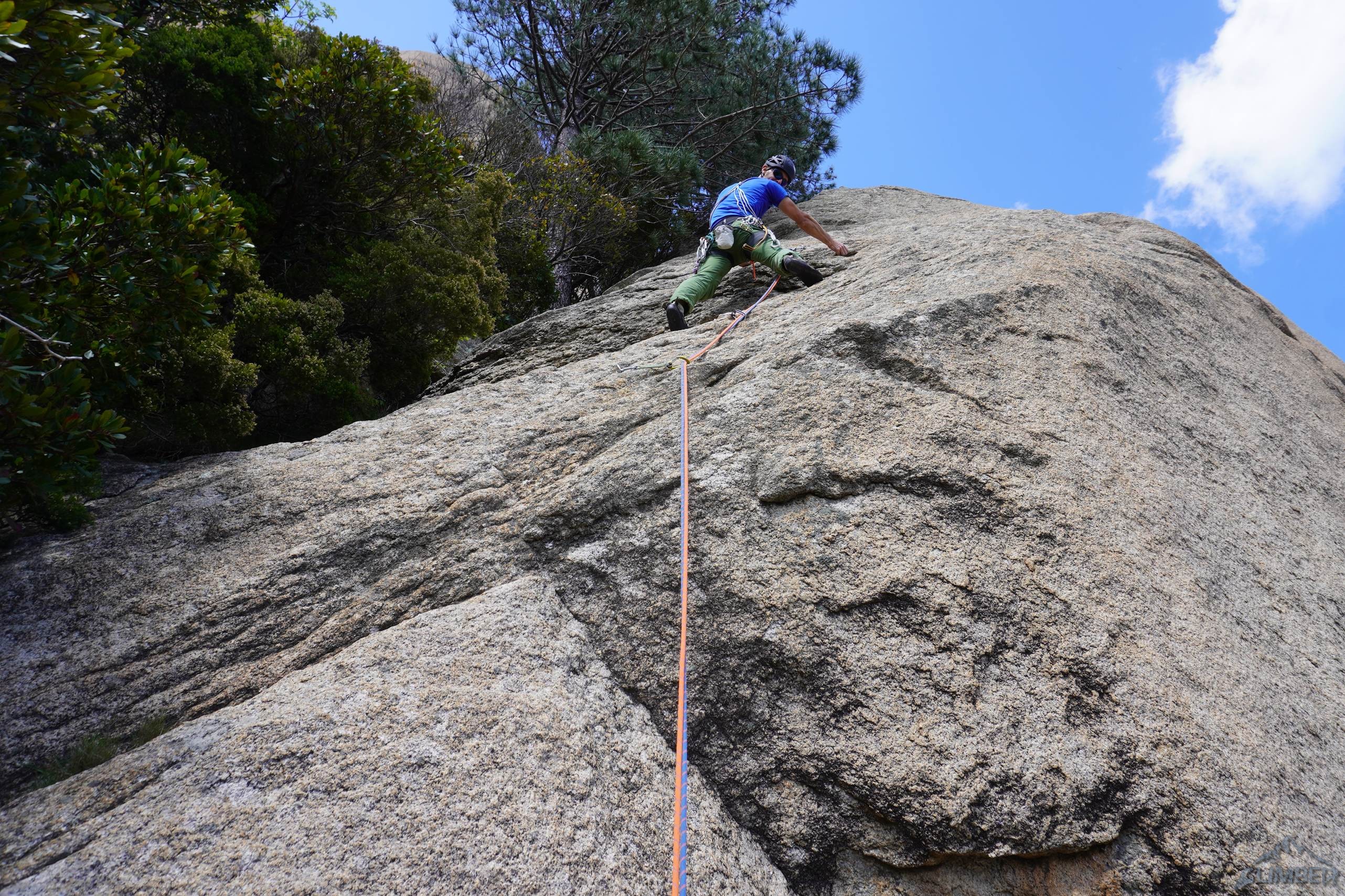 Trzeci odcinek wygląda imponująco i wspinanie na nim nie jest banalne jak na wycenę 6a+. Po przejściu odcinka płytowego wchodzimy do komino-rysy i pokonujemy kolejne uskoki, z których jeden z powodu śliskiej wymytej skały jest całkiem sprężny. Dla tego odcinka warto zabrać z 3-4 friendy (#0.5-2) by poprawić komfort wspinania. Z kolejnej zjazdówki przenosimy się na półkę po lewej i z niej wchodzimy w wyciąg czwarty – po przejściu po klamach czeka czujny ale dobrze obity trawers w lewo (6b) do bliskiego stanowiska. Z niego wspinamy się piękną techniczną płytą (6a) z jednym wymagającym miejscem, po którym rajbungiem docieramy do dużej półki. Z niej przenosimy się kilkanaście metrów w lewo pod start kolejnego wyciągu szóstego. Czeka na nim fajne tarciowe wspinanie – początkowo nieco trudniejsze (5c), po czym teren się kładzie i biegniemy do kolejnego stanowiska.