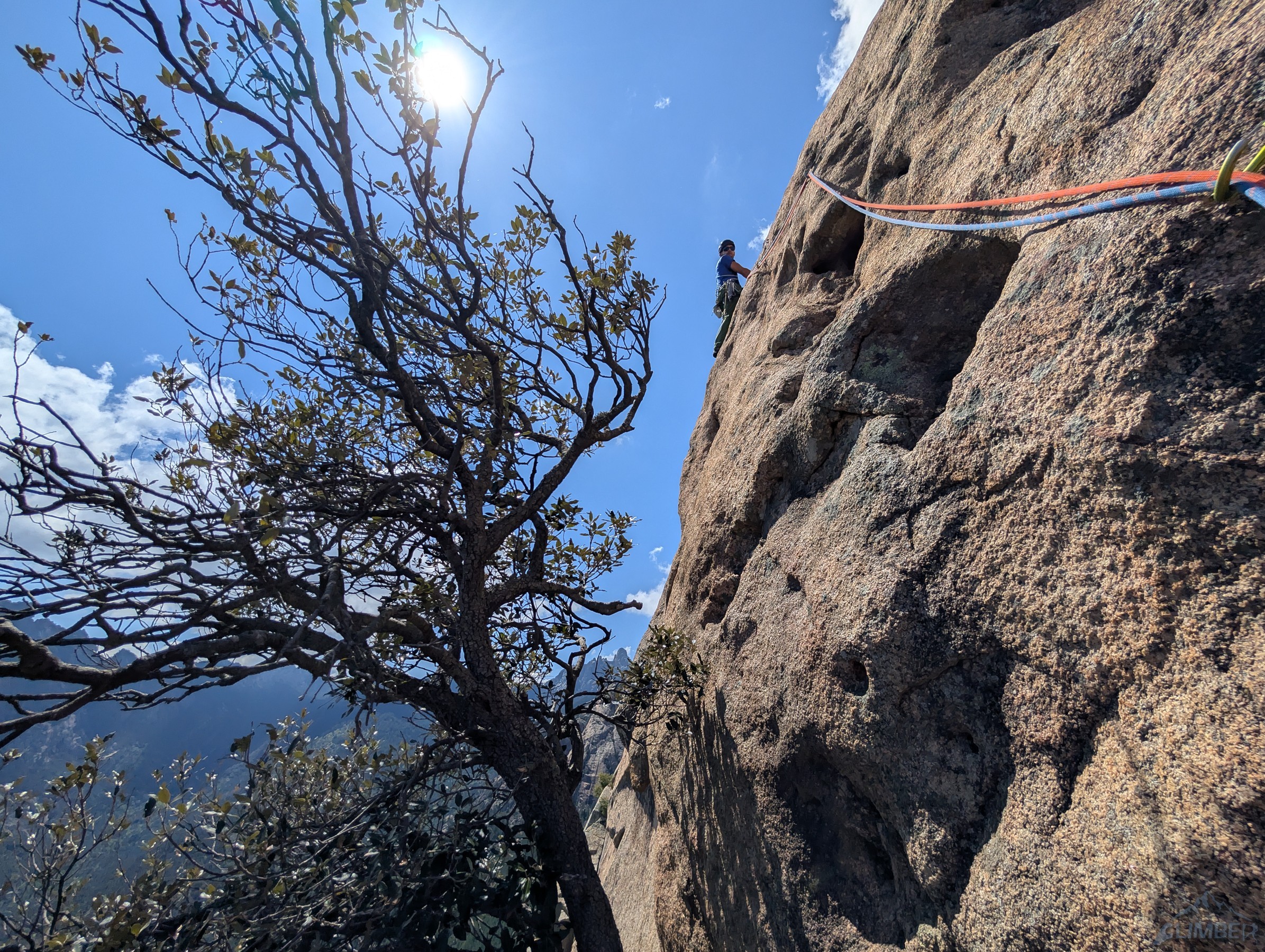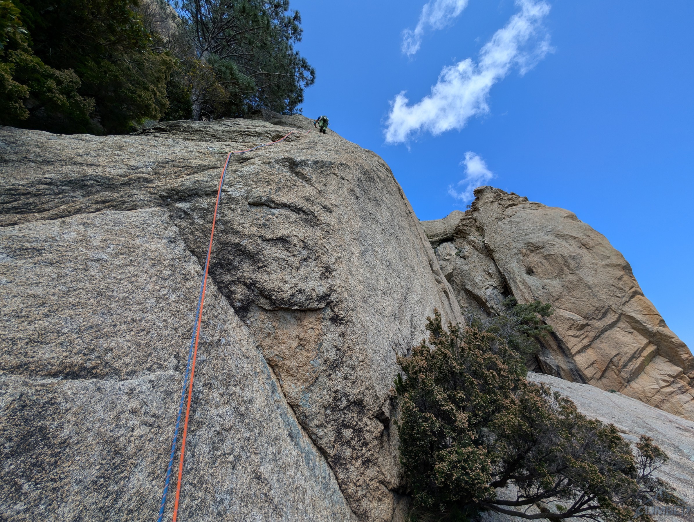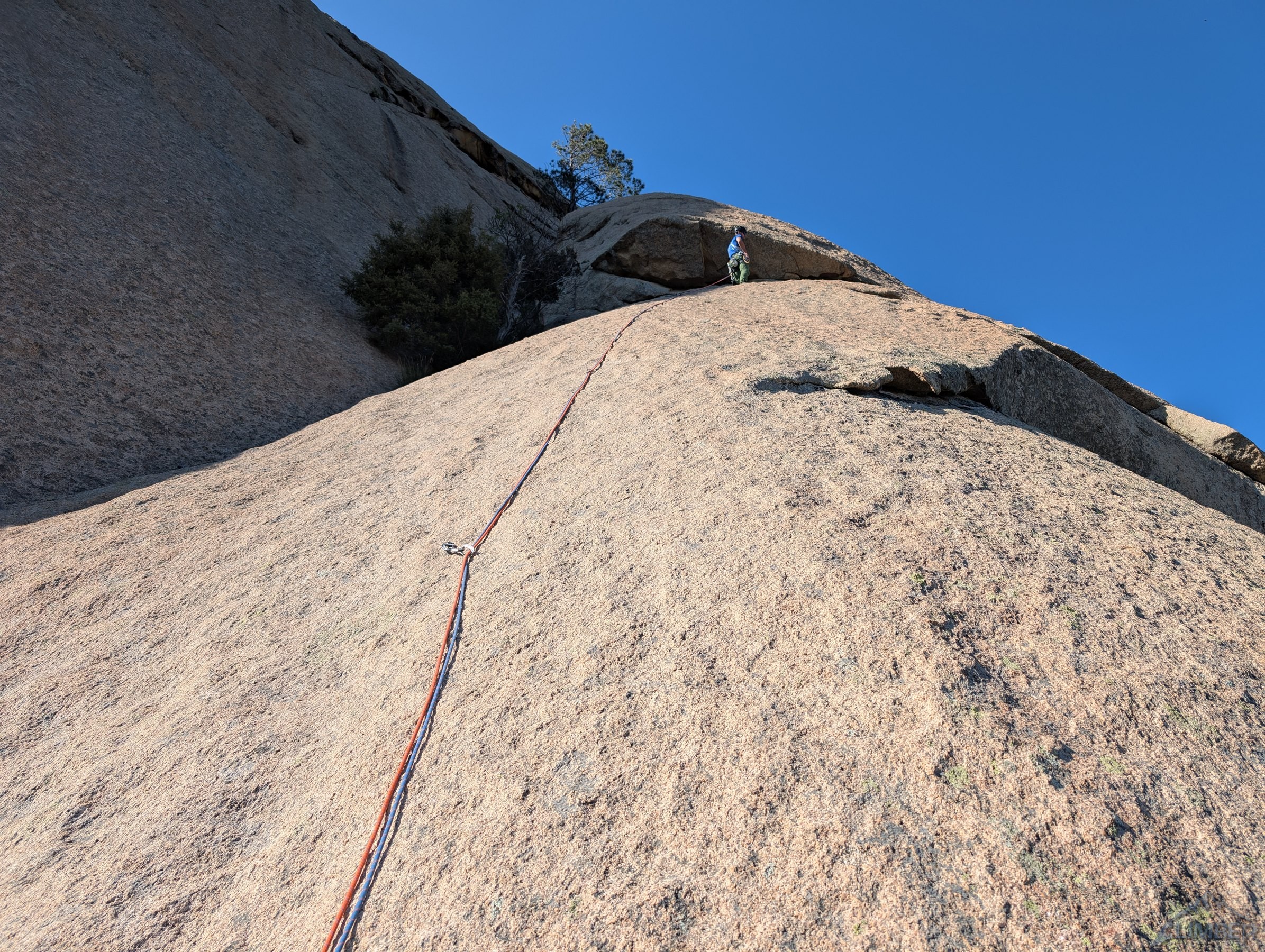 Do tego miejsca rampą z prawej strony dochodzi droga Invitation au voyage (5b), która w kombinacji z trzema kolejnymi wyciągami Avec etau stanowi najłatwiejszy sposób przejścia ściany – tydzień wcześniej wspinaczką taką odbyli zresztą nasi znajomi. W tym miejscu plan zakładał, że dalej poprowadzi Ania – odległe spity na niebanalnie wyglądających rajbungach spowodowały jednak, że po kilku metrach doszło do sabotażu 😉 i nie pozostało mi nic innego jak kontynuować prowadzenie. Na siódmym wyciągu (6a) przy rozgrzanej Słońcem płycie faktycznie można poczuć się nieco mało komfortowo robiąc tarciowe ruchy kilka metrów nad wpinką – dobrym rozwiązaniem jest poruszanie się jak najszybciej 😊. Wspinanie przypomina to z czym do czynienia mamy na słynnym grzbiecie Słonia (RELACJA), tam jeden wyciąg jest jednak trudniejszy i jeszcze rzadziej obity. Na ósmym wyciągu (5c) kontynuujemy rajbungową płytą, która przedzielona jest jednak okapem – omijamy go sprytnie prawą stroną i wracamy w lewo po czym kierujemy się do stanowiska na drzewie. Ostatni wyciąg wygląda na trudniejszy niż jest w rzeczywistości (6a) aczkolwiek jest bardzo ładny i różnorodny – zaczynamy od płytowego trawersu, pokonujemy tafonisy oraz niebanalny okapik powyżej i już bez spita (można coś dorzucić) wychodzimy ze ściany.