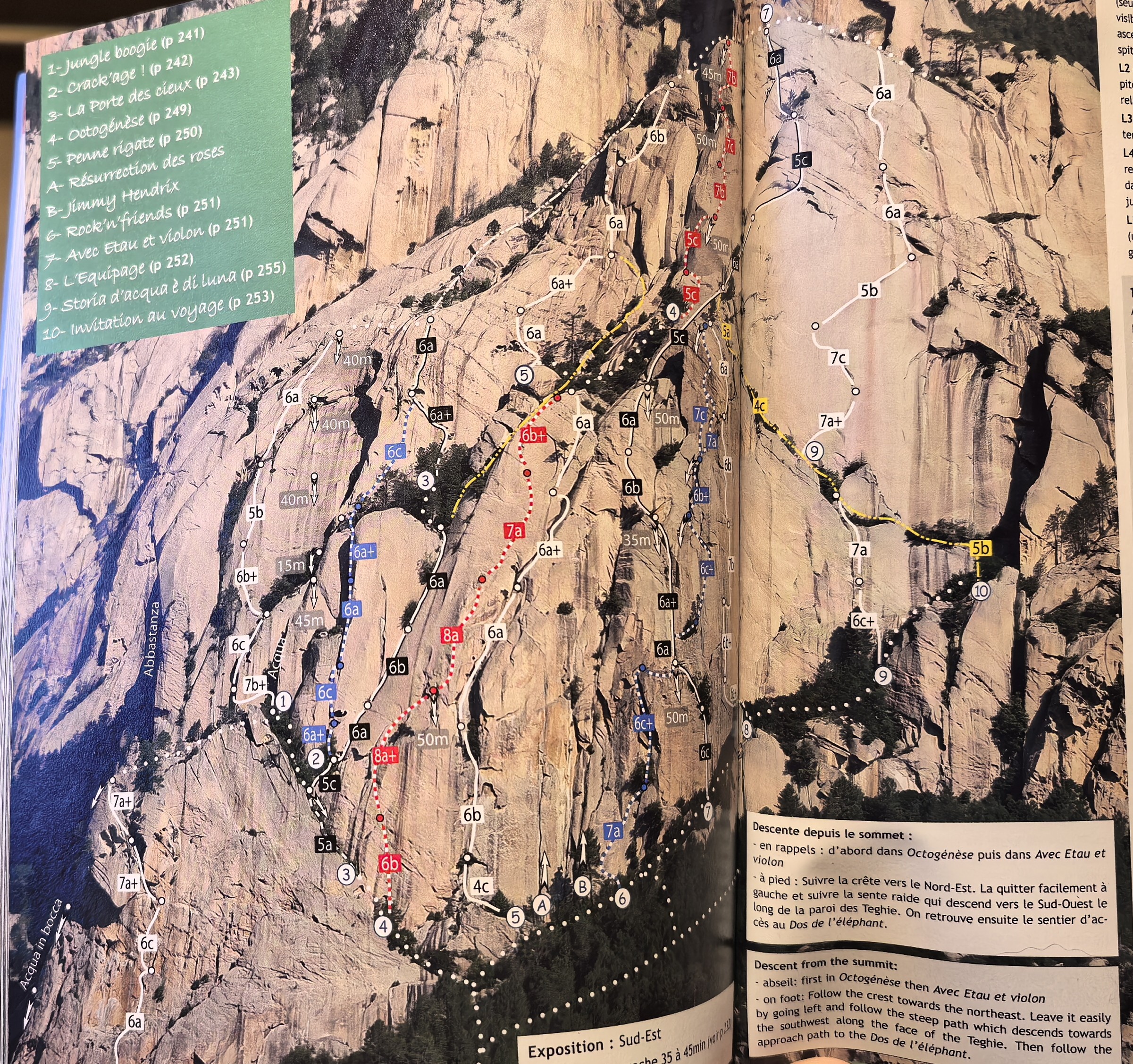 Podsumowując – droga, choć nieco mniej atrakcyjna od Acqua in Bocca, jest godna polecenia. Poza odstającym trudnościami pierwszym wyciągiem (który można przejść A0 jeżeli nie jest się dobrym off-widthowym wspinaczem) trzyma w trudnościach 6a-6b więc może stanowić łatwiejszą dla niej alternatywę wśród obitych linii na ścianie. Bo linie tradowe to już zupełnie inna historia – nawet na teoretycznie nisko wycenionych Porte des cieux (6b), Penne Rigate (6b) czy Crack’age (6c) nie ma co liczyć na taryfę ulgową, a słynna Abbastanza (7a+) to już zupełnie inna liga!