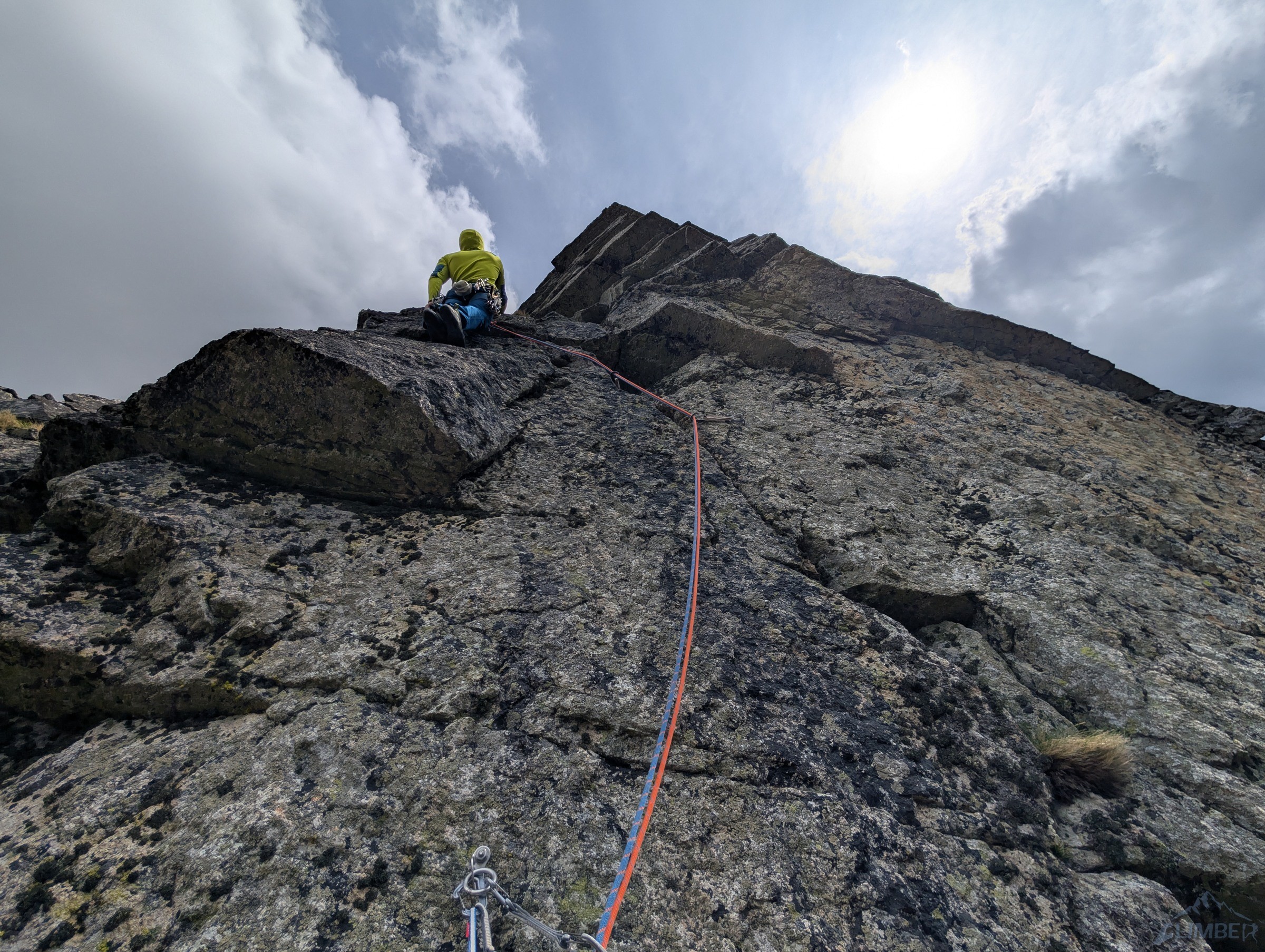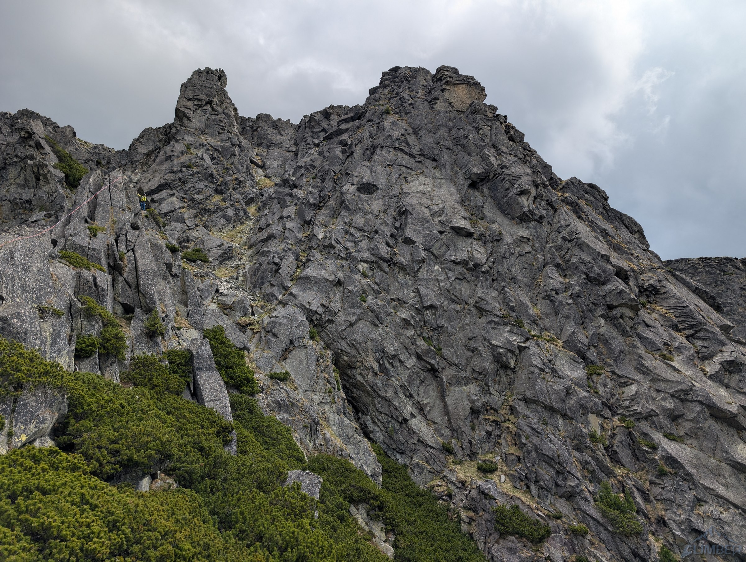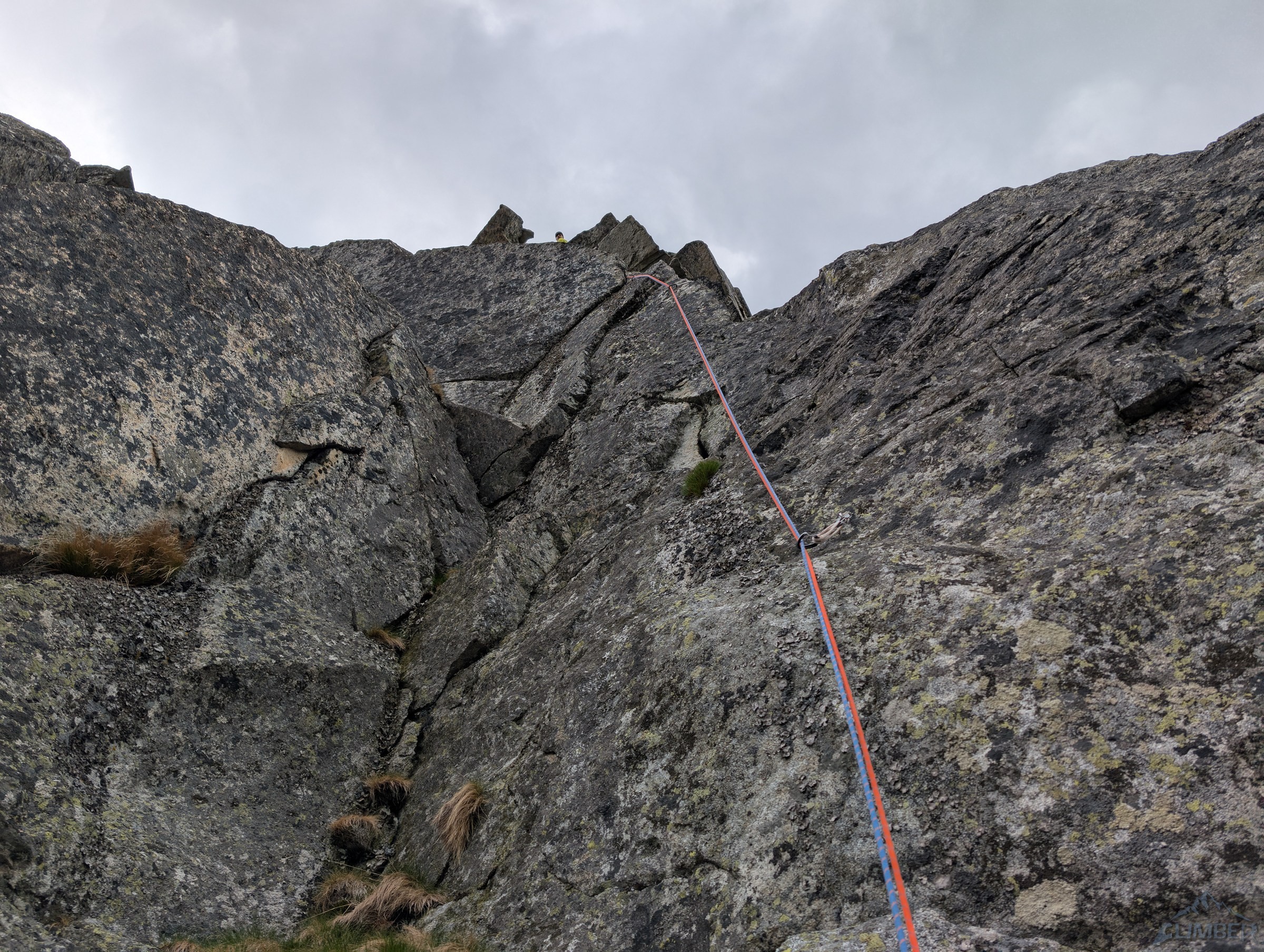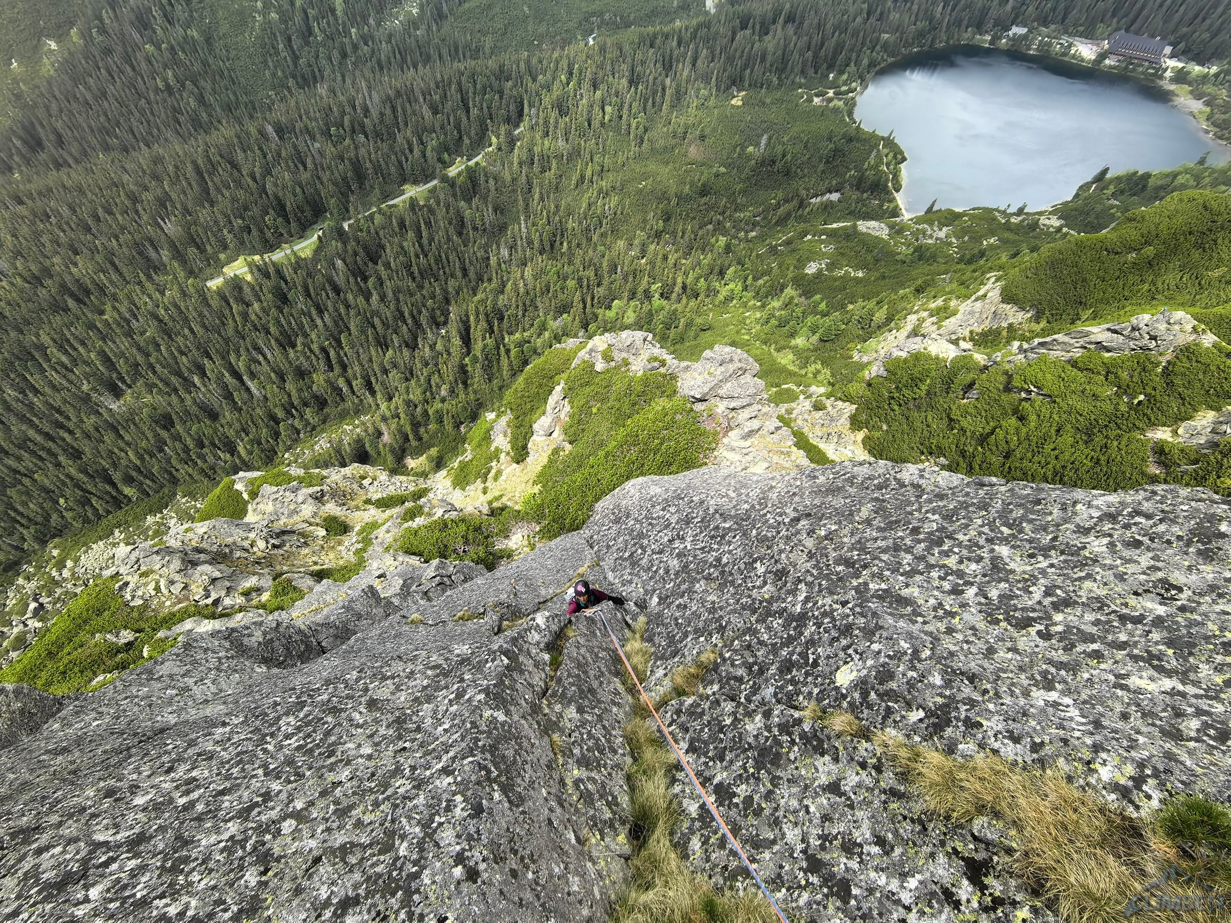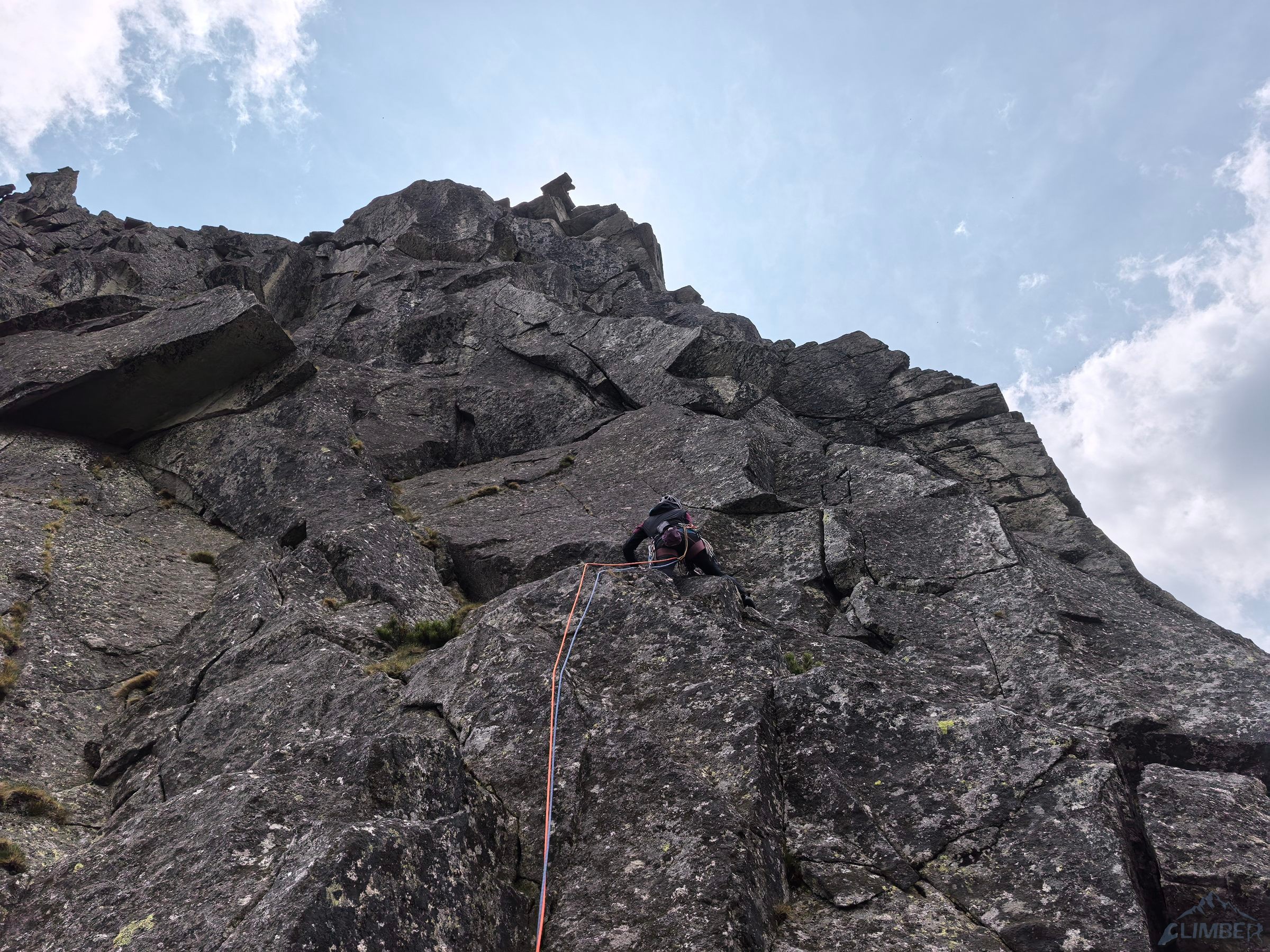 Pierwszy odcinek to urozmaicone 40 metrów wspinania płytami – linię drogi wyznaczają kolejne spity, miejscami trzeba trochę pokombinować i pokonać trudniejsze miejsca (VI+). Drugi odcinek zaczyna się nieco porośniętym ale łatwym połogiem, z którego kierujemy się do zacięcia ze spitami – kilka fajnych ruchów (przystępne jak na VII) i zmierzamy do stanowiska na półce pod wieńczące ścianę kaskadowe przewieszenie na lewo od wielkiej żółtej płyty. Na kluczowym wyciągu (VII+) trudności czekają już na starcie – pokonujemy ściankę z ryską (trudne dojście do spita, warto coś założyć) i wychodzimy na półeczkę pod okapem. Z niej przewijamy się w prawo (nie widać spita) i odbijamy do góry na techniczną ściankę (uwaga – dobra klama się urywa więc bez niej jest nieco trudniej) i mantlujemy na taras wieńczący ścianę. Stąd pozostaje nam do pokonania krótki uskok, po którym grań się wypłaszcza i dochodzi do ścieżki w kosówce – tam najlepiej się rozwiązać i kontynuować do Niżnich Wrótek.