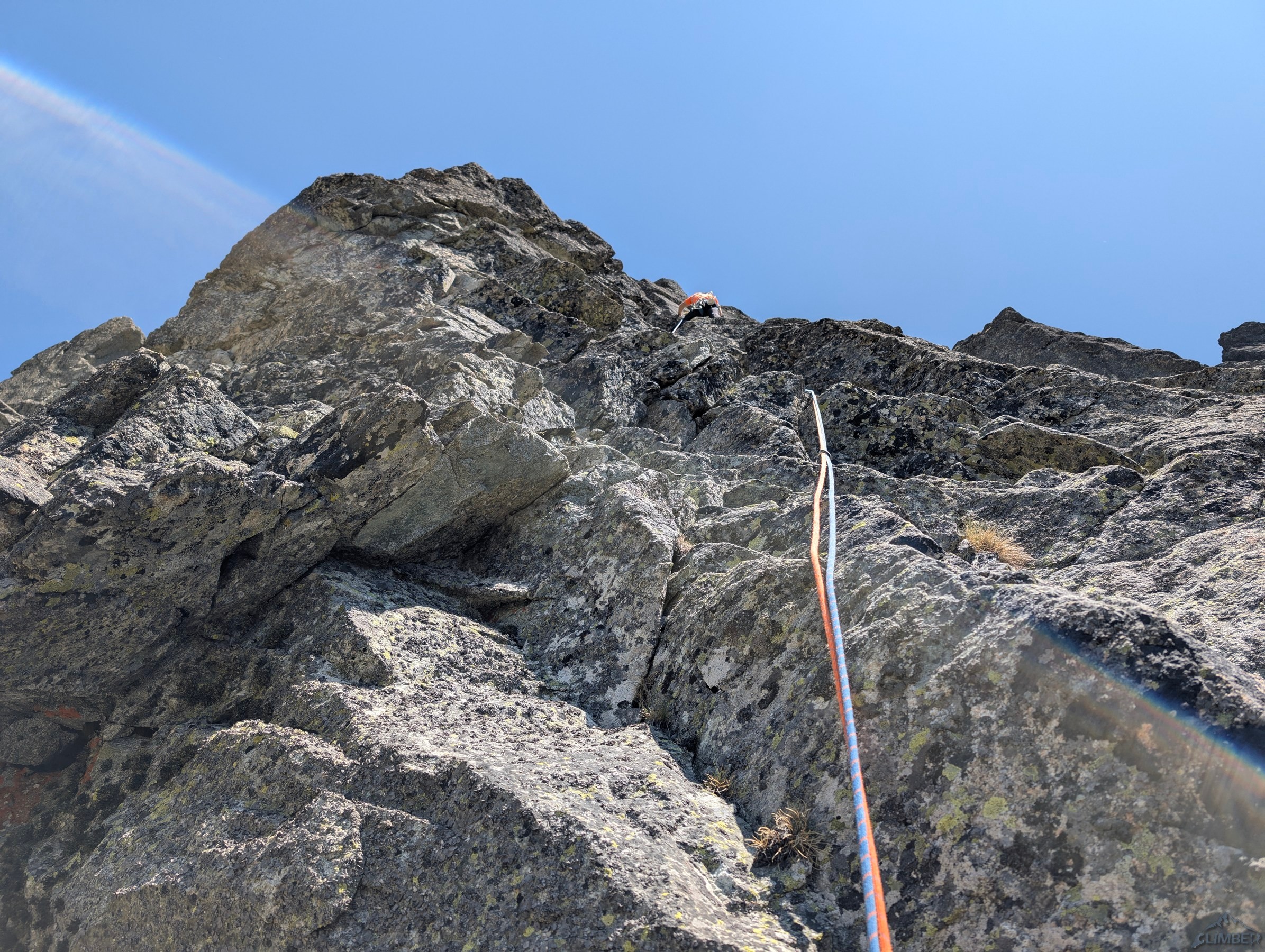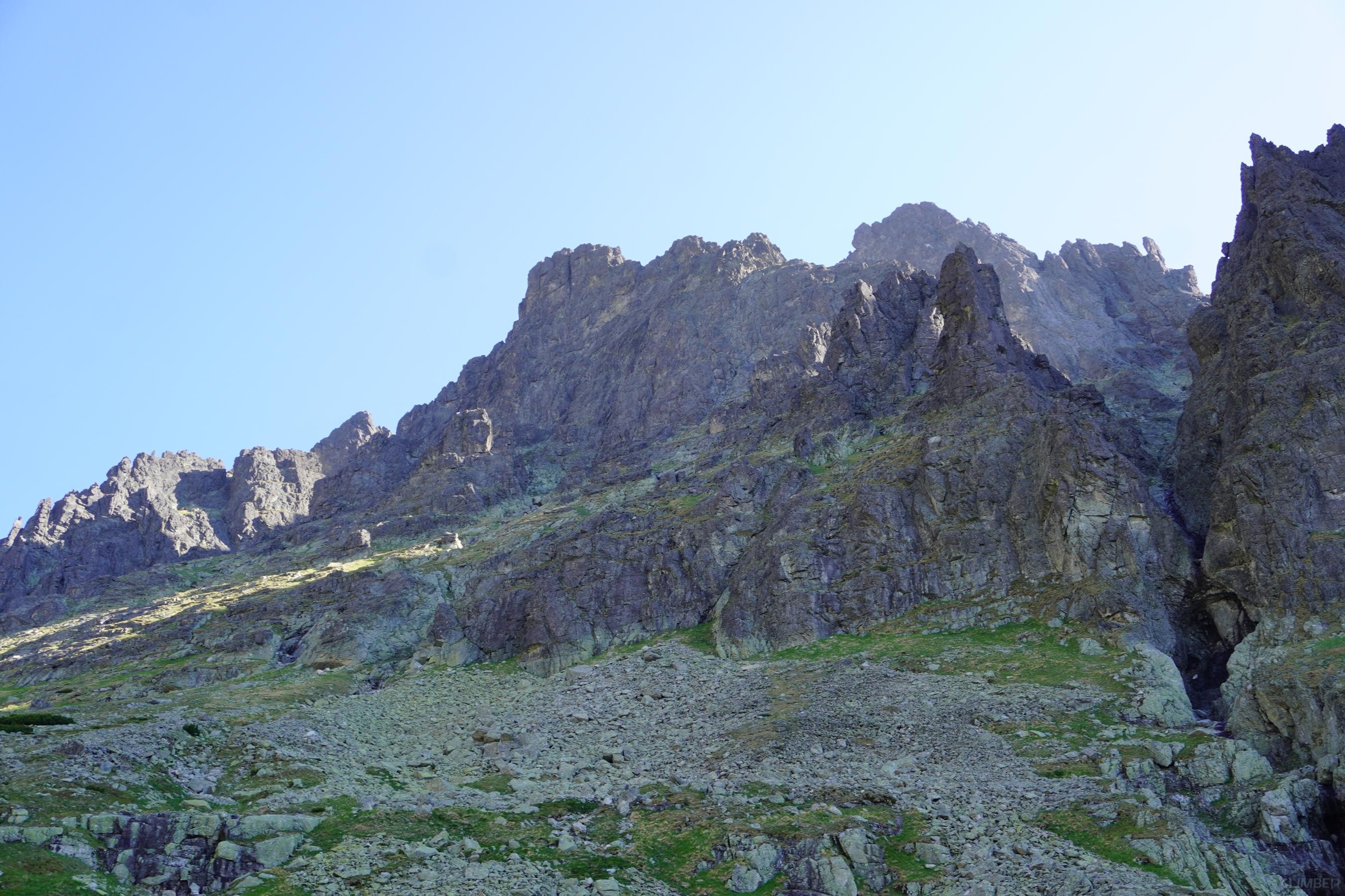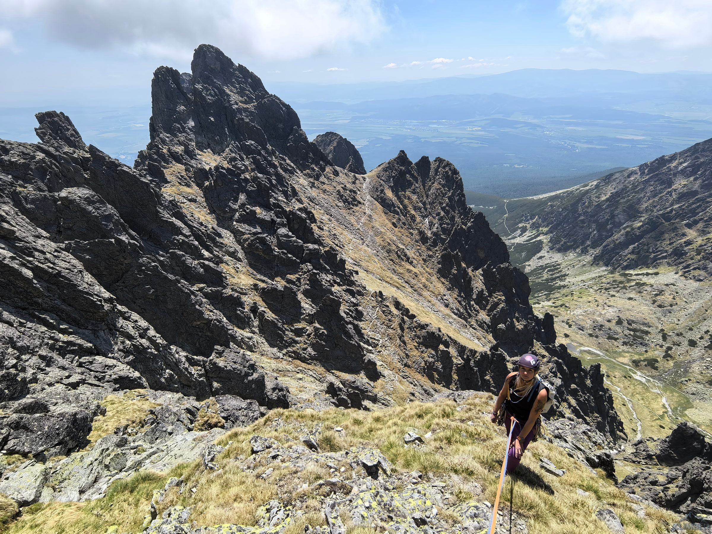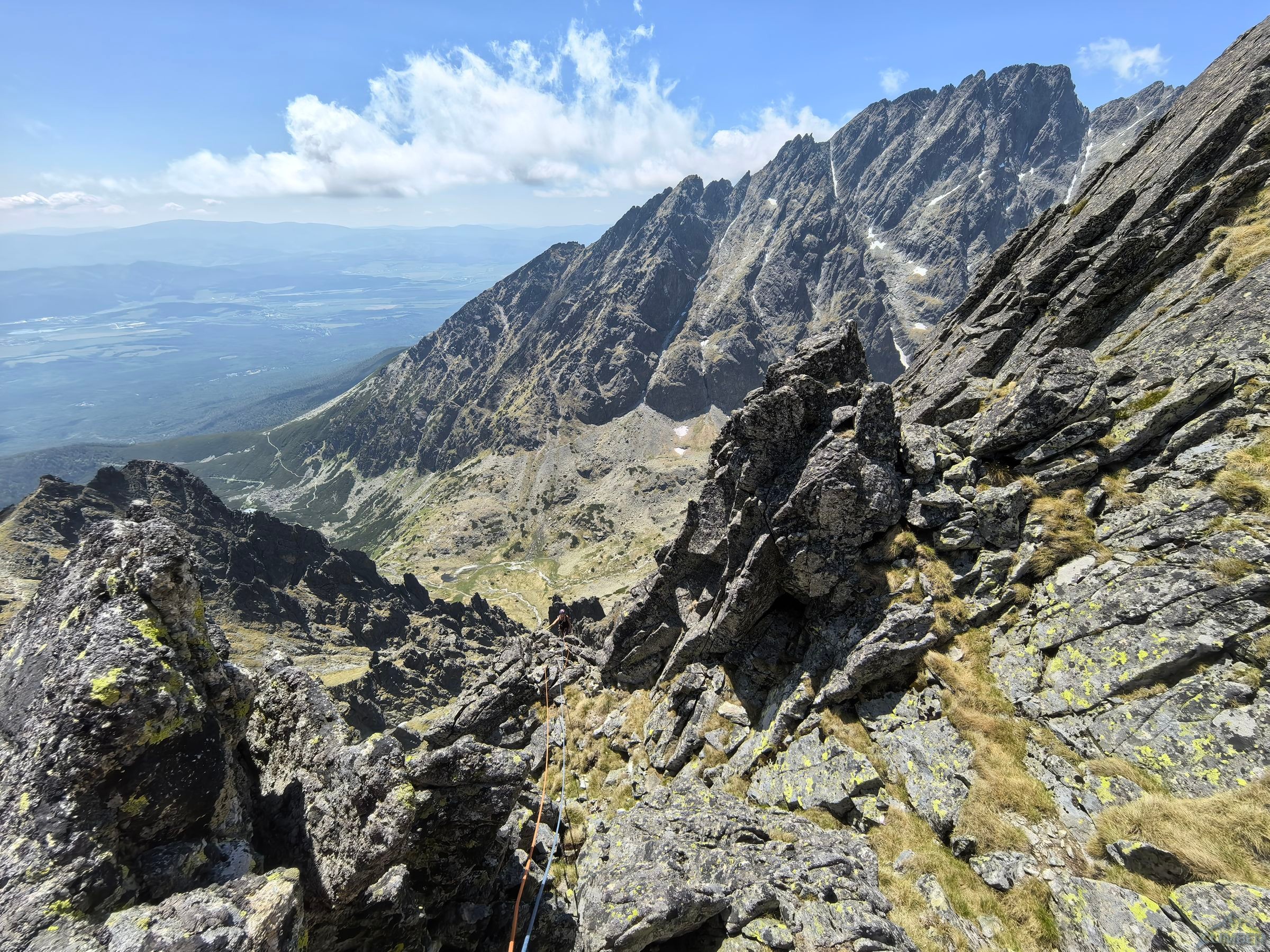 Po powrocie na Granacką Ławkę przechodzimy pod północno-zachodnią ścianę Wielickiej Baszty, która od dawna kusiła swoim efektownym wyglądem, a w zeszłym roku pojawiła się na niej nowa linia ze stanowiskami i kilkoma spitami - Vyhliadkový let (VII). Po 30 metrach wspinania okazuje się jednak, że by dojść do pierwszego spita w trudnościach trzeba pokonać dywan mchu, a wyżej nie wygląda to lepiej. Nie mając szczotki oraz wystarczającej ilości sprzętu i zapasu czasu decyduję, że nie warto ryzykować oraz stresować partnerki i zjeżdżam z taśmy zabezpieczonej kostką. Może kiedyś uda się wrócić, w międzyczasie gdyby ktoś się wybrał proszę o sprzątnięcie sprzętu i podzielenie się wrażeniami z drogi. My tymczasem wracamy na Granacką Ławkę i trawersujemy masyw do końca, po czym schodzimy do Domu Śląskiego – wyszło sporo kilometrów chodzenia i niewiele wspinania ale trzeba było się z tym liczyć wybierając do łańcuchówki niezbyt często powtarzane drogi 😉.