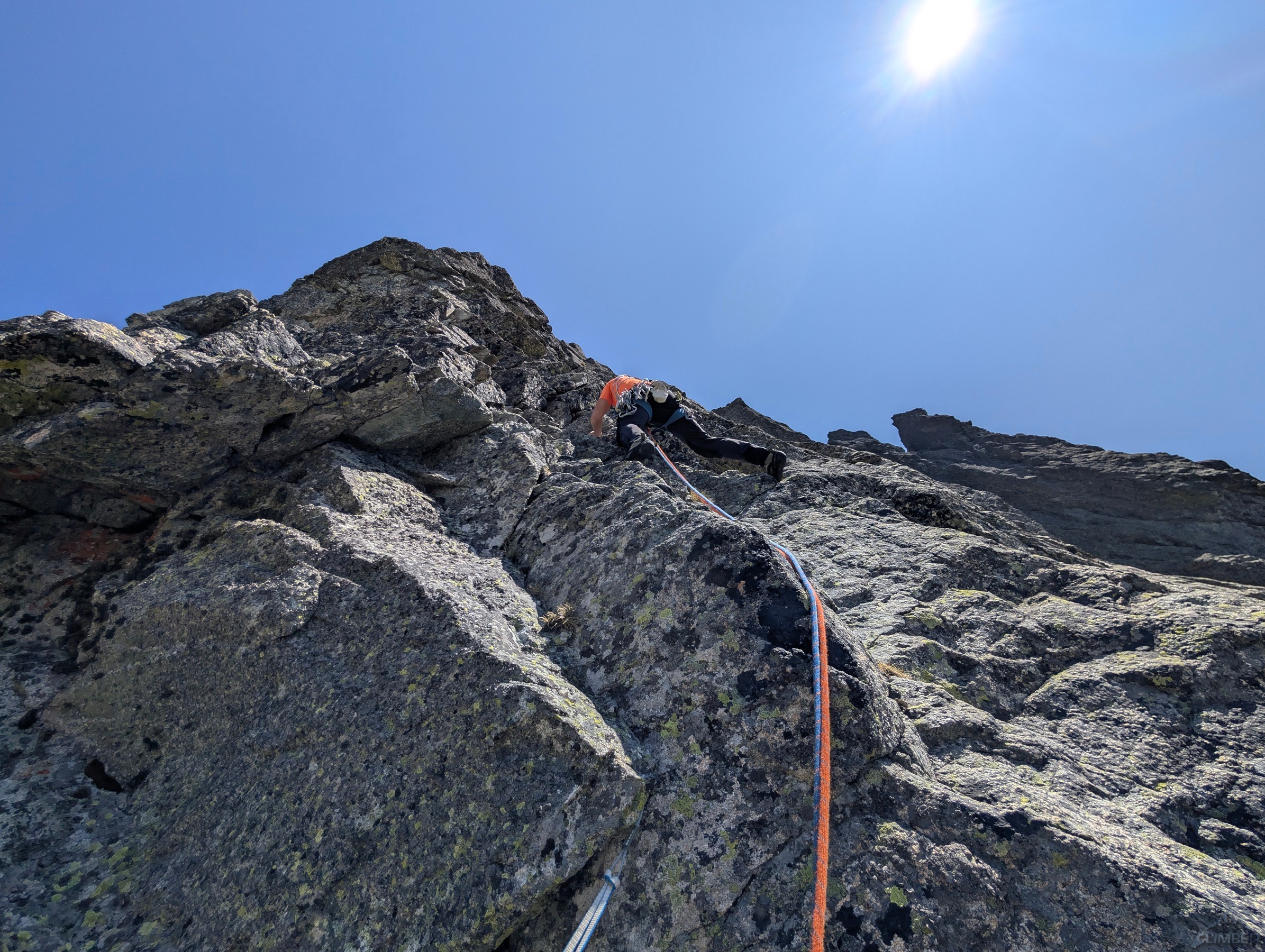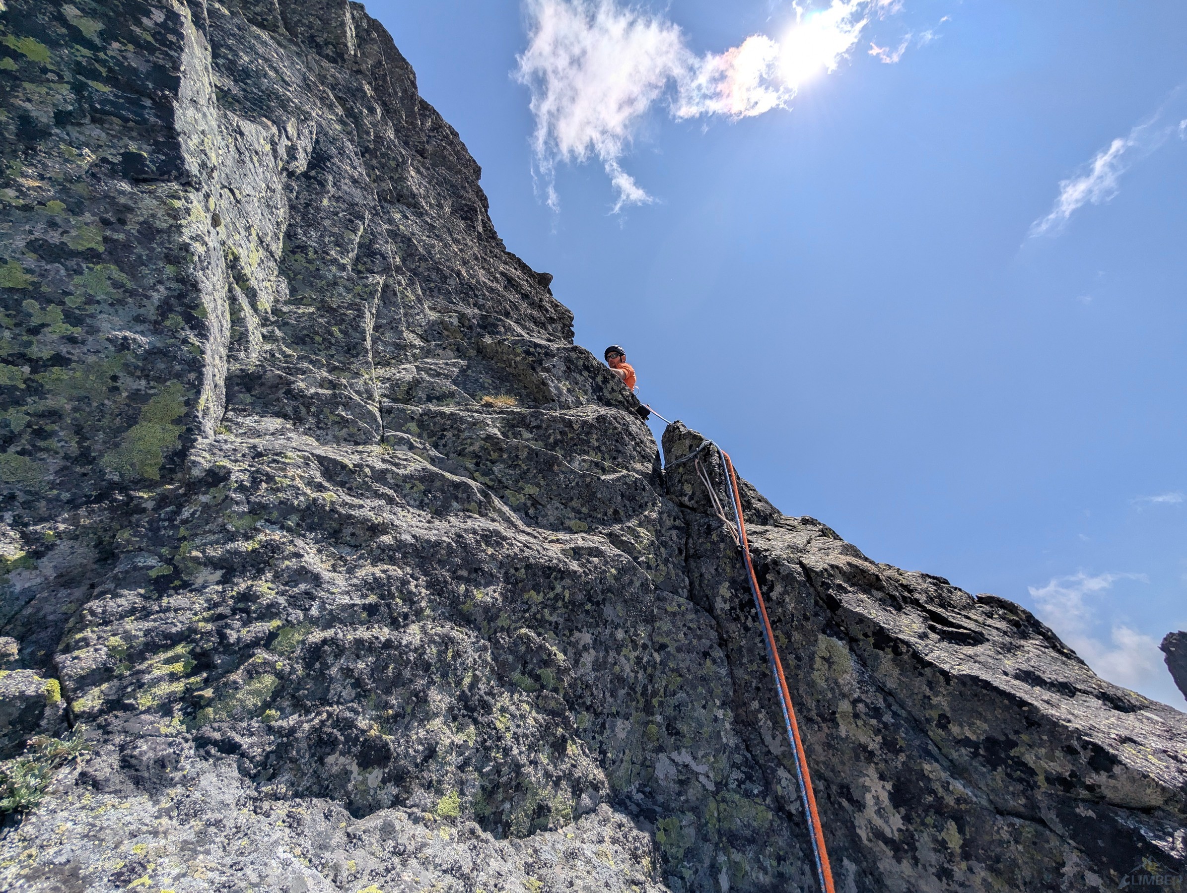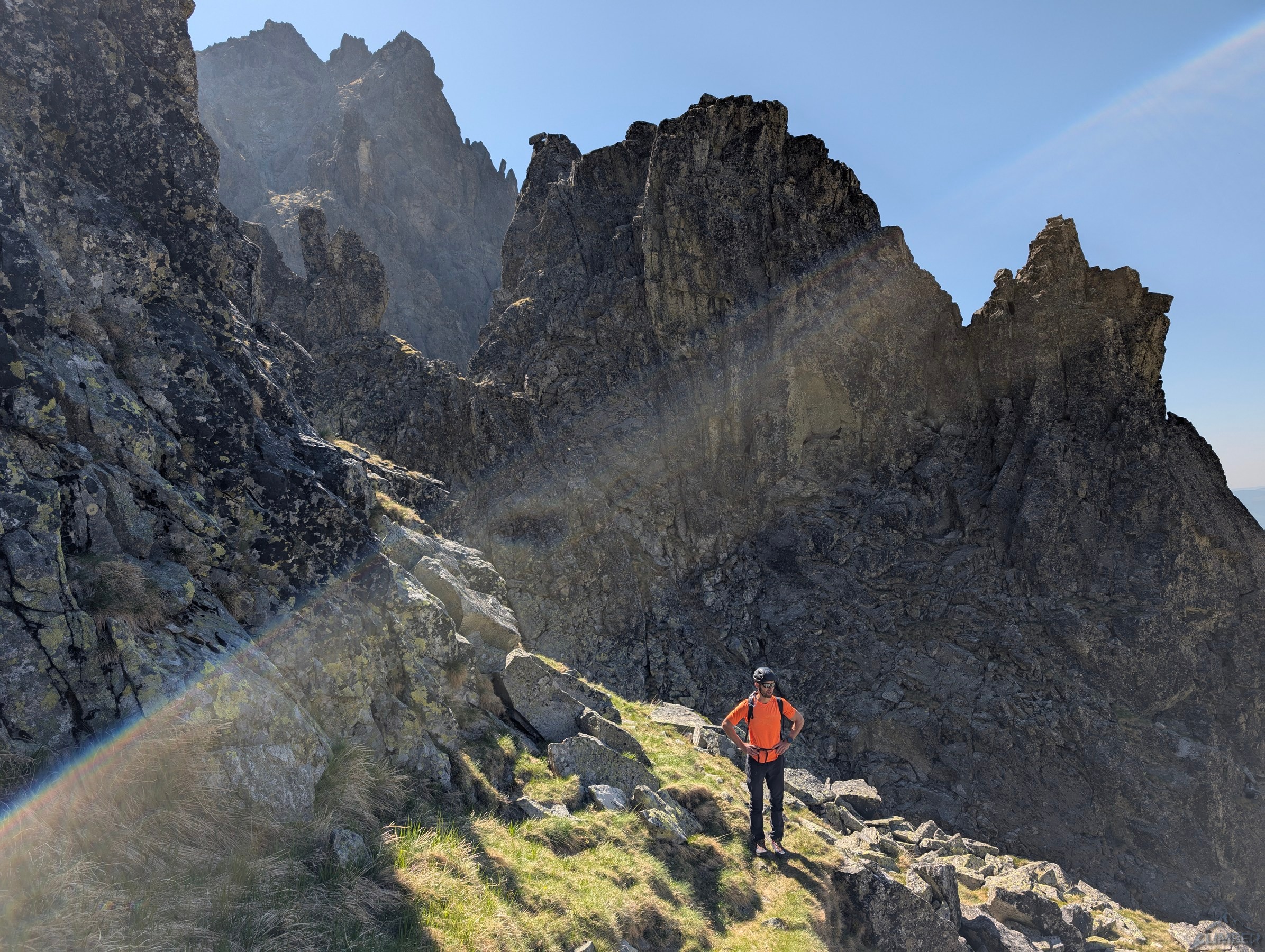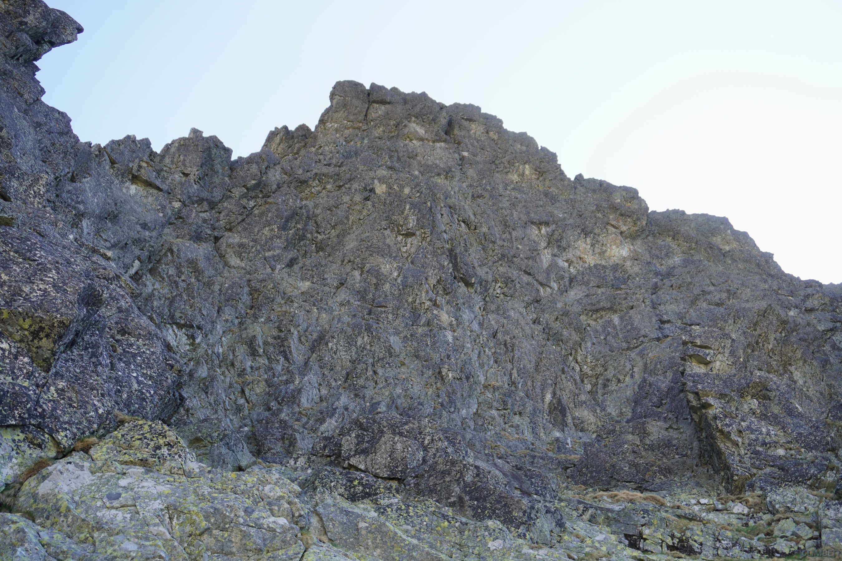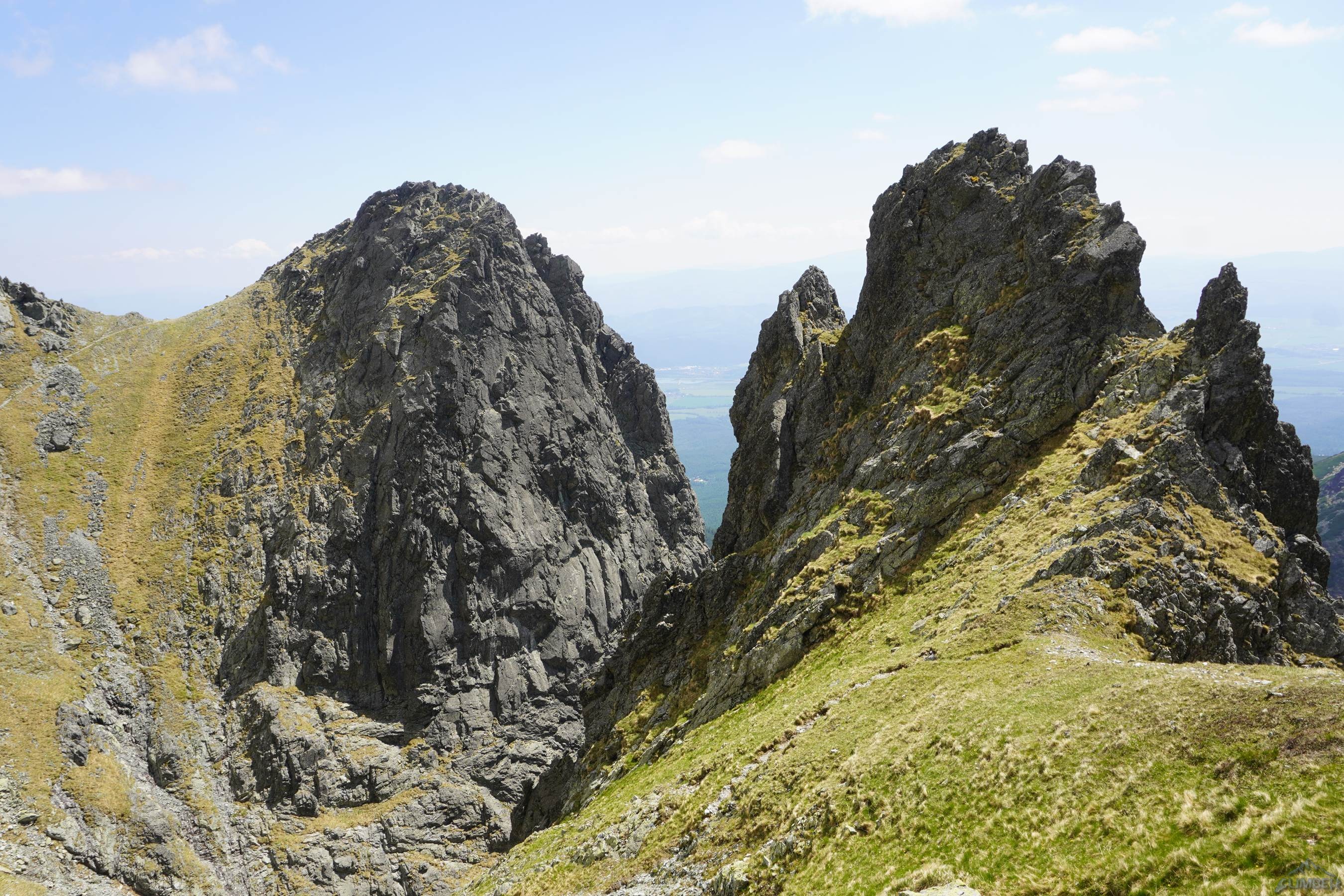 Po powrocie na Granacką Ławkę przechodzimy pod północno-zachodnią ścianę Wielickiej Baszty, która od dawna kusiła swoim efektownym wyglądem, a w zeszłym roku pojawiła się na niej nowa linia ze stanowiskami i kilkoma spitami - Vyhliadkový let (VII). Po 30 metrach wspinania okazuje się jednak, że by dojść do pierwszego spita w trudnościach trzeba pokonać dywan mchu, a wyżej nie wygląda to lepiej. Nie mając szczotki oraz wystarczającej ilości sprzętu i zapasu czasu decyduję, że nie warto ryzykować oraz stresować partnerki i zjeżdżam z taśmy zabezpieczonej kostką. Może kiedyś uda się wrócić, w międzyczasie gdyby ktoś się wybrał proszę o sprzątnięcie sprzętu i podzielenie się wrażeniami z drogi. My tymczasem wracamy na Granacką Ławkę i trawersujemy masyw do końca, po czym schodzimy do Domu Śląskiego – wyszło sporo kilometrów chodzenia i niewiele wspinania ale trzeba było się z tym liczyć wybierając do łańcuchówki niezbyt często powtarzane drogi 😉.