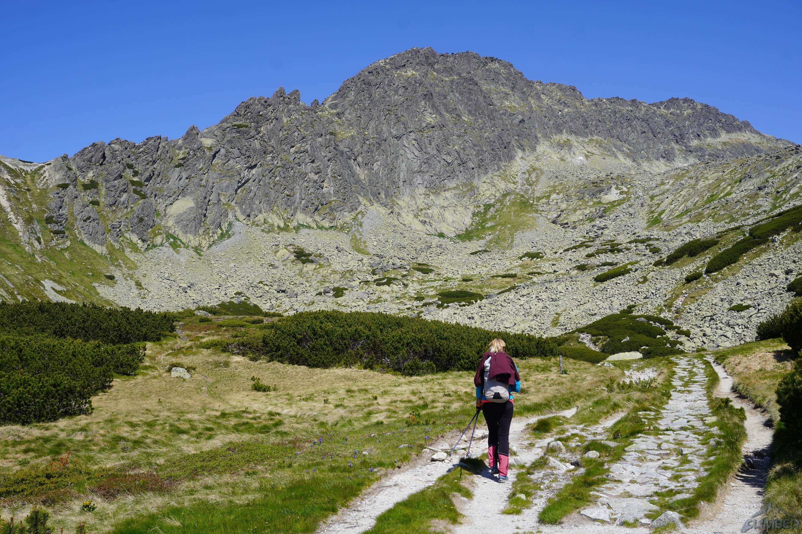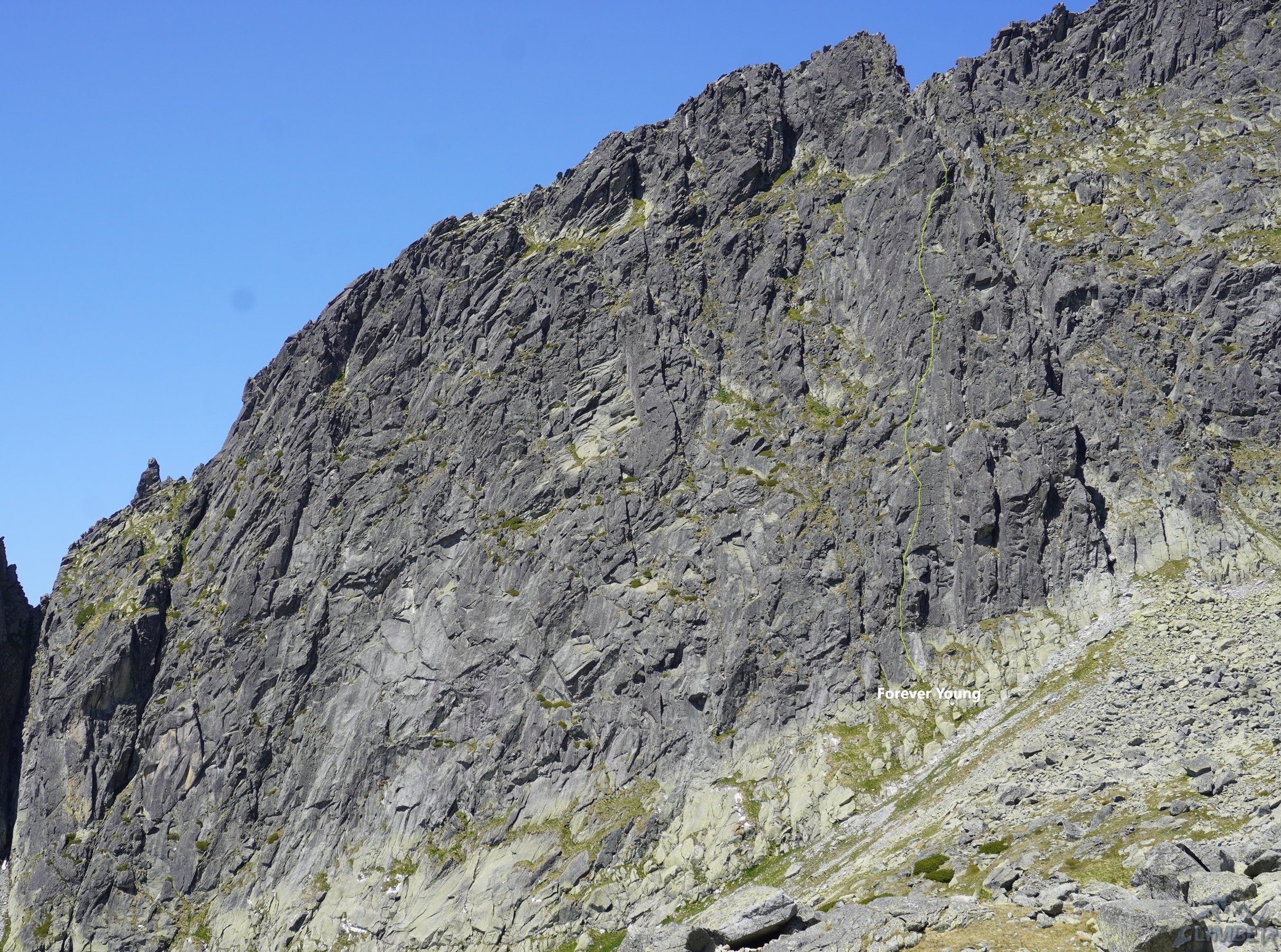 By oszczędzić nogi, drogę pod ścianę skrócić można sobie kolejką – po wyjechaniu pod Solisko czeka nas trawers do Doliny Furkotnej i godzinny spacer z ok. 300m różnicy wysokości na podejściu. Nie startując zbyt późno i nie grzebiąc się spokojnie zdążyć można na kolejkę powrotną (do 16:45) – my nie spełniamy tych warunków, spóźniamy się kilka minut i czeka nas dodatkowa godzina na zejściu 😉. Pod Prawy Filar dotrzeć można trawersując skośnie pod ścianą, wygodniej jednak iść szlakiem aż pod Niżni Wielki Furkotny Staw i przejść w poziomie. Forever Young startuje na trawiastej półce na lewo od wejścia w drogę (ciekawą ale dość porośniętą) Lewa Ściana Prawego Filara i biegnie równolegle do niej – na początku jest spit z karabinkiem.