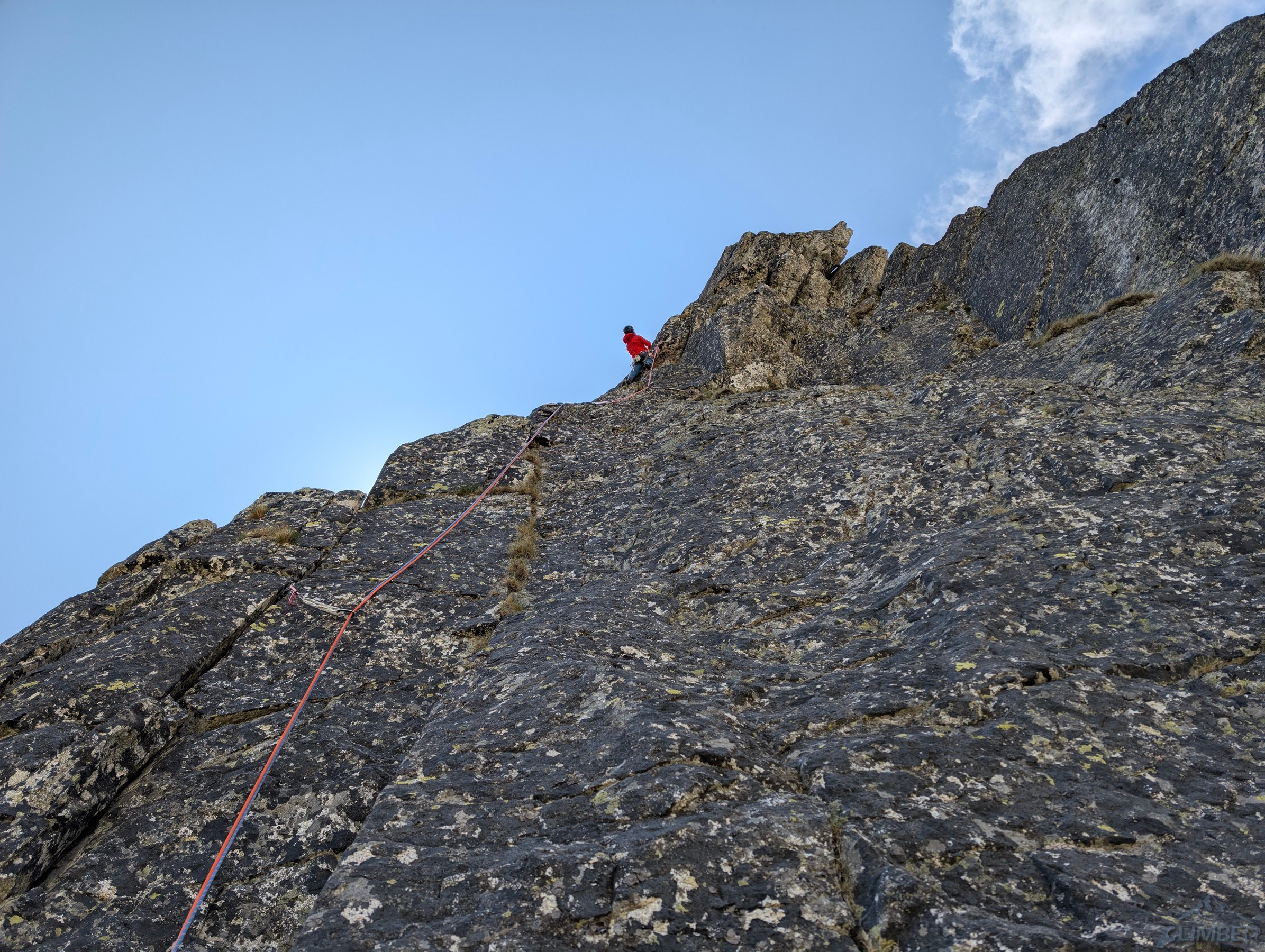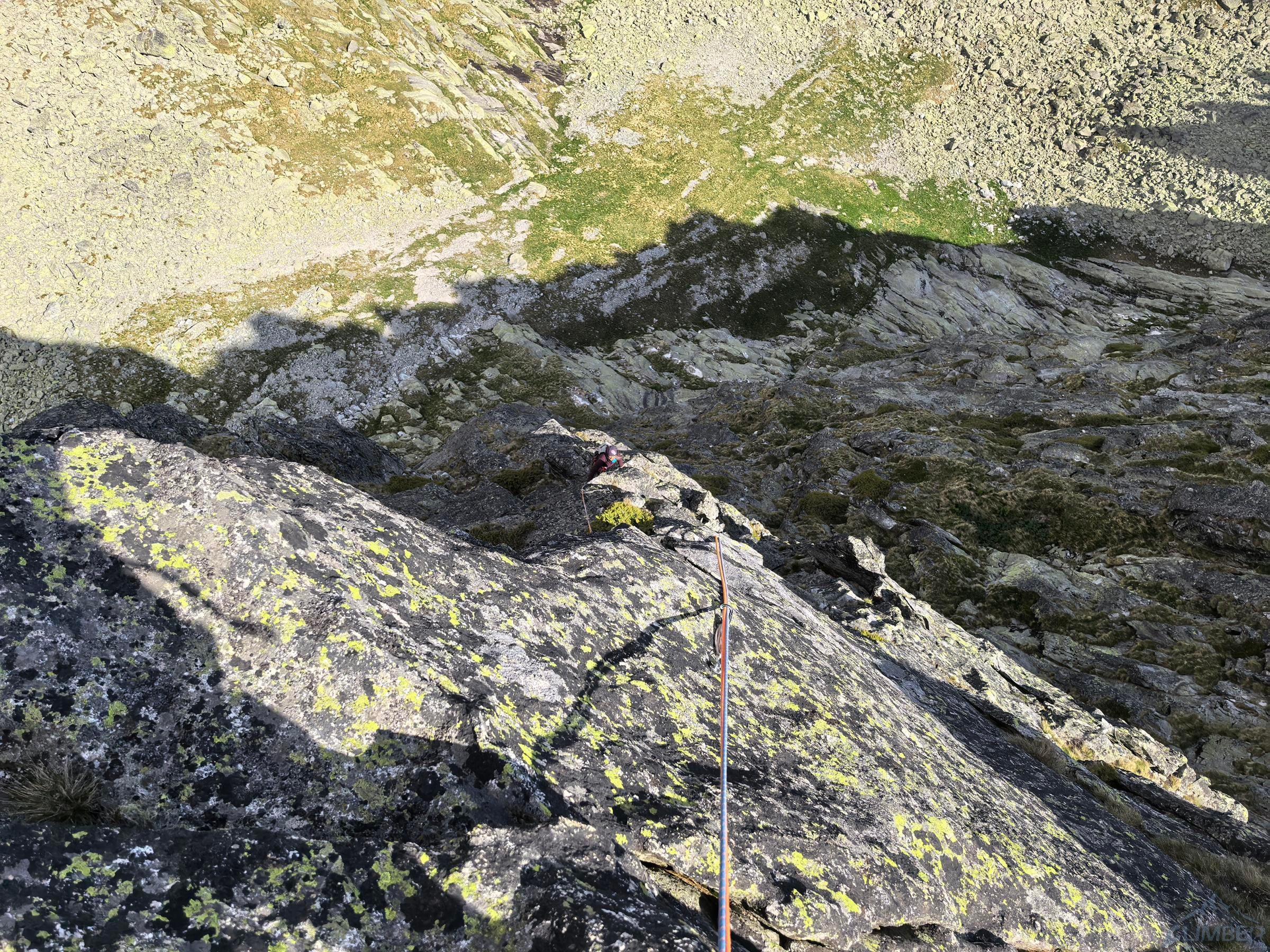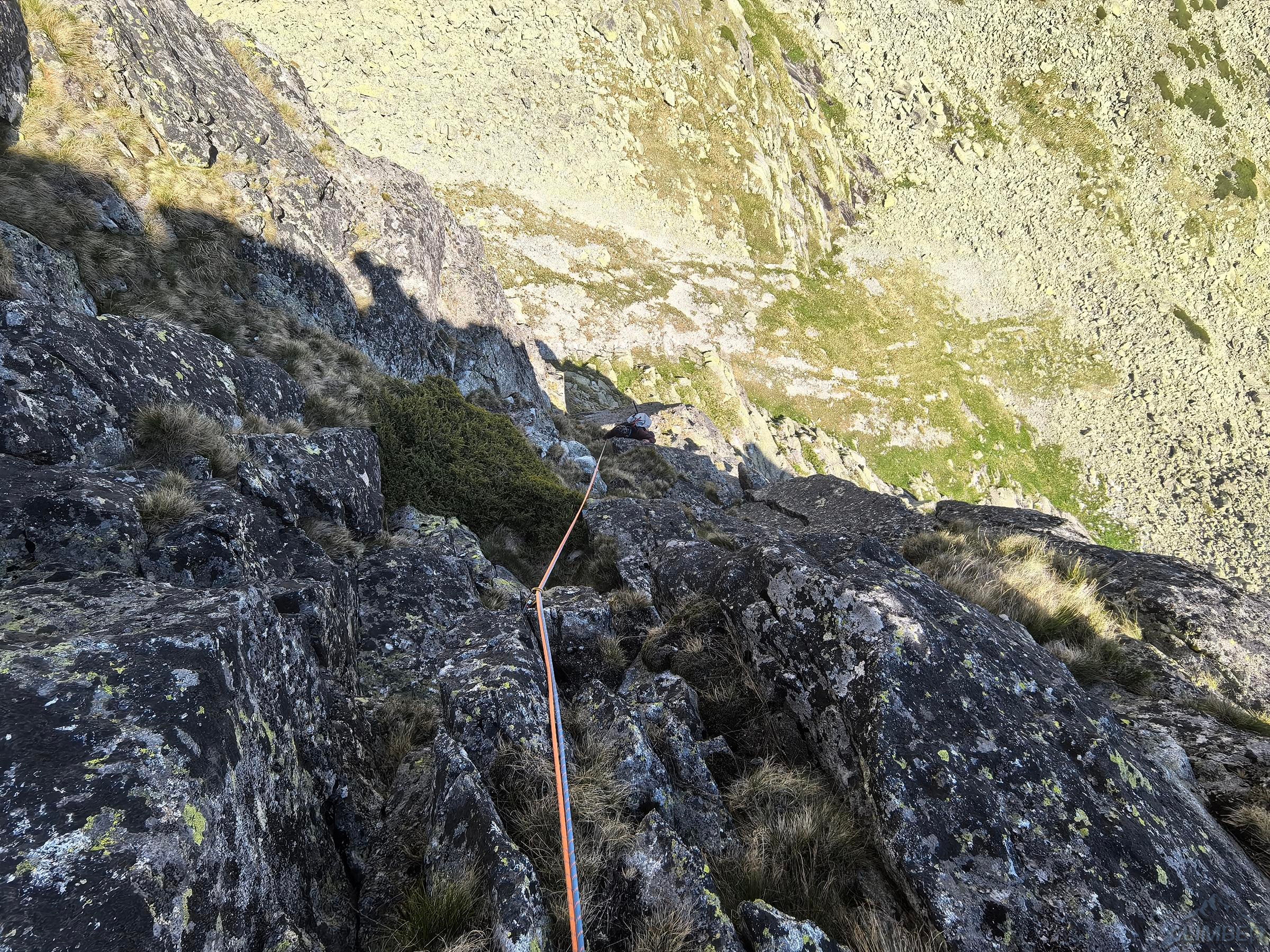 Po ochłonięciu na stanowisku oraz wyproszeniu partnerki żebyśmy mogli kontynuować, ruszamy w drugi wyciąg. Ten na szczęście okazuje się ładny, lity i dobrze asekurowalny – jest co prawda tylko jeden spit ale spora liczba rys umożliwia zakładanie wielu własnych przelotów. Idziemy filarkiem do góry (V+) i odbijamy przy bolcie skośnie w prawo wzdłuż pęknięć (VI+) aż do zacięcia wyprowadzającego na trawiastą półkę. Po podejściu kilkanaście metrów do góry i w lewo (duża kosówka) czeka nas ciekawy okapik (VI-) i stanowisko zaraz powyżej. Trzeci wyciąg również oferuje ciekawe i przyjemne wspinania – idziemy wzdłuż rys po lewej (V) do kantu (widoczny spit) i przewijamy się przez niego na połogą płytkę z krótkim technicznym miejscem (bardziej VI+ niż VII-) ubezpieczonym drugim punktem. Na koniec zostaje nam krótki 15-metrowy wyciąg rozpoczynający się efektownym przewinięciem między przewieszkami z trzema blisko umieszczonymi sptiami. Dobrze balansując czekają nas tylko dwa trudniejsze ruchy (VII) i łatwy odcinek do stanowiska pod zwieńczeniem filara - całość udaje zrobić się więc OS-em.