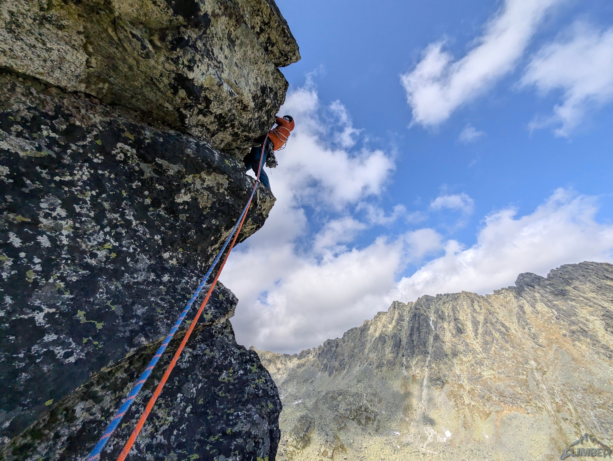 Wspinanie zaczynamy łatwym terenem (IV) w kierunku szerokiej rysy między przewieszkami – pokonanie jej i wejście do zacięcia powyżej to trudności tego wyciągu (VII-, dwa spity). Wyżej czeka kilka łatwych metrów i odbicie w prawo obok kolejnego spita – zdecydowanie warto rozważyć stanowisko pośrednie gdyż jest wygodna półka. Gdy tego nie zrobimy czeka nas w sumie prawie 60 metrów wspinania - jeżeli nie mamy dodatkowego sprzętu (normalnie wystarcza zestaw friendów 0,2-2 i kostki) to czeka nas stres i szarpanie się z liną w dość kruchym terenie pod koniec wyciągu. Stan ten zasugerowali zresztą sami autorzy po naszym przejściu więc jest oficjalne przyzwolenie jeżeli ktoś by miał wątpliwości 😉. Ja jednak idę dalej i po przewinięciu na porośniętą ściankę (VI-) wpadam w tarapaty bo nie mam czym się asekurować, do tego odbijam za wcześnie w lewo i ląduję na półeczce nad którą czeka gładka porośnięta ścianka. Po spędzeniu w tym miejscu pół godziny w końcu zbieram się na odwagę i wracam gdzie trzeba, kosztuje to jednak sporo nerwów zarówno mnie jak i Anię z którą mam tylko radiowy kontakt.