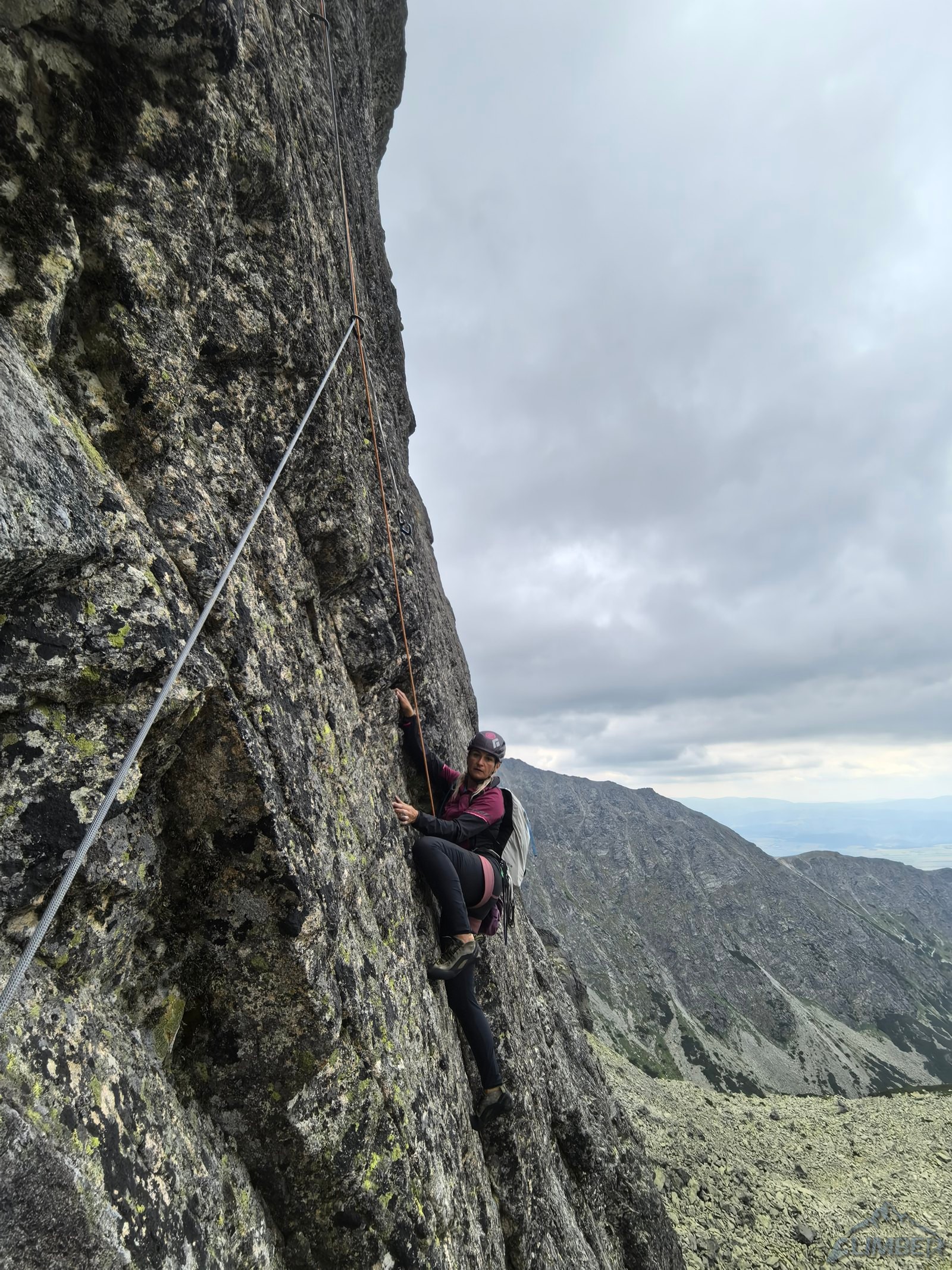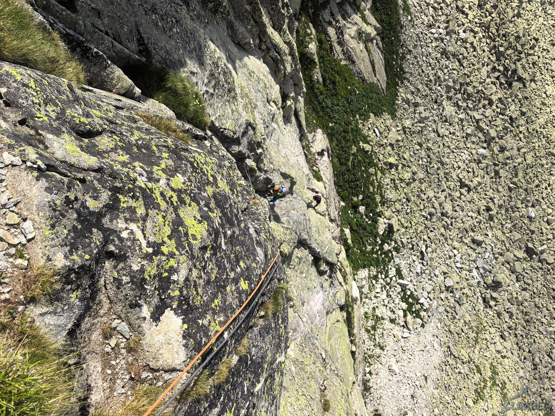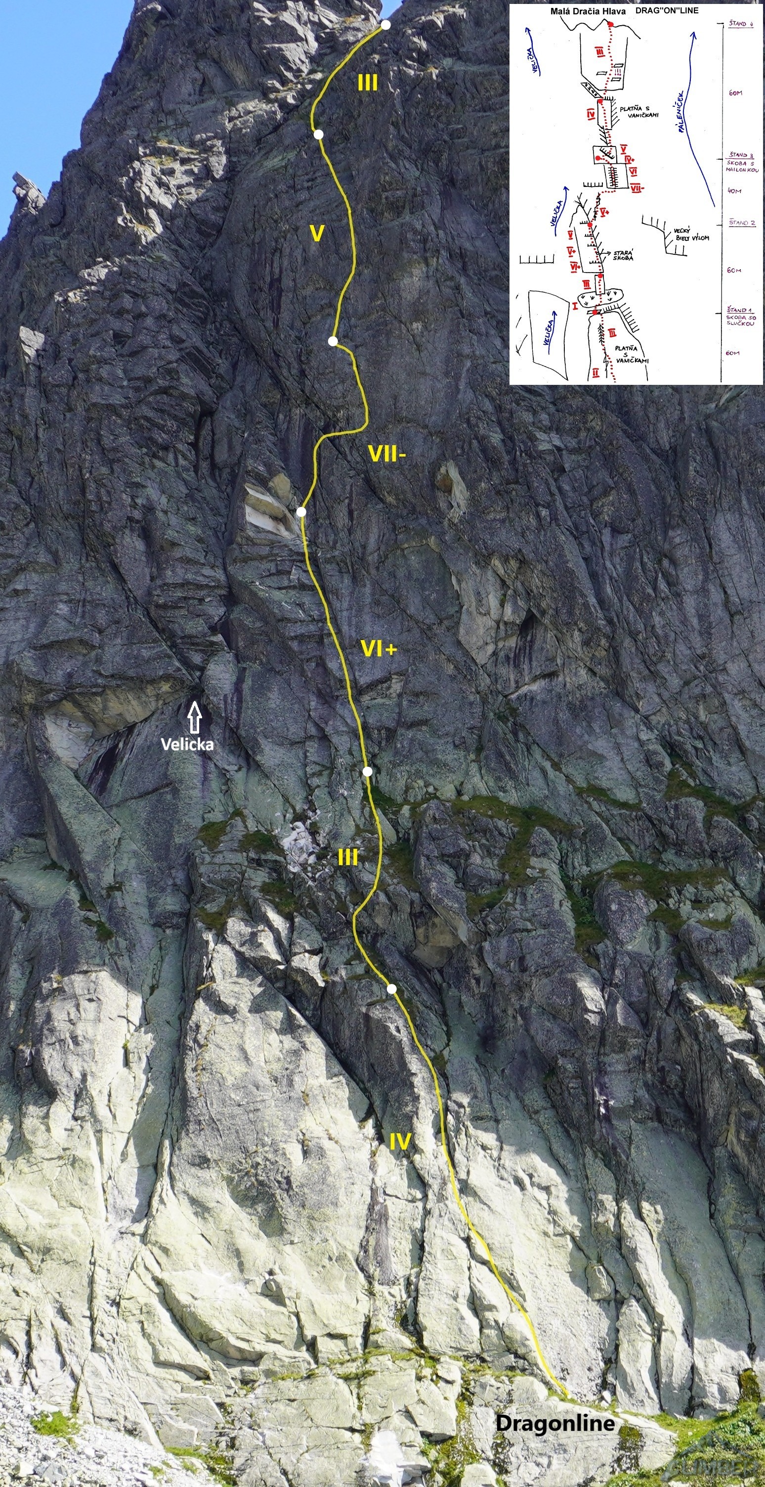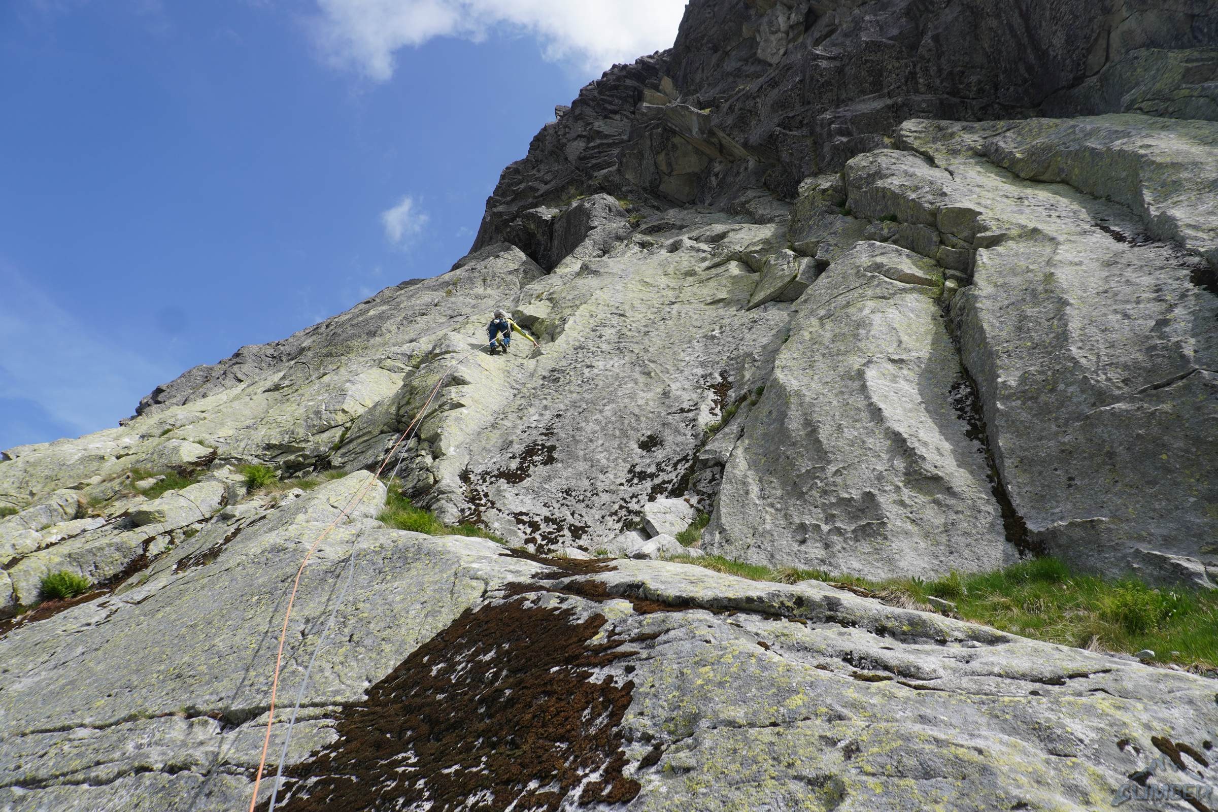 Droga startuje ok. 50 metrów od wejścia w Veličkov Kut, który robiłem zresztą (RELACJA) w podobnej kombinacji do tej zaplanowanej na dziś, z Siarkańską Granią i Drogą Motyki na zachodniej ścianie Szarpanych Turni – opcji na linkowanie jest oczywiście więcej, polecam 😊. Wspinanie na Dragonline zaczynamy u podstawy ściany, pod płytą z mchem lub z poziomej trawiastej półki zaraz nad nią. Przechodzimy filarkiem do systemu wyraźnych zacięć (III/IV) którymi kontynuujemy aż do stanowiska zlokalizowanego na balkonie pod okapem. Znajdziemy tutaj łańcuch zjazdowy, podobnie jak na każdym kolejnym stanowisku – dzięki temu orientacja jest znacznie łatwiejsza. Drugi wyciąg (III) to najmniej ciekawy i przyjemny odcinek drogi – obchodzimy okap trawnikiem w lewo i trawersujemy przez kruchy teren (który ucierpiał z powodu obrywu powyżej) w prawo, po czym wąską połogą płytą z rysami wprost do widocznego powyżej stanowiska.