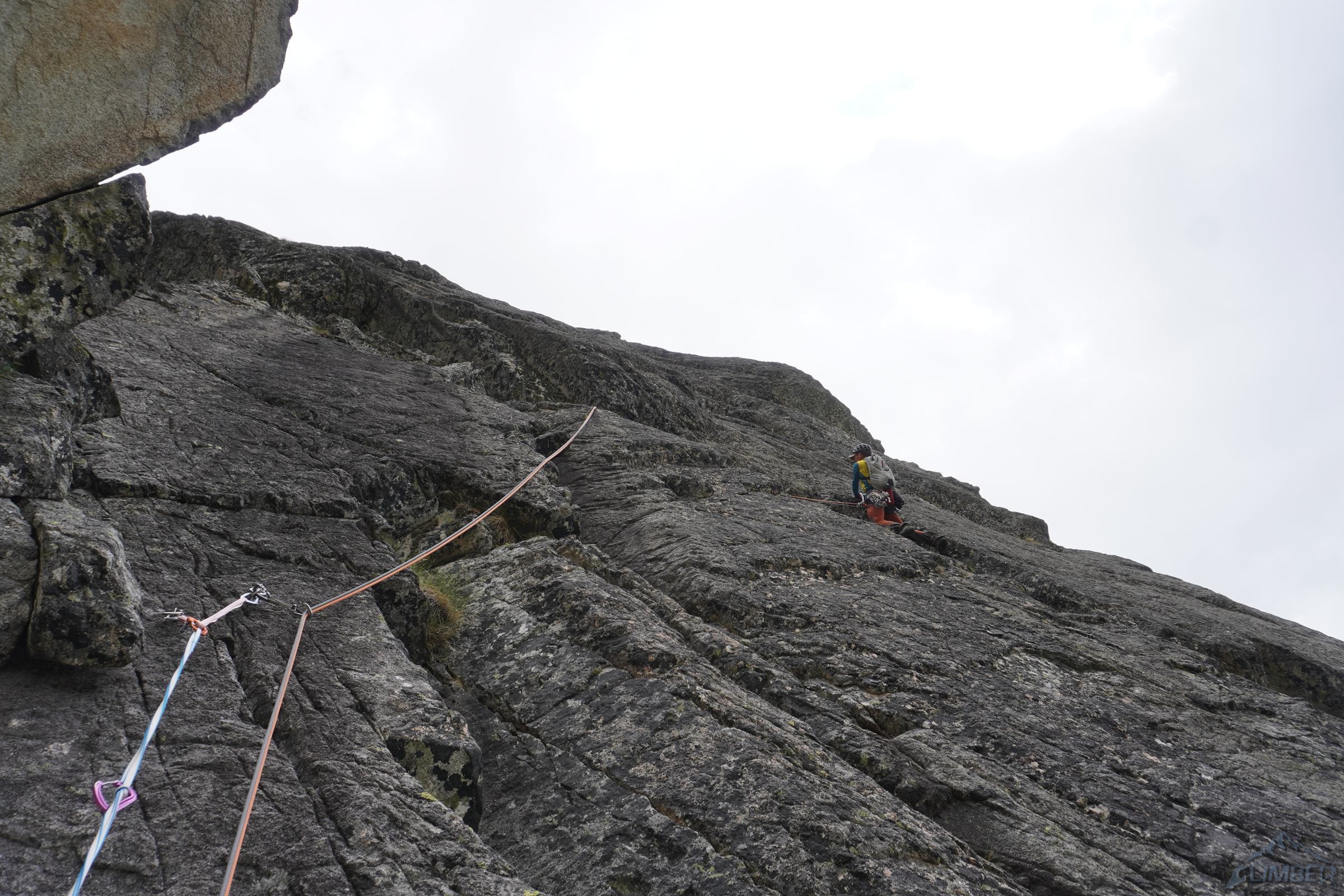 Kluczowy czwarty wyciąg zaczynamy od pokonania szerokiej rysy na prawo od stanowiska (V+), po wyjściu z niej trawersujemy mocno (uwaga na przesztywnienie!) w prawo i lekko w dół by w najbardziej dogodnym miejscu wejść w niewyraźną rysę rozszerzającą się wyżej – ponownie asekurujemy się z małego frienda/kostki (lub bijemy haka) i ostrożnie pokonujemy wymagający (VII-) odcinek. Zmęczony i z bolącymi stopami w sportowych butach szczerze ucieszyłem się że Bartek prowadził ten wyciąg 😉 – jest bowiem całkiem sprężny, a skała porośnięta. Wyżej trudności odpuszczają (VI), na koniec czeka jednak czujny trawers w lewo do łańcucha.