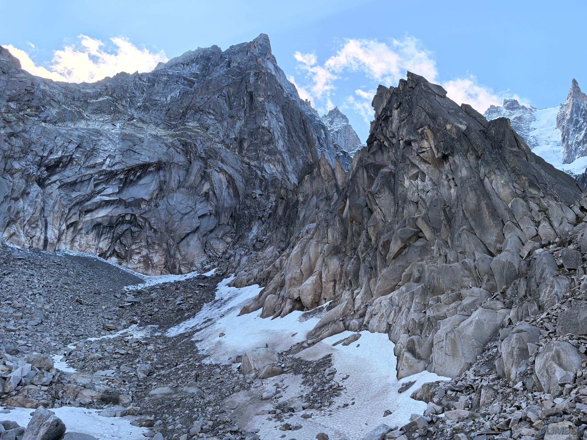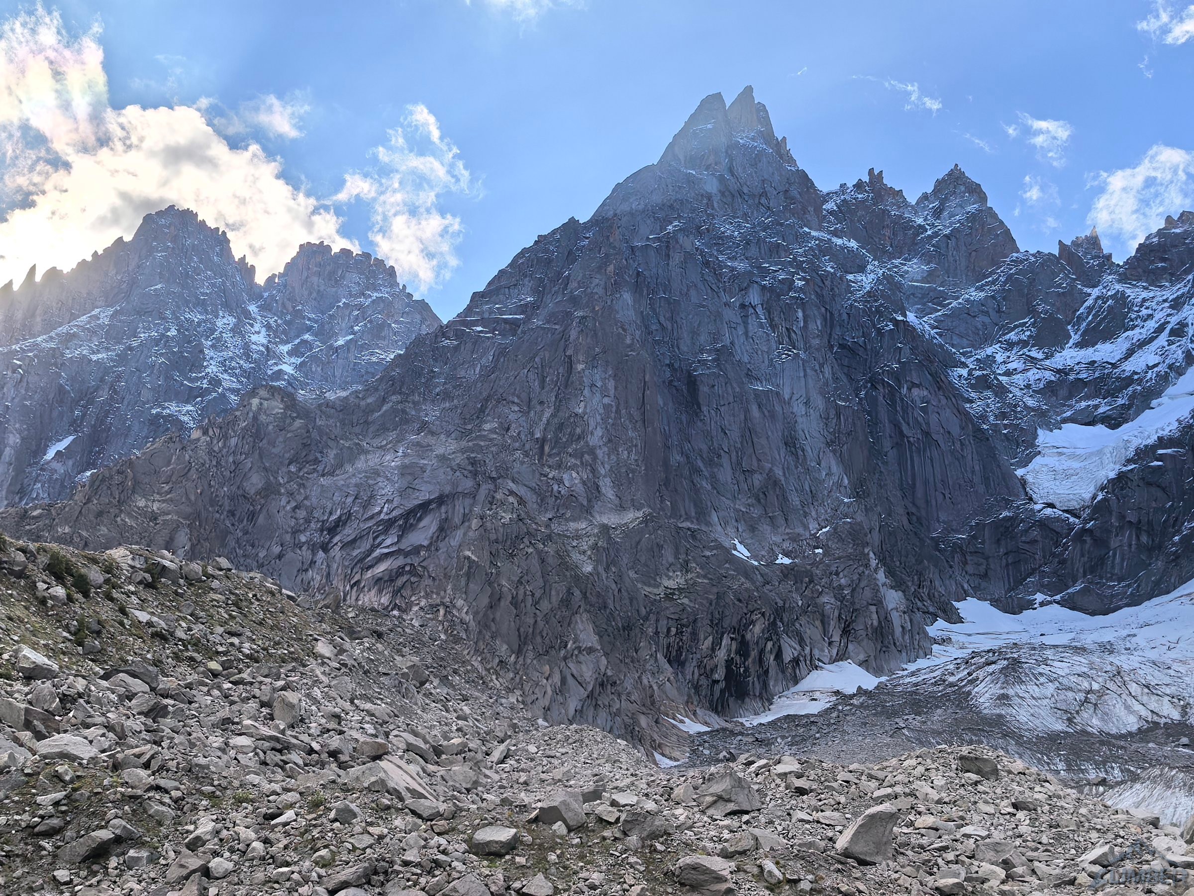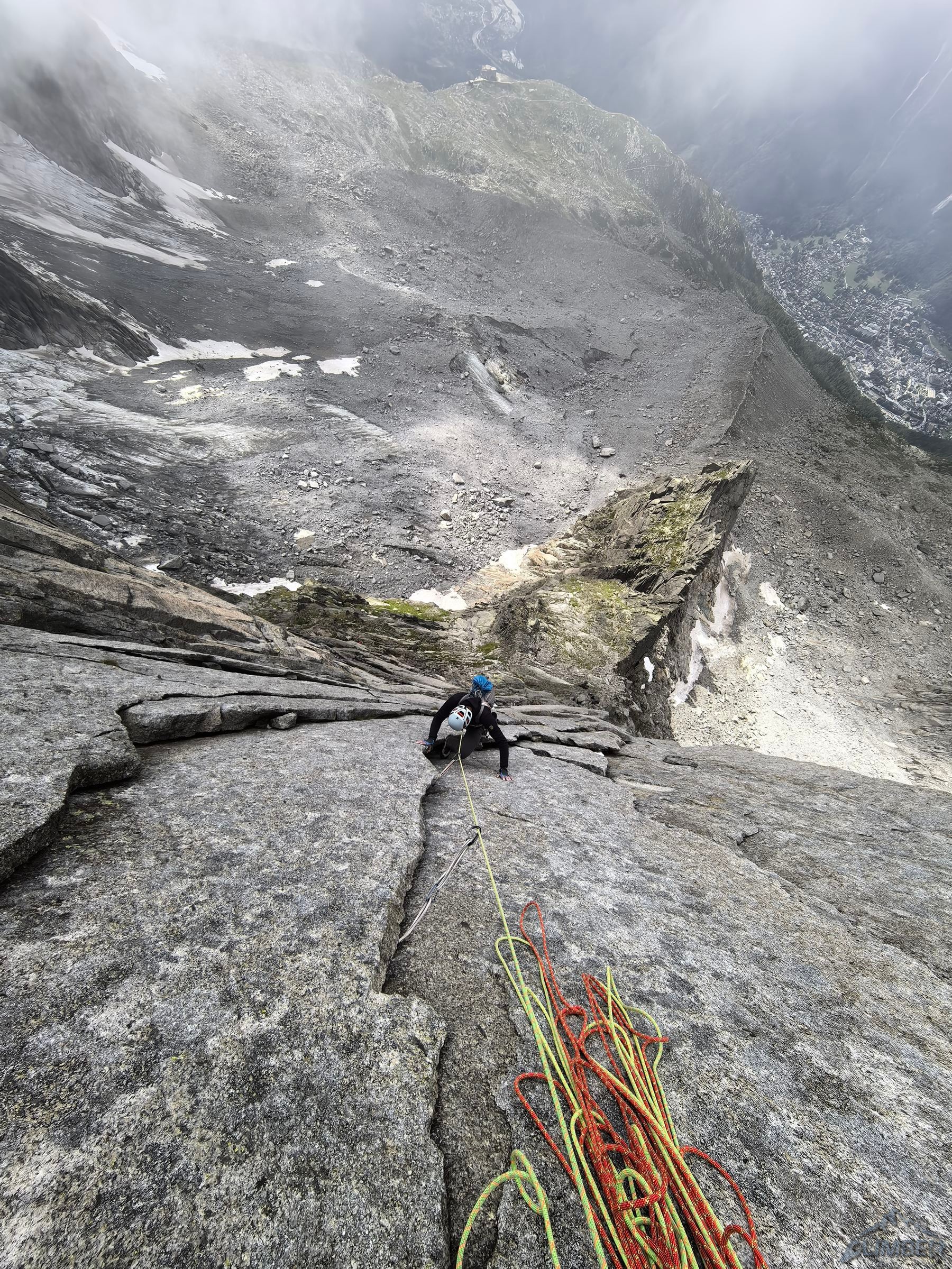 Po zrobieniu dwóch dróg w Ecrins czeka nas trudna decyzja czy zostać na miejscu (pewna pogoda) czy zaryzykować i przenieść się do Chamonix by spróbować któregoś z zaplanowanych przed wyjazdem głównych celów. Prognozy dają szansę więc jedziemy – w środę po dojściu pod Aiguille Peigne okazuje się niestety, że wszystko jest zlane a temperatura oscyluje koło zera. Nie poddajemy się jednak i przenosimy pod Aiguille Blaitiere – trudniejsze drogi nie rokują, płytowa L'eau Rance d'Arabie (6b+ 260m) już bardziej. Wspinanie jest świetne i zajmujące, niestety im wyżej tym gorzej z pogodą – chmury gęstnieją, robi się przeraźliwie zimno i wietrznie. Robimy co prawda kluczowe wyciągi ale drogi nie kończymy, wrzucam jednak opis bo kogoś może zachęcić do przejścia tej pięknej drogi.
