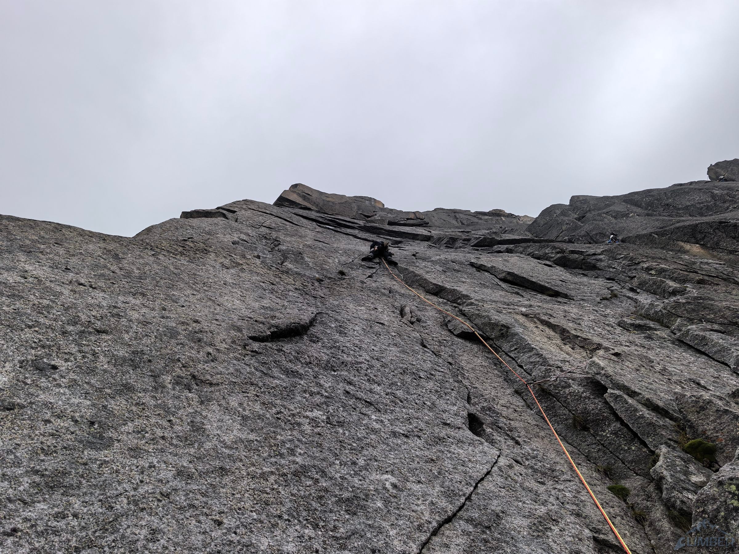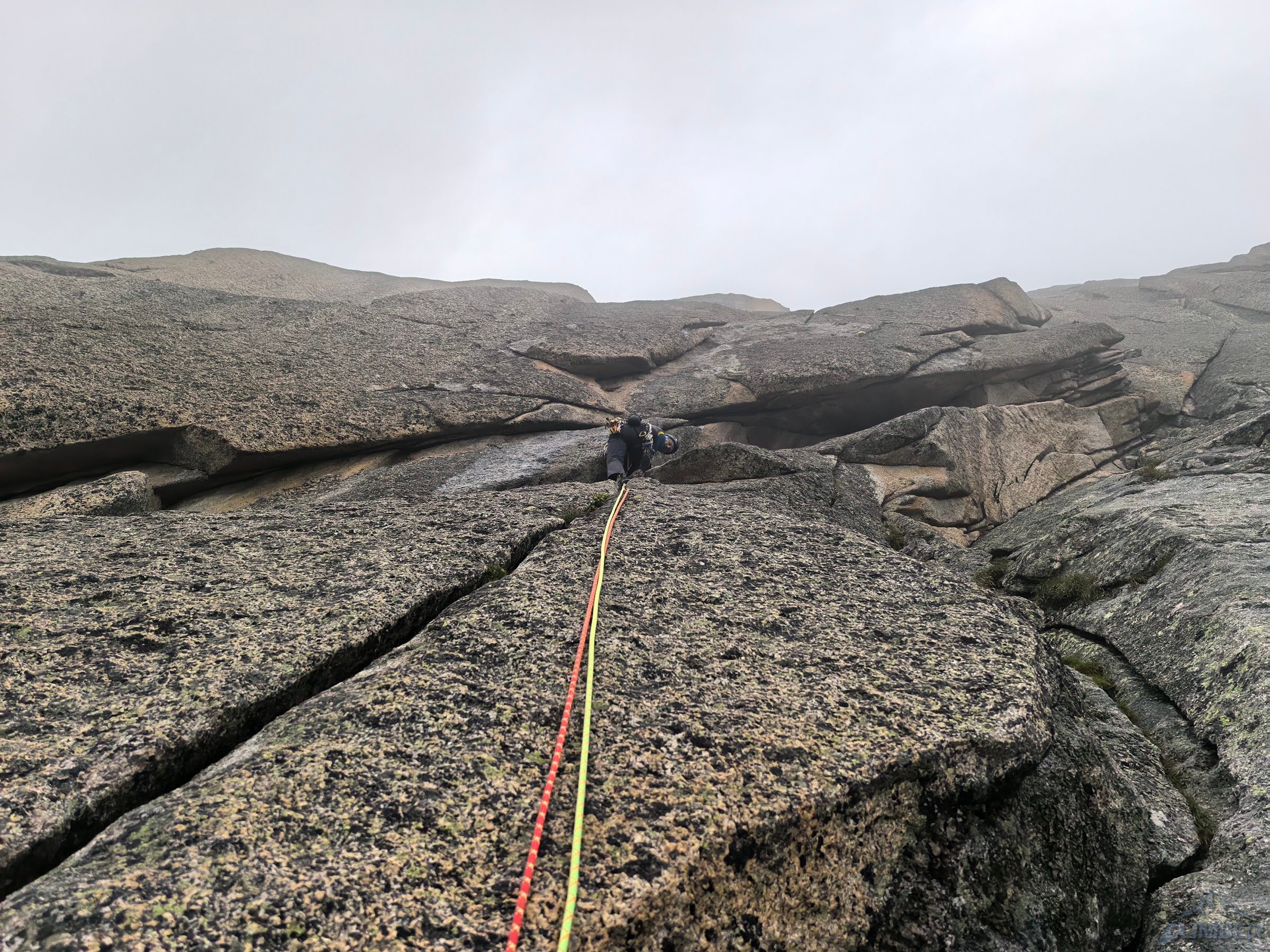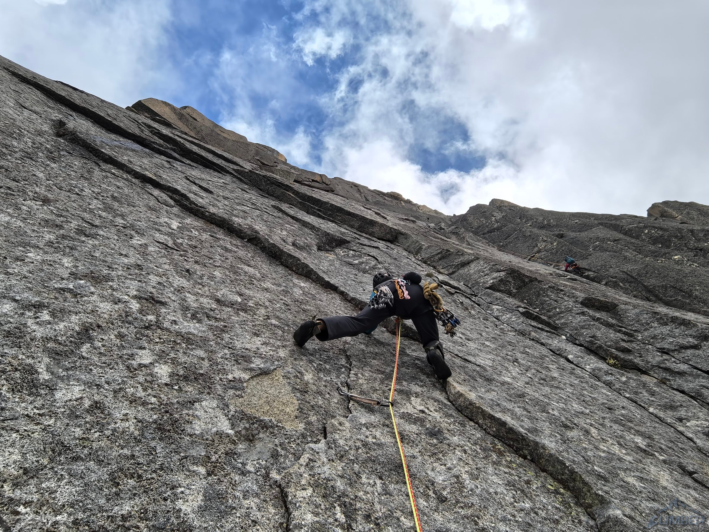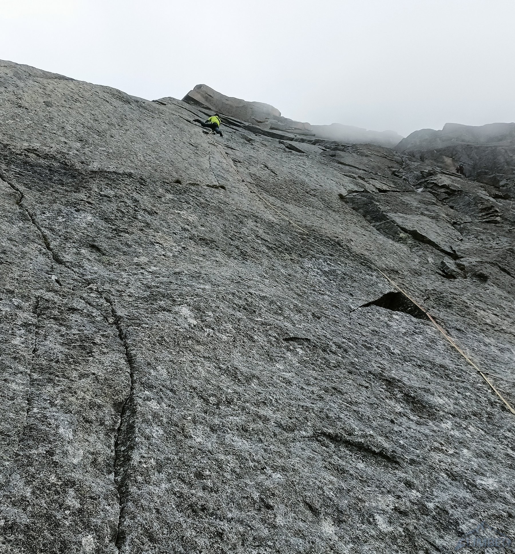 Na czwartym odcinku (5c) prowadzenie przejmuje Bartek – wąskie zacięcie zaraz po prawej (nie idziemy za daleko do widocznego tam spita z innej drogi) prowadzi do trikowego miejsca w płycie, z której wychodzimy na mały taras i kontynuujemy wzdłuż pęknięć do stanowiska. Choć pogoda cały czas się pogarsza, liczymy że dociągniemy do końca. Piąty wyciąg (6b) w tych warunkach okazuje się jednak wymagający – po czujnym starcie czeka dość skomplikowany bulder ubezpieczony spitami. Zamarzając na niewygodnym stanie przyglądamy się patentowaniu Bartka – jest rozgrzany więc zmienianie go wydaje się bez sensu, dopiero jednak przy trzecim podejściu udaje mu się uporać z trudnościami i dostać do ładnej rysy nad okapikiem, która doprowadza do zacięcia i stanowiska w nim.