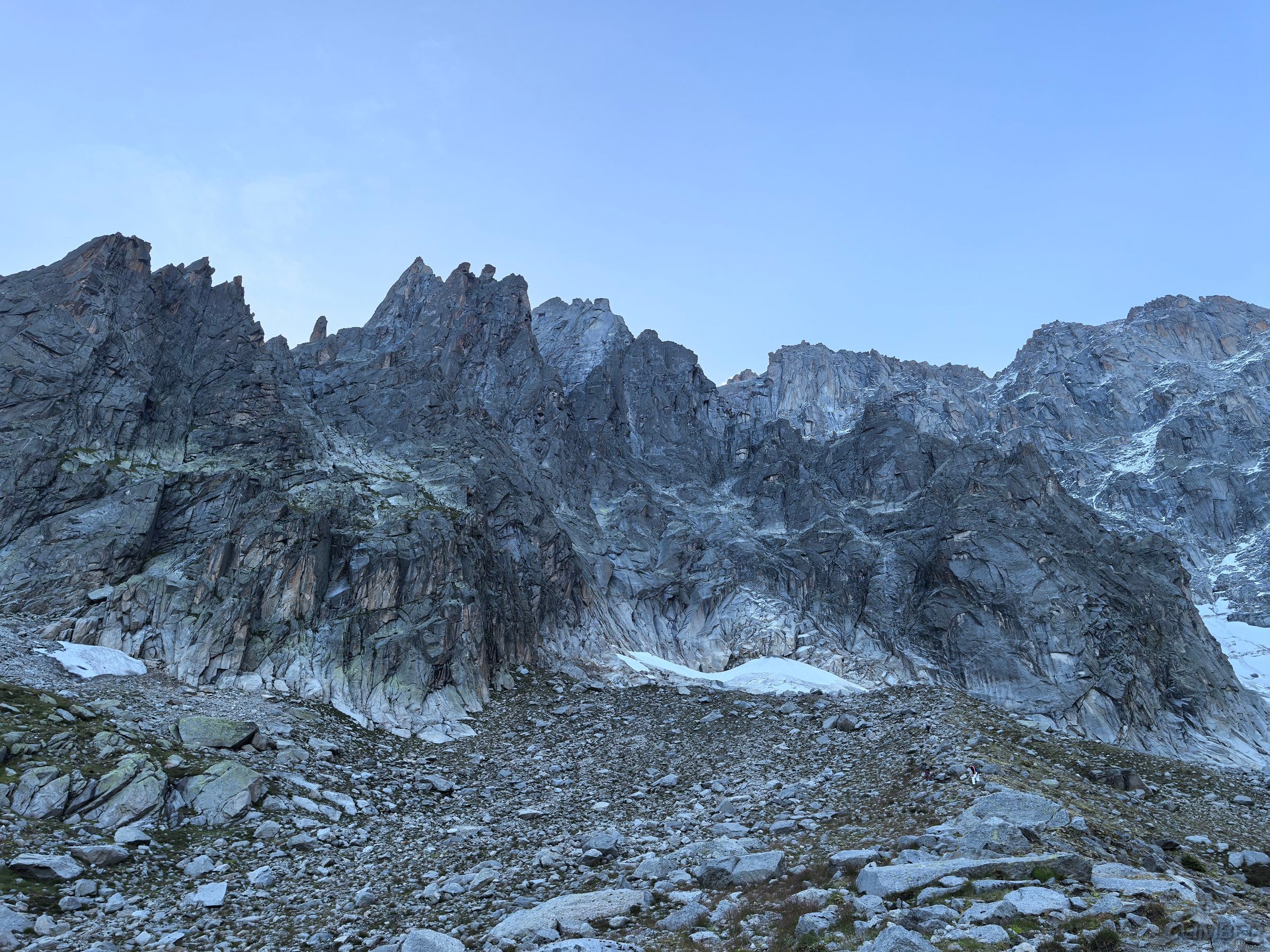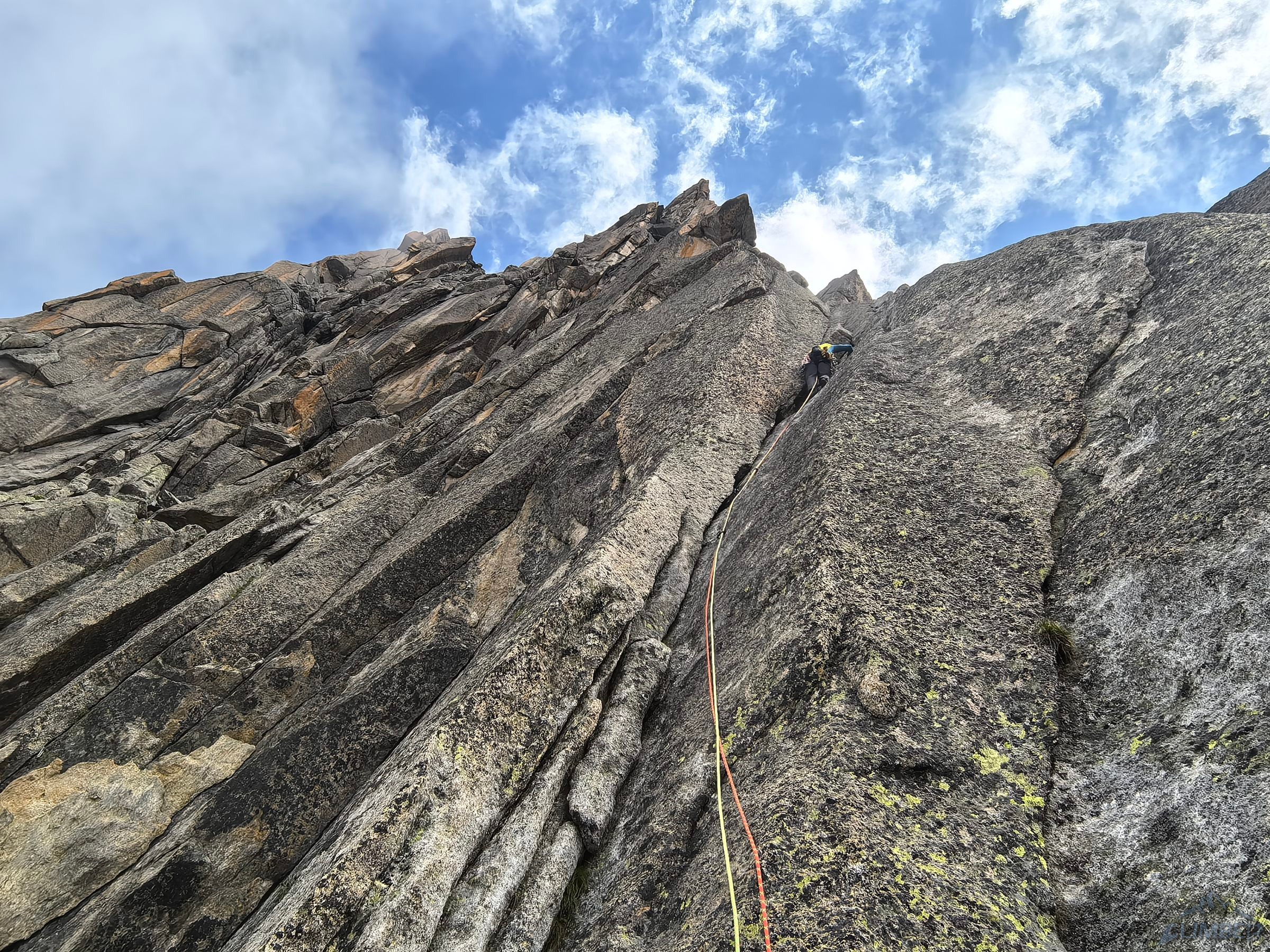 Kolejny dzień naszego pobytu w rejonie Mont Blanc zapowiada się pochmurno i zimno, liczymy że po dwóch dniach bez opadów uda się w końcu wybrać na jedną z zaplanowanych przed wyjazdem dróg. Im wyżej tym ma być gorzej, ponownie pozostaje więc spróbować na Planie – ruszamy pod Czerwony Filar Aiguille Peigne na drogę Maillon Manquant. Piękna ok. 480-metrowa linia (13 wyciągów) Pioli oferuje głównie trudności do 6b+, z jednym krótkim fragmentem 7b – najczęściej pokonywanym A0. Liczymy że szybko uda uporać się z łatwiejszymi wyciągami i kluczowy wyciąg zdążymy spróbować klasycznie przed kolejnym załamaniem pogody zapowiadanym na wieczór.