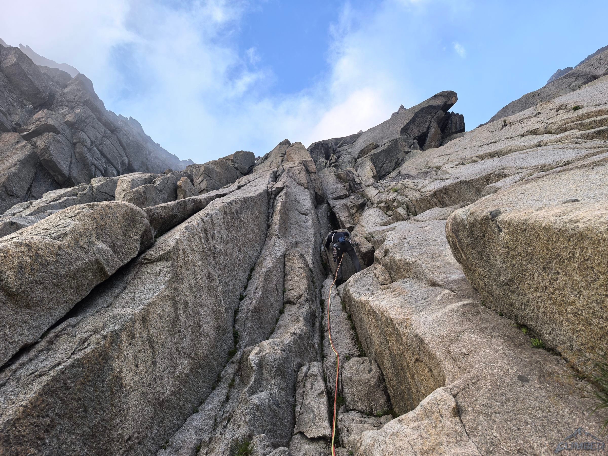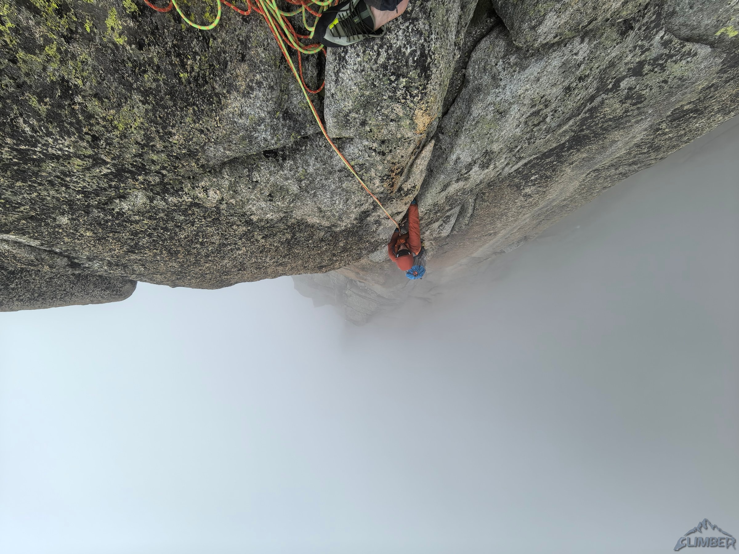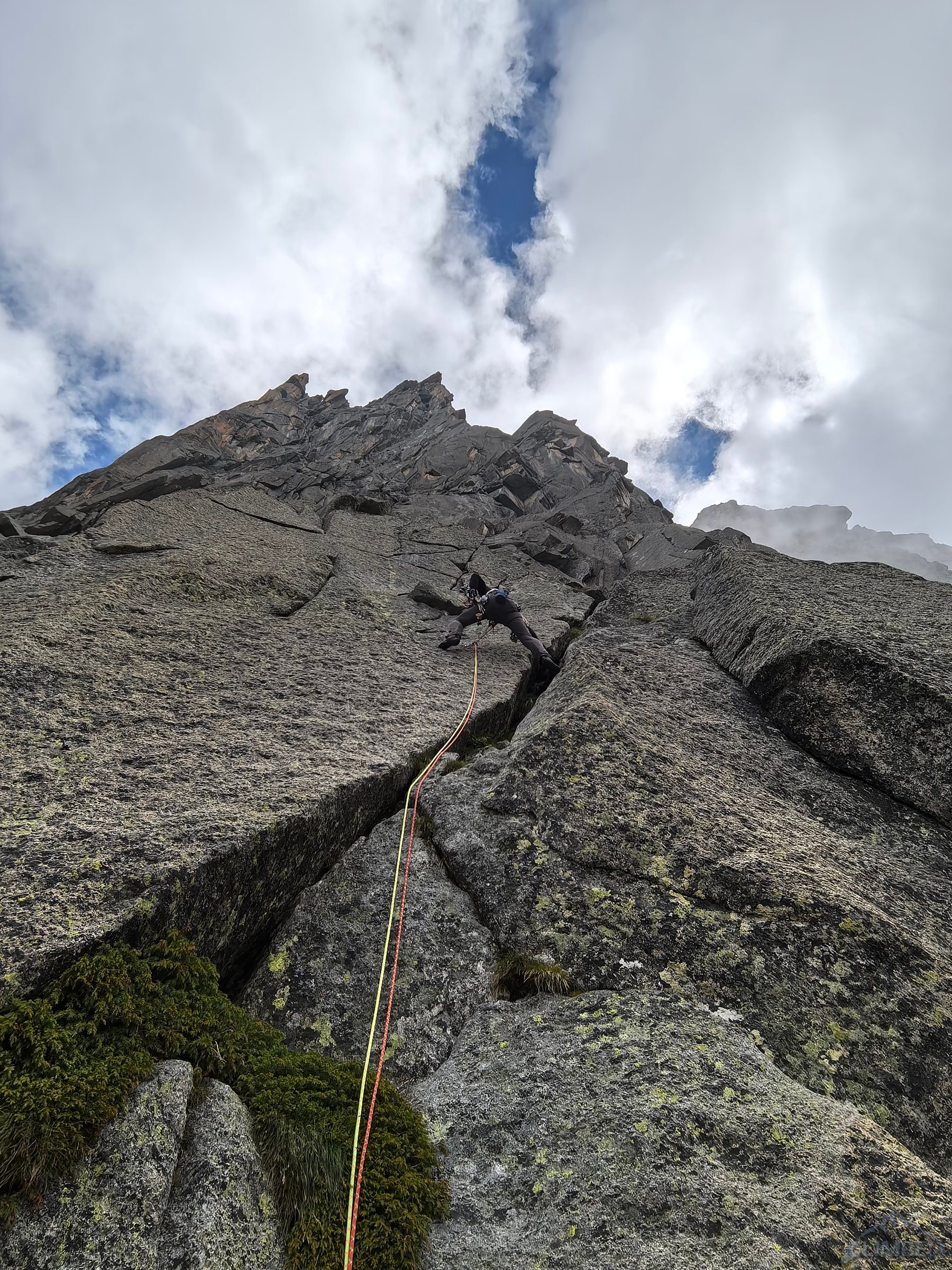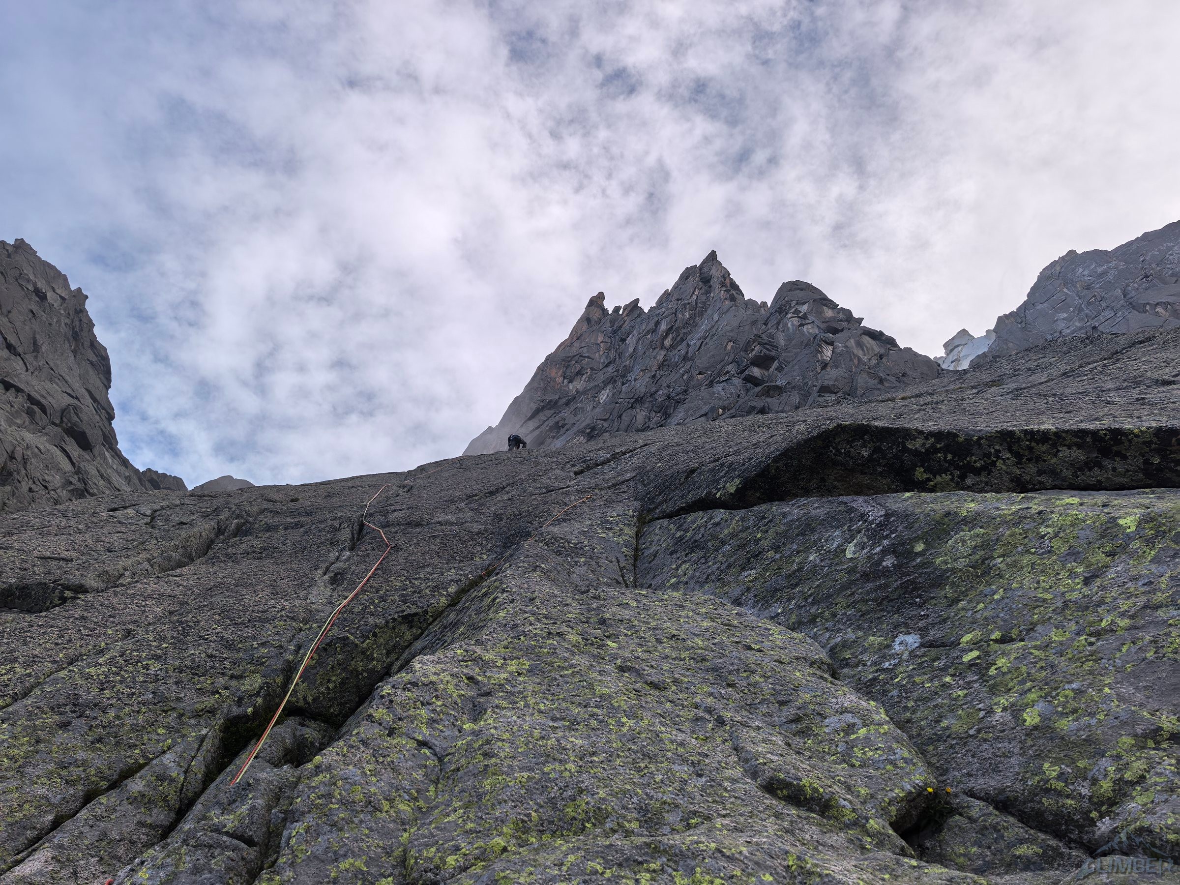 Z tego miejsca zaczyna się dużo ciekawsze i nieco bardziej wymagające wspinanie. Szósty wyciąg (6a+) zaczynamy rysą po prawej, trawersujemy pod okapikiem w lewo i odbijamy wzdłuż spitów rajbungową płytą skośnie w prawo – jedno miejsce to fajny tarciowy bulderek. Kolejny odcinek jest najtrudniejszym w dolnej części drogi (6b+) – idziemy rysami i zacięciami pomiędzy okapy, odbijamy do spita w lewo i pokonujemy wymagający fragment, po którym przewijamy się do zacięcia z wiszącym stanowiskiem. Prowadzenie przejmuje Bartek – czeka na niego przepiękny wyciąg z dilferkami (6a) prowadzący wprost do góry i w lewo na koniec. Kolejne dwa wyciągi (6a) to dalszy ciąg zacięć z rysami na własnej – palce lizać! Tutaj spotykamy się z jedynym oprócz nas zespołem w ścianie tego dnia, Francuzami robiącymi drogę Mazino – mamy wspólny wyciąg, po którym oni idą wprost w okapy a my pod nimi w prawo. Na półce pod górnym spiętrzeniem robimy więc dłuższą przerwę i szykuję się do prowadzenia trudności – pogoda niestety pogarsza się z minuty na minutę, nie będzie więc za wiele czasu na powtórki i może skończyć się przejściem za 6b+ A0.