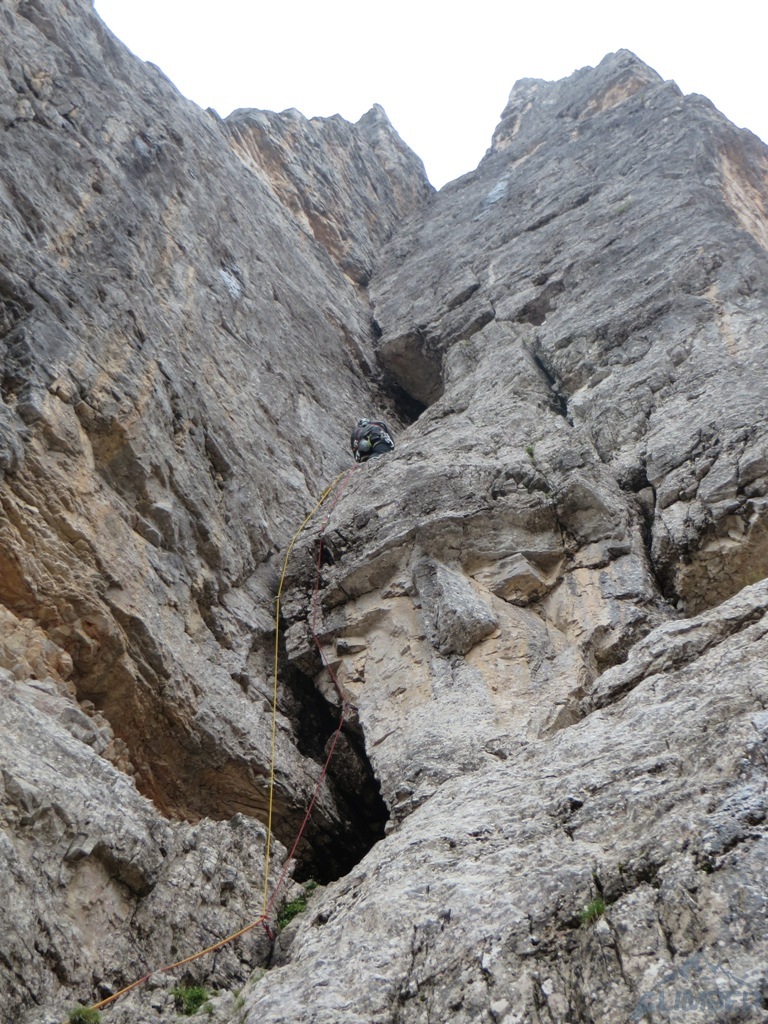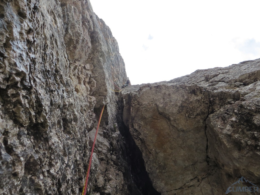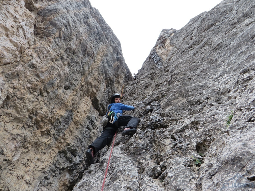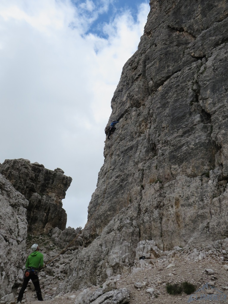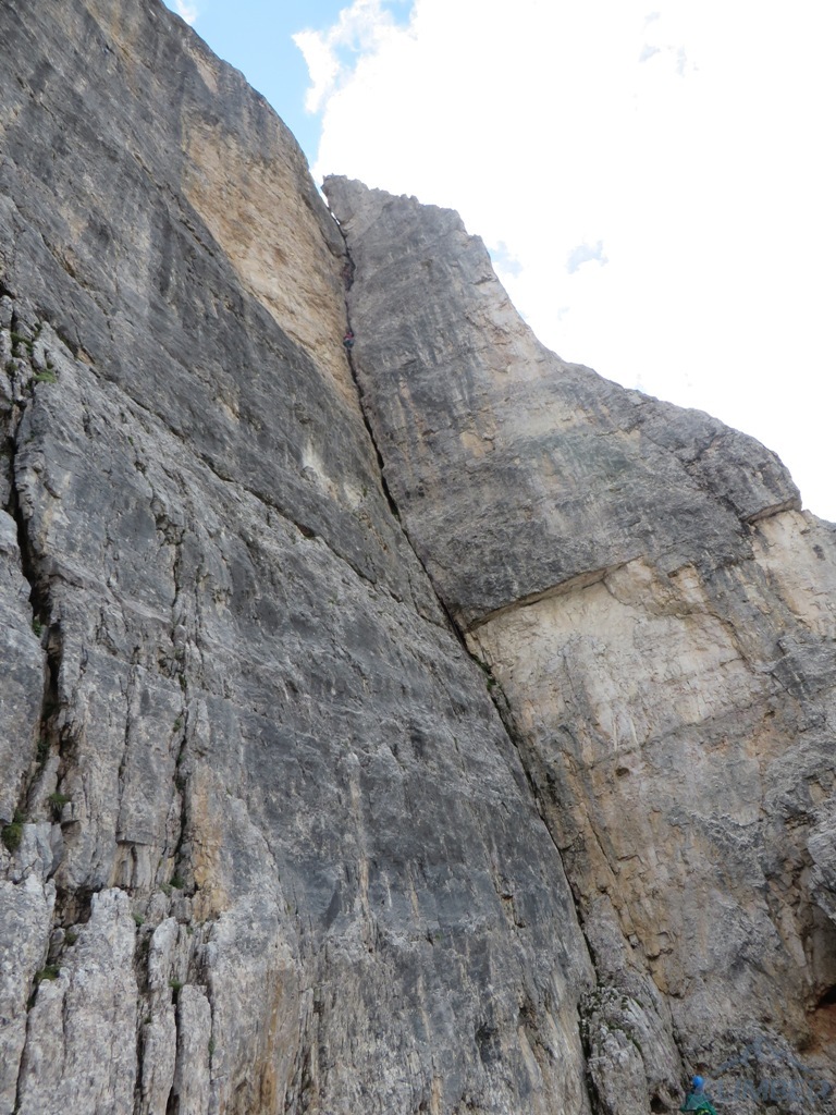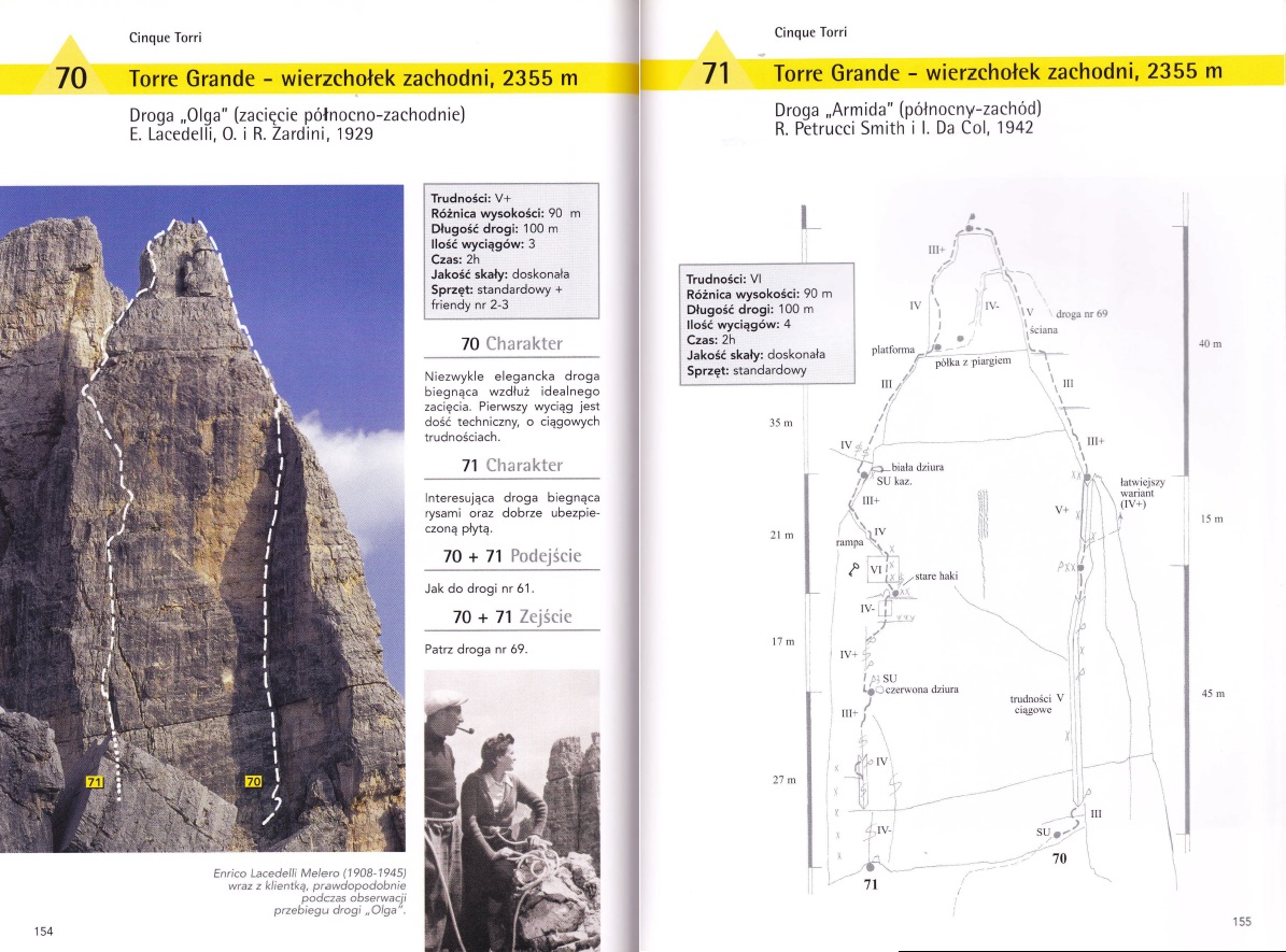 Krótka relacja z Zacięcia Północnego (IV+) na Torre Romana i Armidy (VI) na Torre Grande w masywie Cinque Torri, podczas obozu KW BB w Dolomitach. Po dwóch deszczowych dniach pogoda nareszcie się poprawia, wszyscy obozowicze ruszają więc do działania - jutro ponownie ma lać... Wraz z Jurasem i Bartkiem na cel obieramy Zacięcie Północne czyli tzw. „Wiewiórki”, pod którym byliśmy już dwa dni wcześniej. Droga nie jest taka przyjemna na jaką wygląda z dołu – wspinamy się bowiem bardziej kominem niż zacięciem, trzeba się przewijać to w prawo to w lewo. Mimo iż droga jest łatwa, wrażenie robi na nas lufa oraz brak półek na resty, trzeba się cały czas wspinać. Ponieważ to nasz pierwszy pobyt w Dolomitach, nie wiemy jeszcze, że tak jest tutaj na większości dróg 😊.