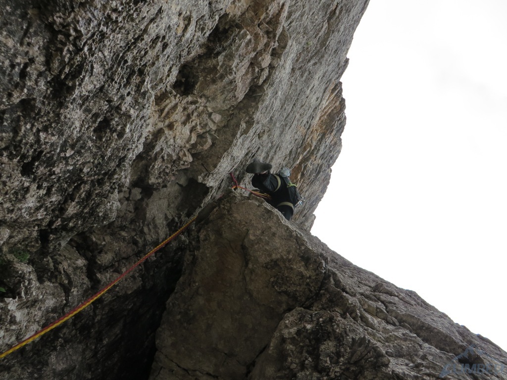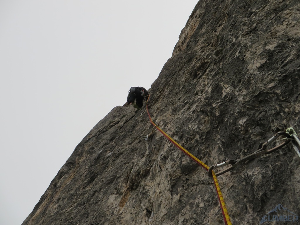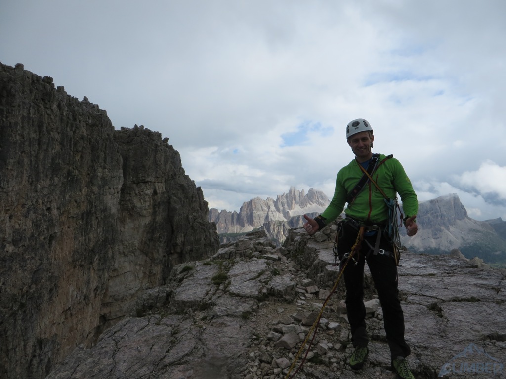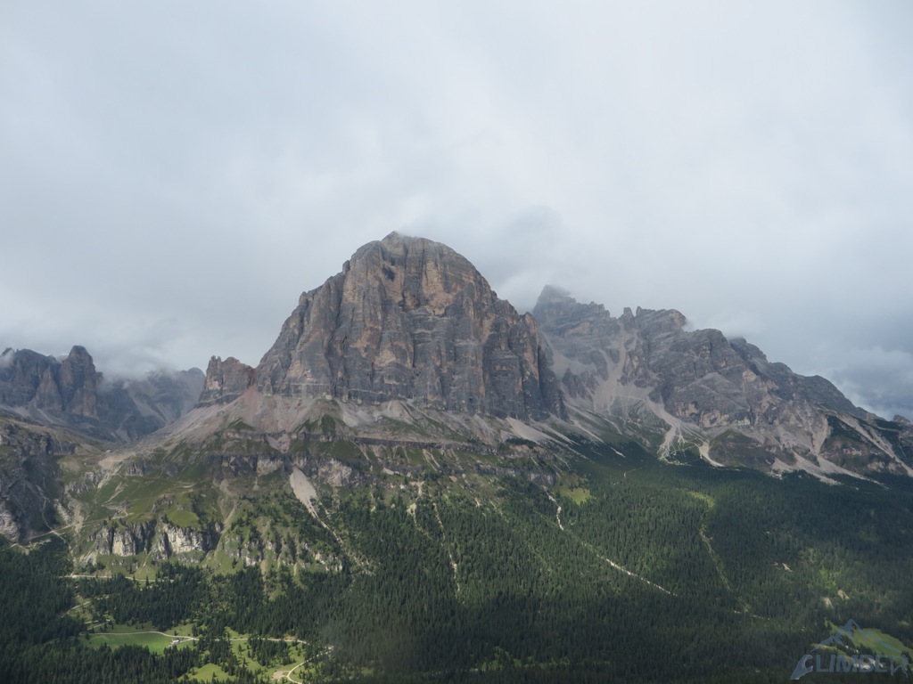 Czując niedosyt i widząc, iż deszcz powinien pojawić się dopiero za 1-2 godziny podchodzimy pod Armidę (VI), którą wcześniej robili Mariusz z Pawłem - wspinanie głównie na własnej z obitą kluczową płytką, która jest bardzo wytężająca. Krótka dyskusja, napływ spręża i za chwilę zaczynamy się wspinać, już tylko w dwójkę z Jurasem. Po chwili na dole zbierają się pozostałe zespoły, które już pokończyły drogi i mają niezły widok na nasze poczynania 😉. Dzięki temu mam pamiątkę w postaci fotki Mrocznego, do którego relacji z tego dnia odsyłam - TUTAJ. Niestety pogoda nie wytrzymała i ostatni, na szczęście już łatwy wyciąg, robiliśmy w deszczu. Na szczycie na chwilę odpuściło więc mogliśmy podziwiać widoki, m.in. na sąsiednie Averau, niesamowite turnie Croda da Lago i majestatyczną Tofanę di Rozes. Później pozostaje nam powrót na camp i rozpoczęcie imprezy bo wiadomo było iż kolejnego dnia znowu ma lać i można zapomnieć o jakimkolwiek poważnym działaniu…