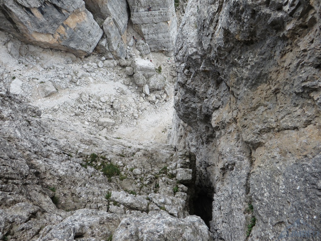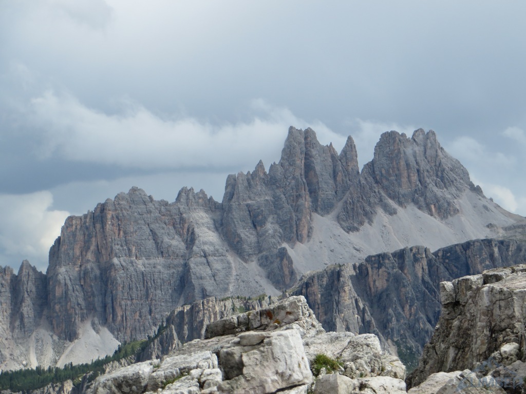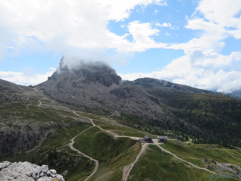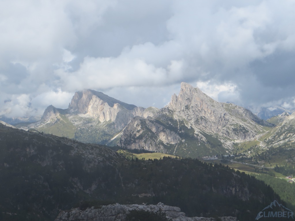 Czując niedosyt i widząc, iż deszcz powinien pojawić się dopiero za 1-2 godziny podchodzimy pod Armidę (VI), którą wcześniej robili Mariusz z Pawłem - wspinanie głównie na własnej z obitą kluczową płytką, która jest bardzo wytężająca. Krótka dyskusja, napływ spręża i za chwilę zaczynamy się wspinać, już tylko w dwójkę z Jurasem. Po chwili na dole zbierają się pozostałe zespoły, które już pokończyły drogi i mają niezły widok na nasze poczynania 😉. Dzięki temu mam pamiątkę w postaci fotki Mrocznego, do którego relacji z tego dnia odsyłam - TUTAJ. Niestety pogoda nie wytrzymała i ostatni, na szczęście już łatwy wyciąg, robiliśmy w deszczu. Na szczycie na chwilę odpuściło więc mogliśmy podziwiać widoki, m.in. na sąsiednie Averau, niesamowite turnie Croda da Lago i majestatyczną Tofanę di Rozes. Później pozostaje nam powrót na camp i rozpoczęcie imprezy bo wiadomo było iż kolejnego dnia znowu ma lać i można zapomnieć o jakimkolwiek poważnym działaniu…