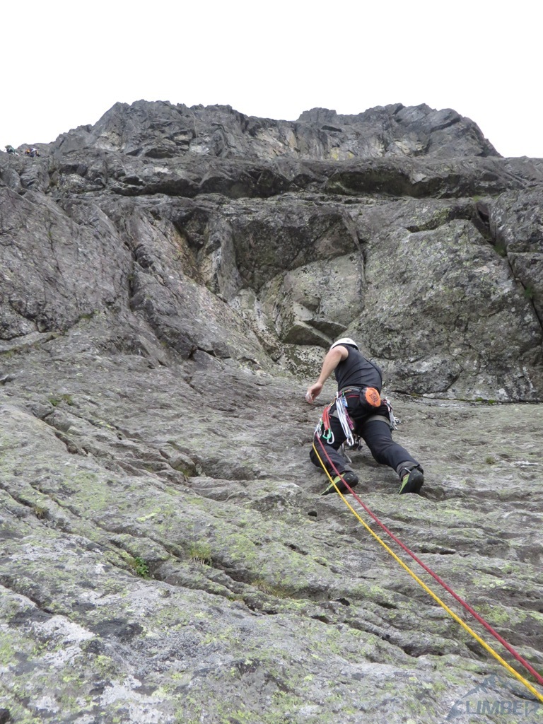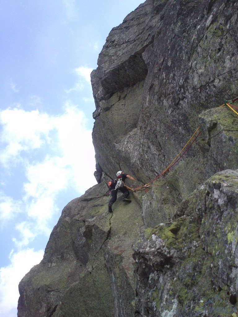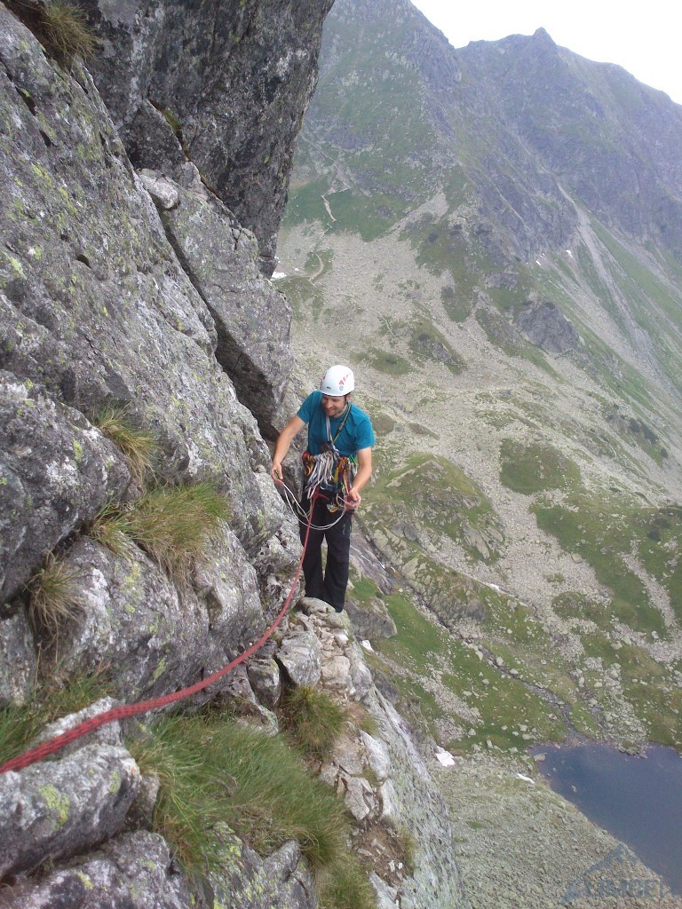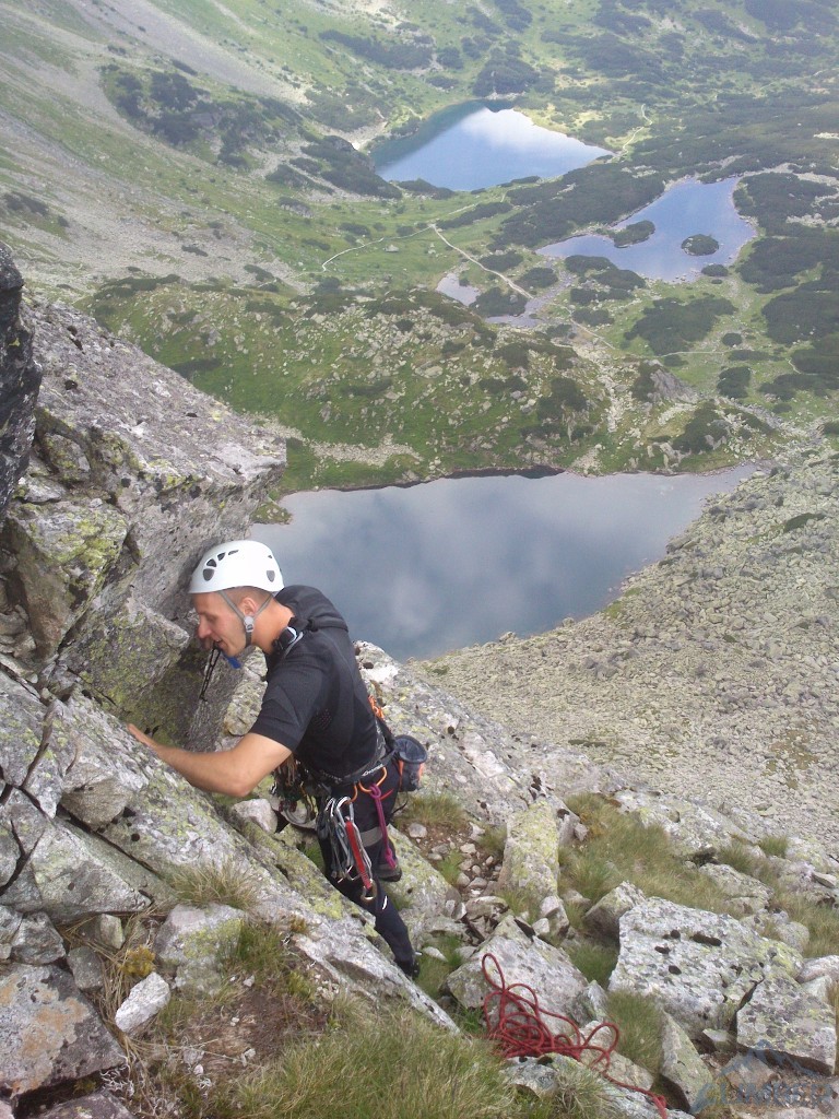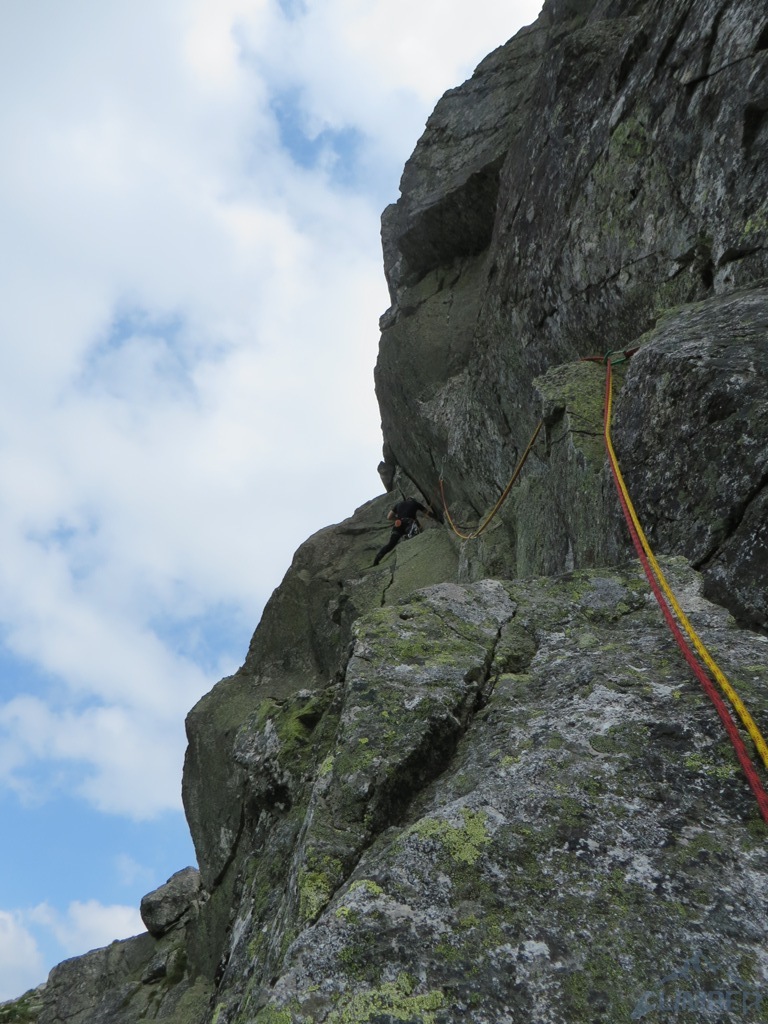 W końcu nadszedł słoneczny weekend w Tatrach więc tatrzańskie ściany zostały oblężone przez spragnionych wrażeń wspinaczy 😉. Ponieważ jesteśmy w trójkę i nie mamy ochoty na kilkugodzinne podejście w upale, wybieramy ładne drogi na nieodległym Kościelcu. Na pierwszy rzut idzie znana droga Byczkowskiego (V+), która okazuje się całkiem atrakcyjna i to nie tylko z powodu dośc unikalnej płytowej załupy na przedostatnim wyciągu. Po zjeździe pod ścianę wchodzimy w drogę obok – obite (poza drugim wyciągiem) Lobby Instruktorskie (VII-, oryginalnie wycenione na VII+). Pierwszy i trzeci wyciąg dają dużo frajdy z „estetycznego” wspinania, drugi trochę straszy, najtrudniejszego czwartego nie udało się niestety spróbować ze względu na brak spręża i korek na drodze. Finalnie całą drogę udało przejść się kilka lat później (RELACJA).